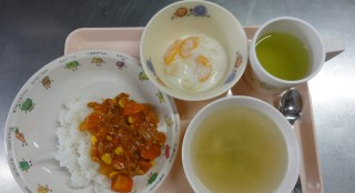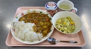 カレー風味のトマトライス コンソメスープ ヨーグルトあえせんべい リンゴジュース