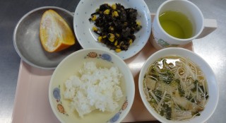ごはん そうめん汁 ひじきの炒め煮 いよかんきなこケーキ 牛乳