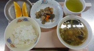 ごはん とろみ汁 炒り鶏 オレンジせんべい 野菜ジュース
