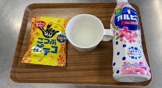 ごはん 春雨スープ マーボー豆腐 オレンジポテトスナック カルピス