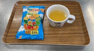 おやつ 沢煮椀 鶏のから揚げ 付け合せスナック菓子 リンゴジュース