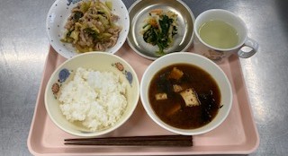 ごはん みそ汁 とんちゃん焼き お浸し飲むヨーグルト ビスケット