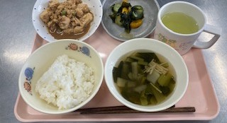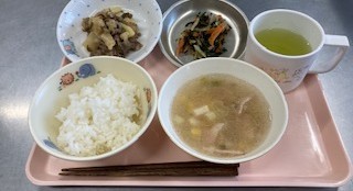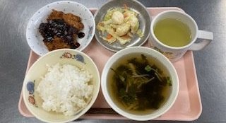 ごはん すまし汁 豆腐の肉味噌かけ 酢の物牛乳 ビスケット バナナ