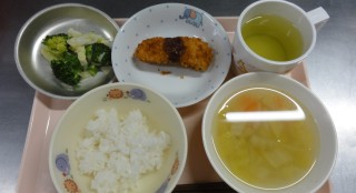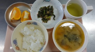 ごはん 石狩鍋 菜の花のおかかあえ ぽんかん豆乳ウエハース 牛乳