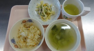 五目ごはん みそ汁 ごまあえ牛乳 揚げたこ焼き