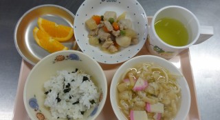 本日は献立のメニューを以下に変更しました わかめごはん 旨煮 しのだうどん オレンジせんべい 牛乳