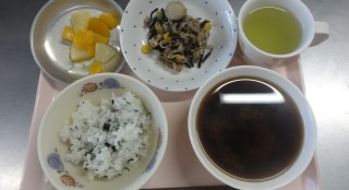 若菜ごはん みそ汁 ひじきと切り干し大根 フルーツカクテル小倉ケーキ 牛乳*本日は雪の為、配送が届かず臨時の給食メニュ...