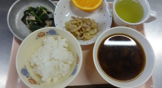 ごはん 豚肉のしょうが炒め みそ汁 ほうれん草サラダ オレンジみたらし団子 牛乳*給食のメニューの変更がありました。