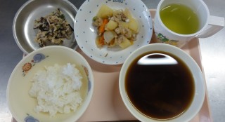 ごはん 肉じゃが みそ汁 切干大根とひじきのサラダかぼちゃパイ 牛乳