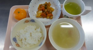 ごはん キャベツスープ 鶏肉のケチャップ煮 みかんソフトせん 野菜ジュース