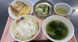 ごはん 中華スープ わかさぎのかりん揚げとポテトフライ 付け合せプリン 牛乳 アレルギー用はりんごゼリー