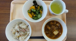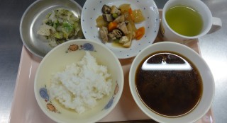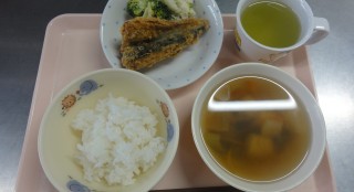 ごはん さばの竜田揚げ のっぺい汁 付け合せえびせん リンゴジュース