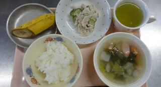 ごはん ポトフ レンコンサラダ ばななビスケット 牛乳