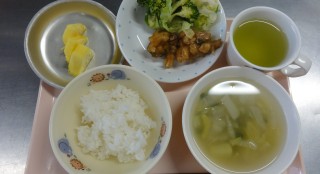 ごはん 白菜スープ 油淋鶏 パイナップル 付け合せビスケット 牛乳