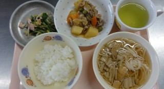 ごはん そうめん汁 肉じゃが ほうれん草サラダコーンパン 牛乳