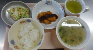 ごはん 大豆と豚肉のケチャップ煮 コンソメスープ みかんソフトせん 飲むヨーグルト