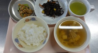 ごはん ひじきの炒め煮 すまし汁 切干大根の納豆あえももゼリー