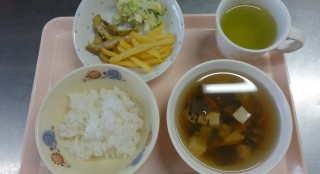 ごはん けんちん汁 付け合せ わかさぎのカレー揚げとポテトフライさつまいもパイ 牛乳