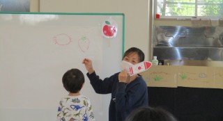 今月は保育士がパネルシアターやペープサートを披露しました。『こぶたがまちを』のパネルシアター&手遊びでは、保育士の真似を...