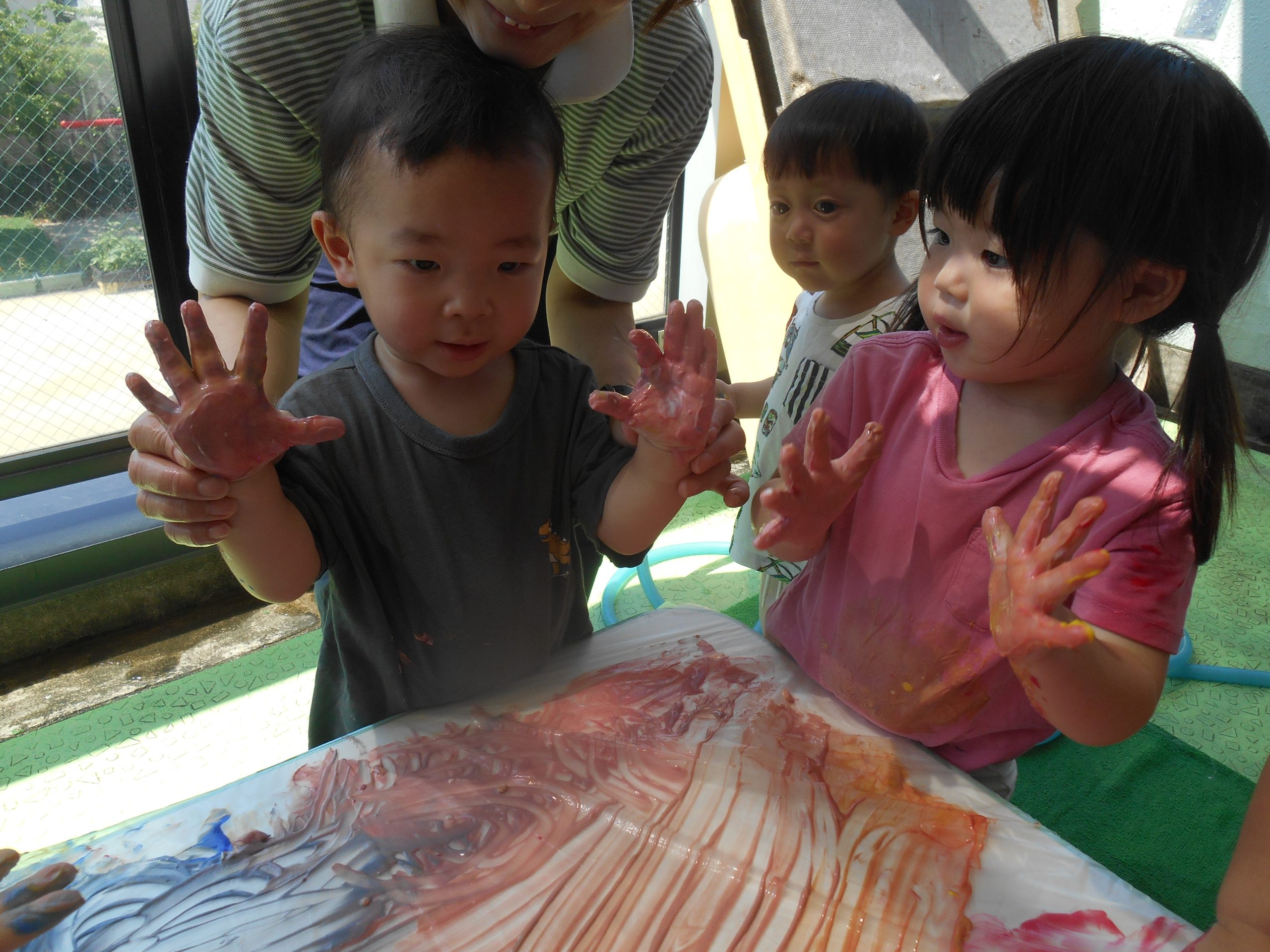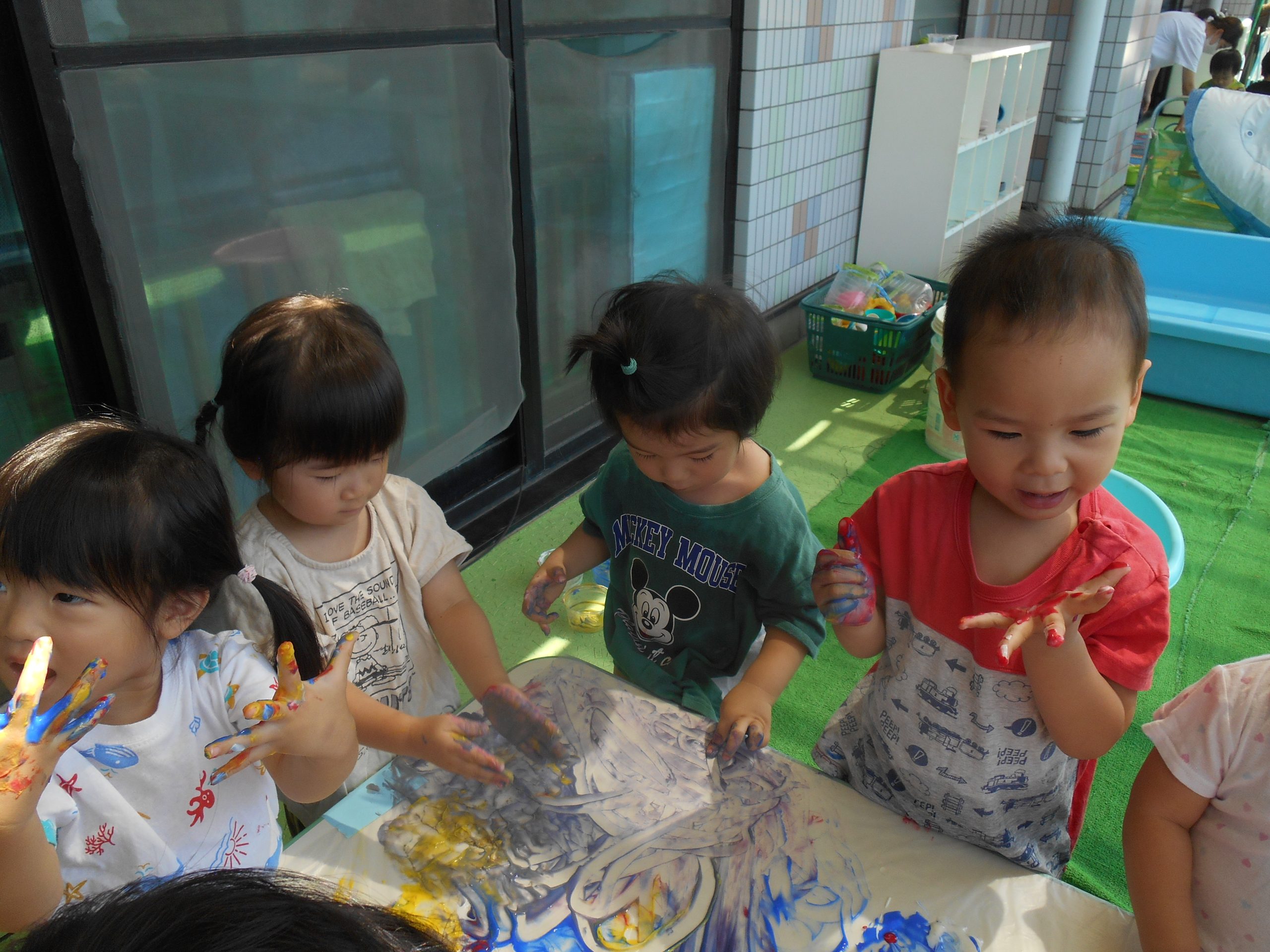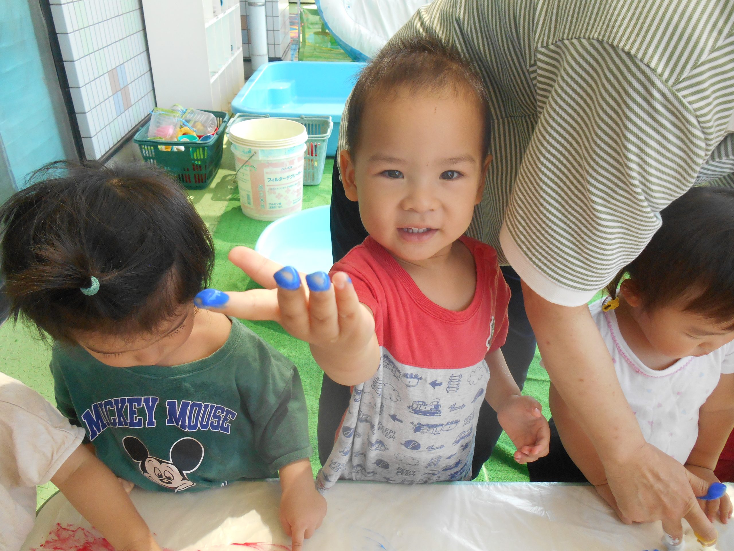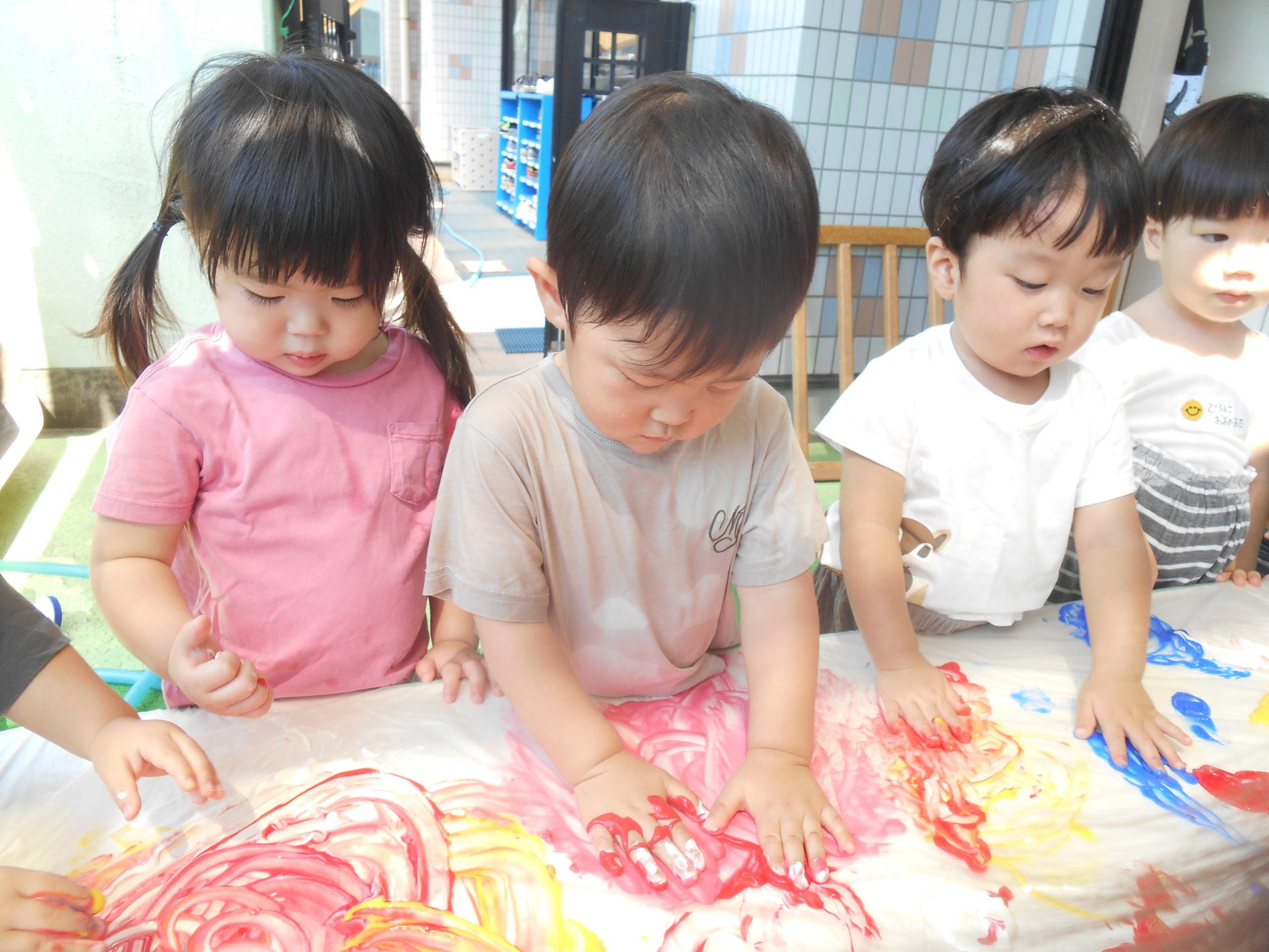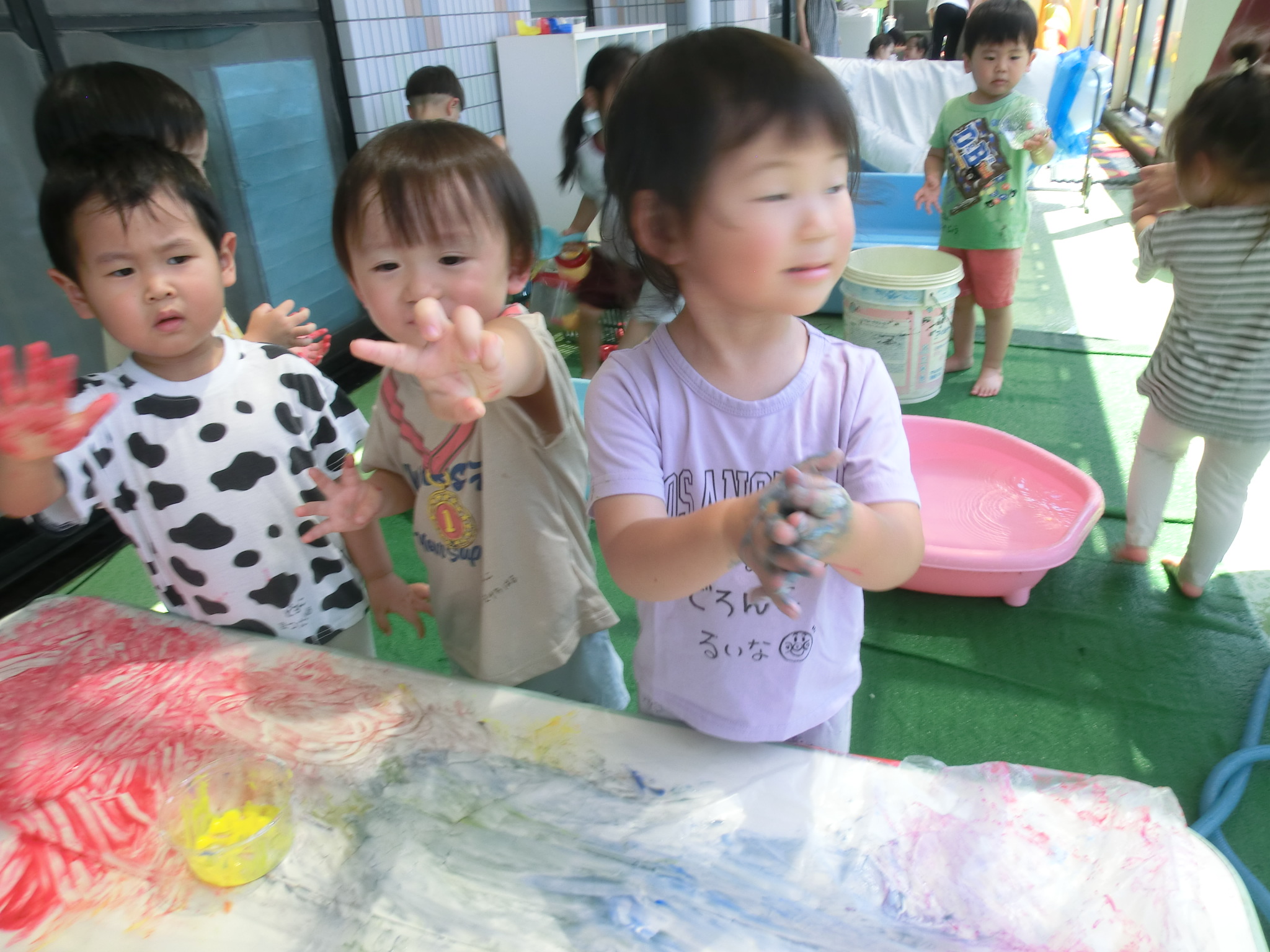 身体に付けて感触を楽しんだり、色を混ぜて色をつくったり・・・いろんな遊び方を楽しむ子どもたちでした。