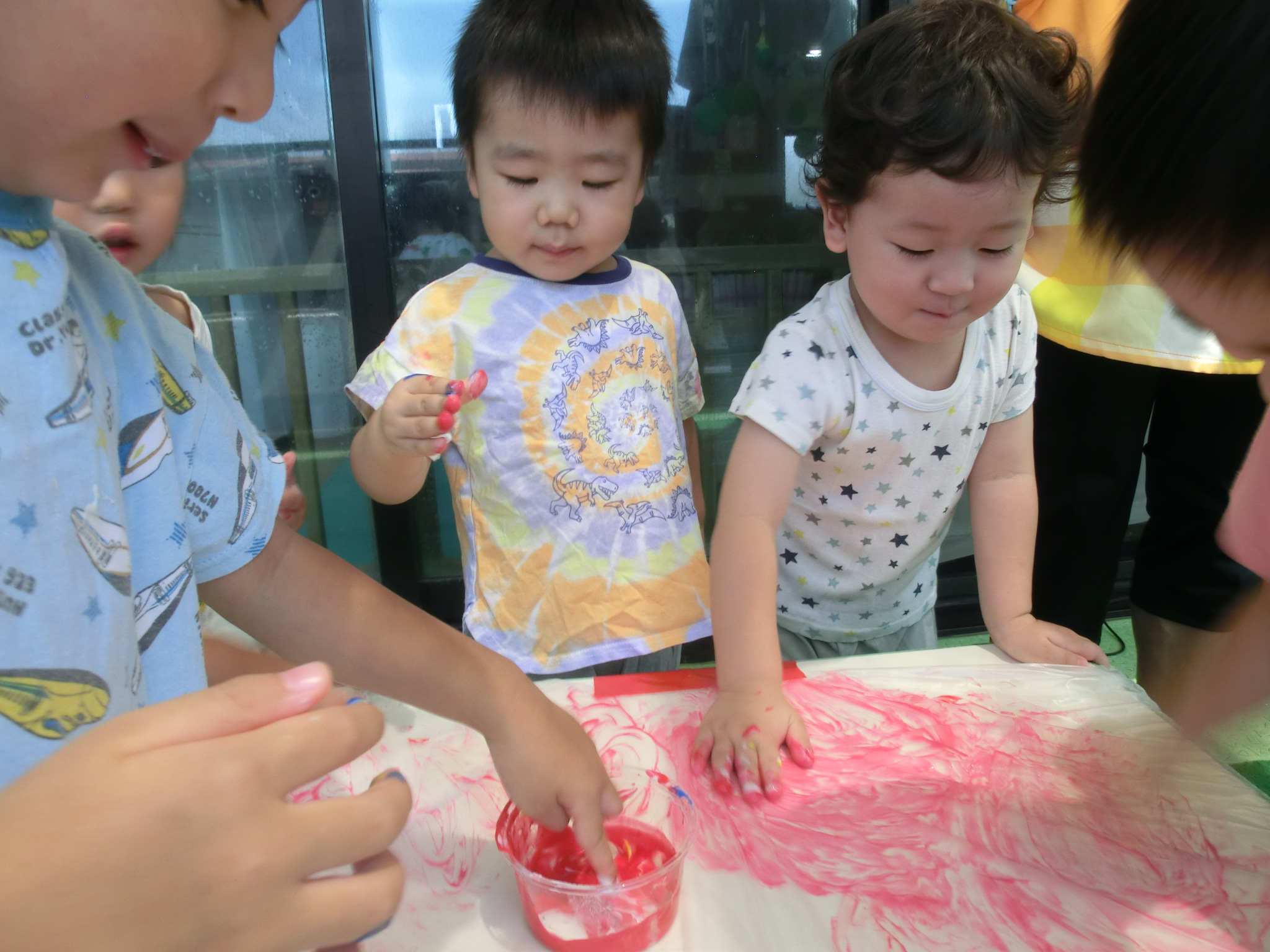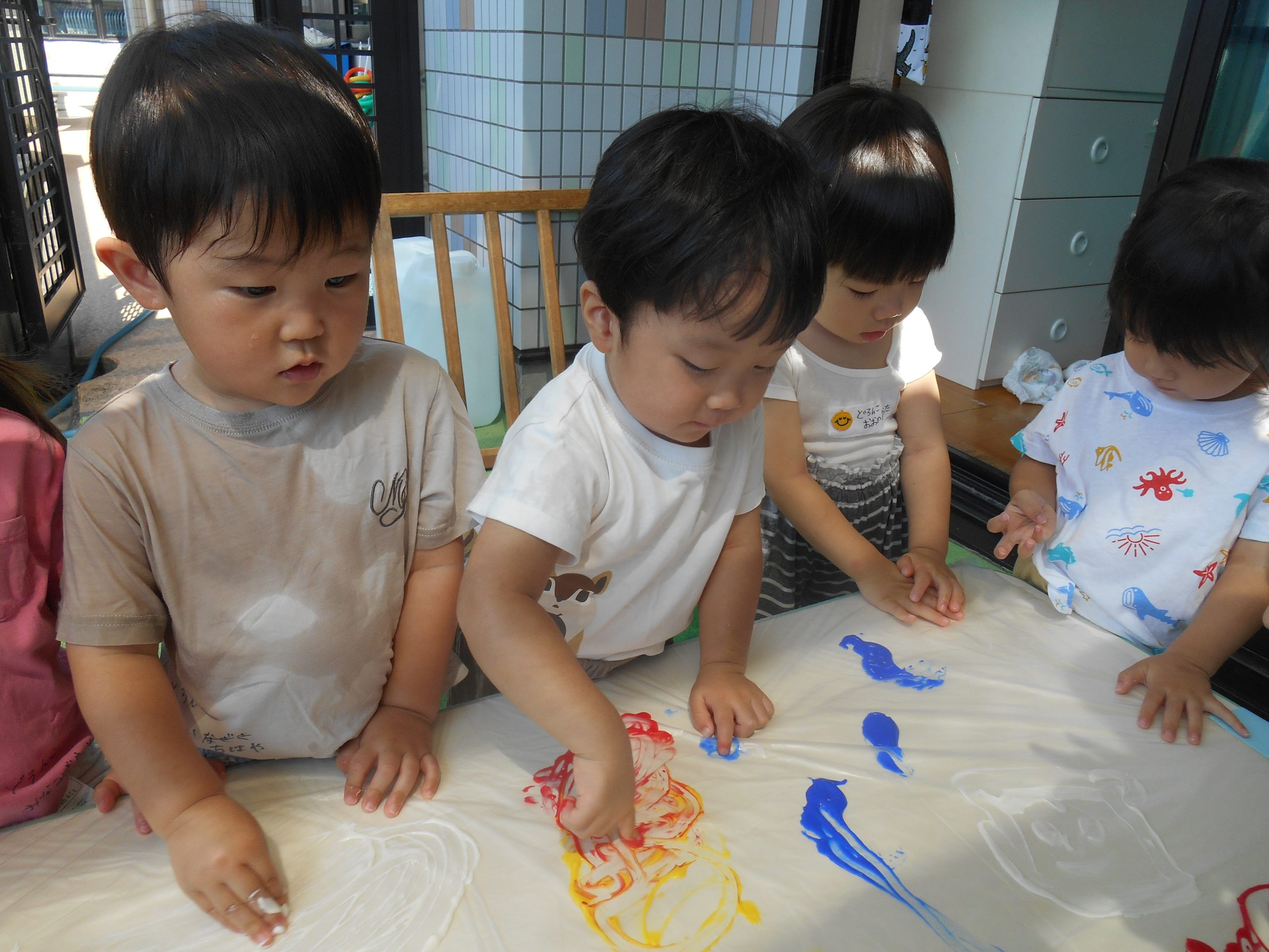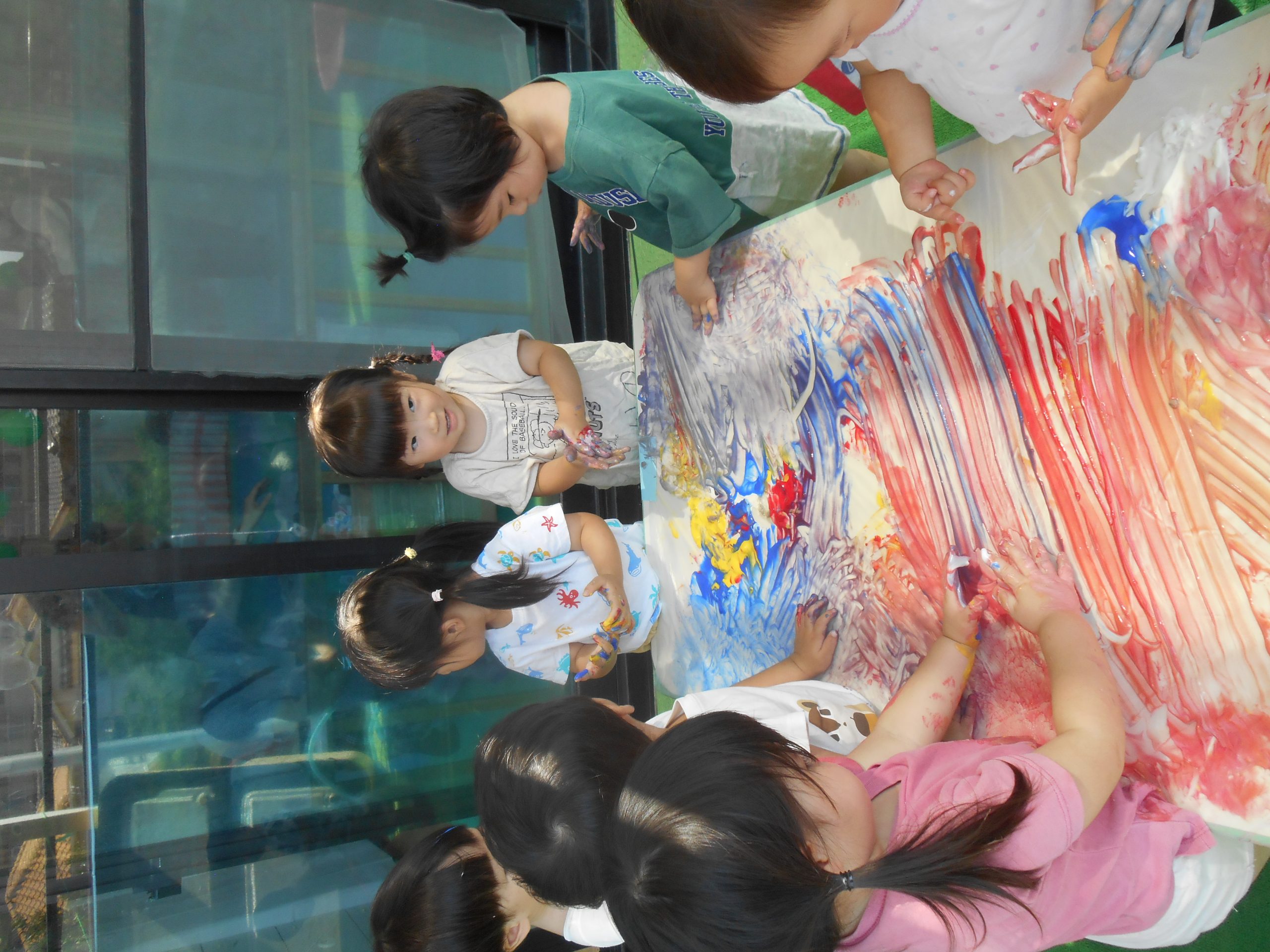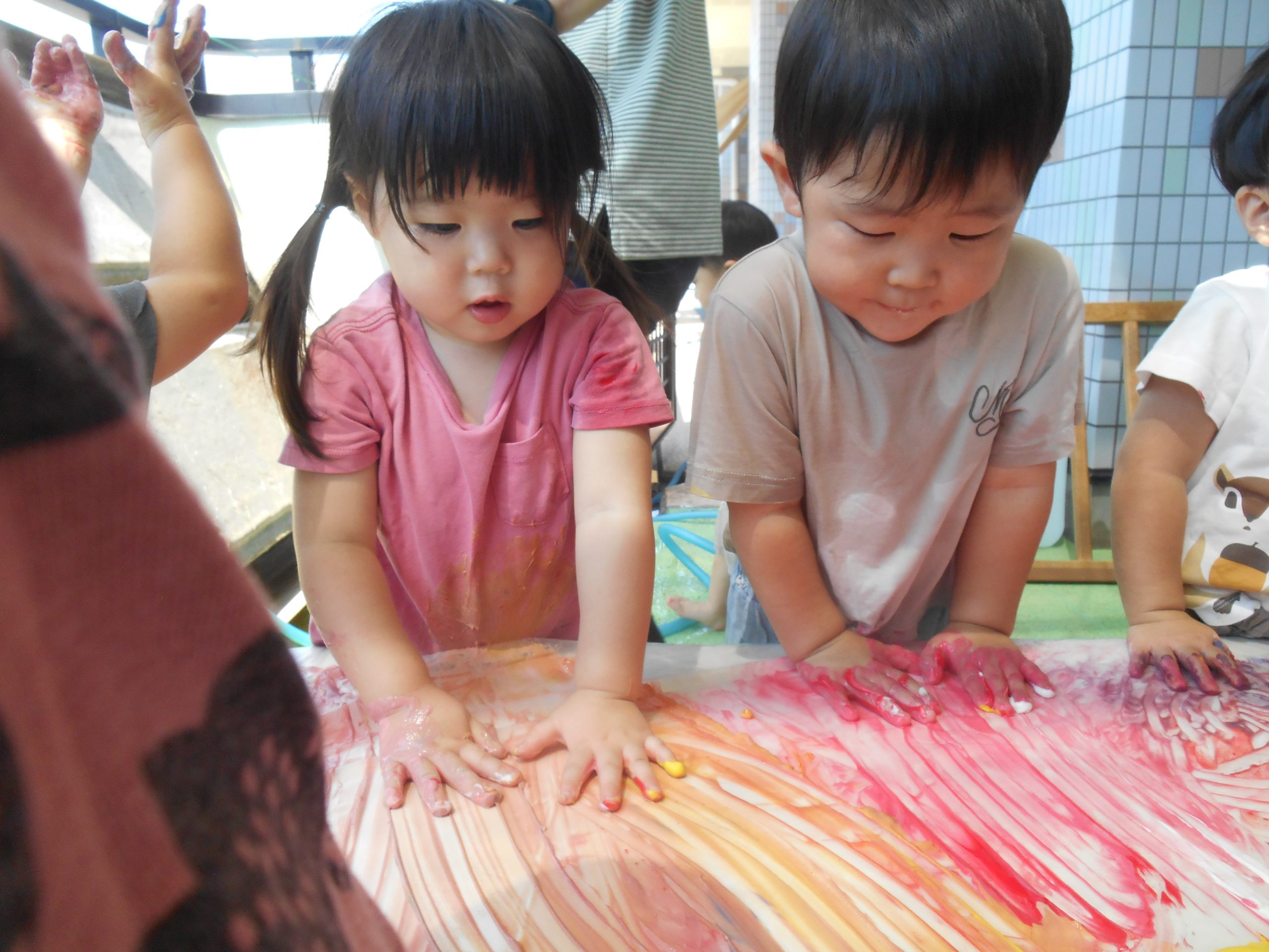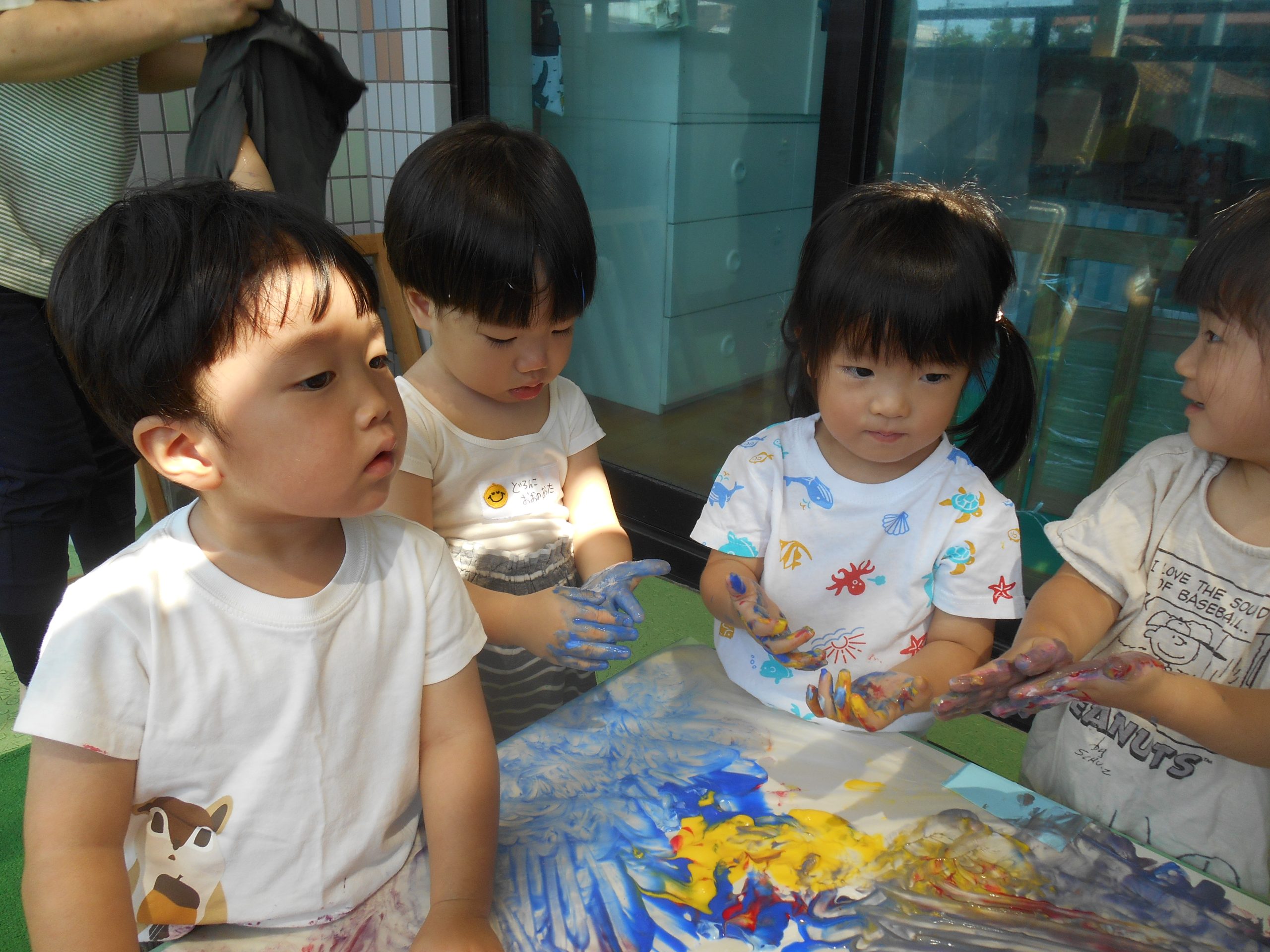身体に付けて感触を楽しんだり、色を混ぜて色をつくったり・・・いろんな遊び方を楽しむ子どもたちでした。