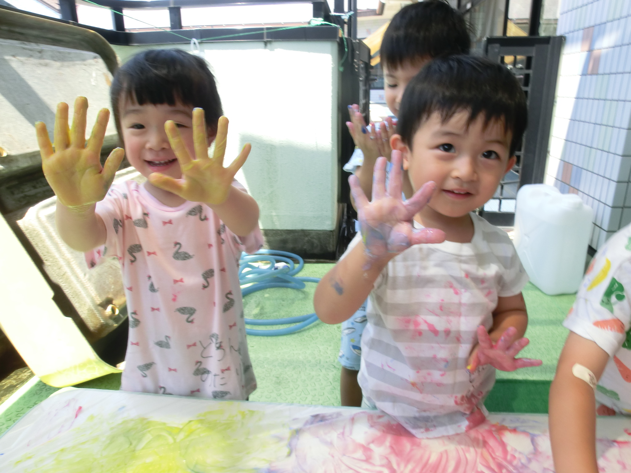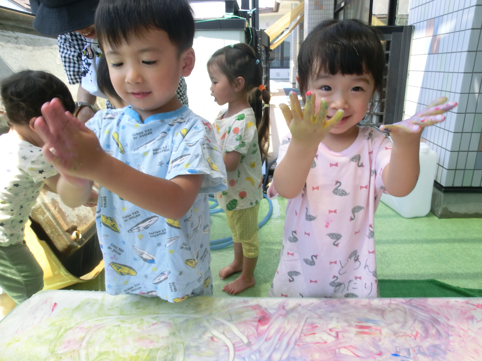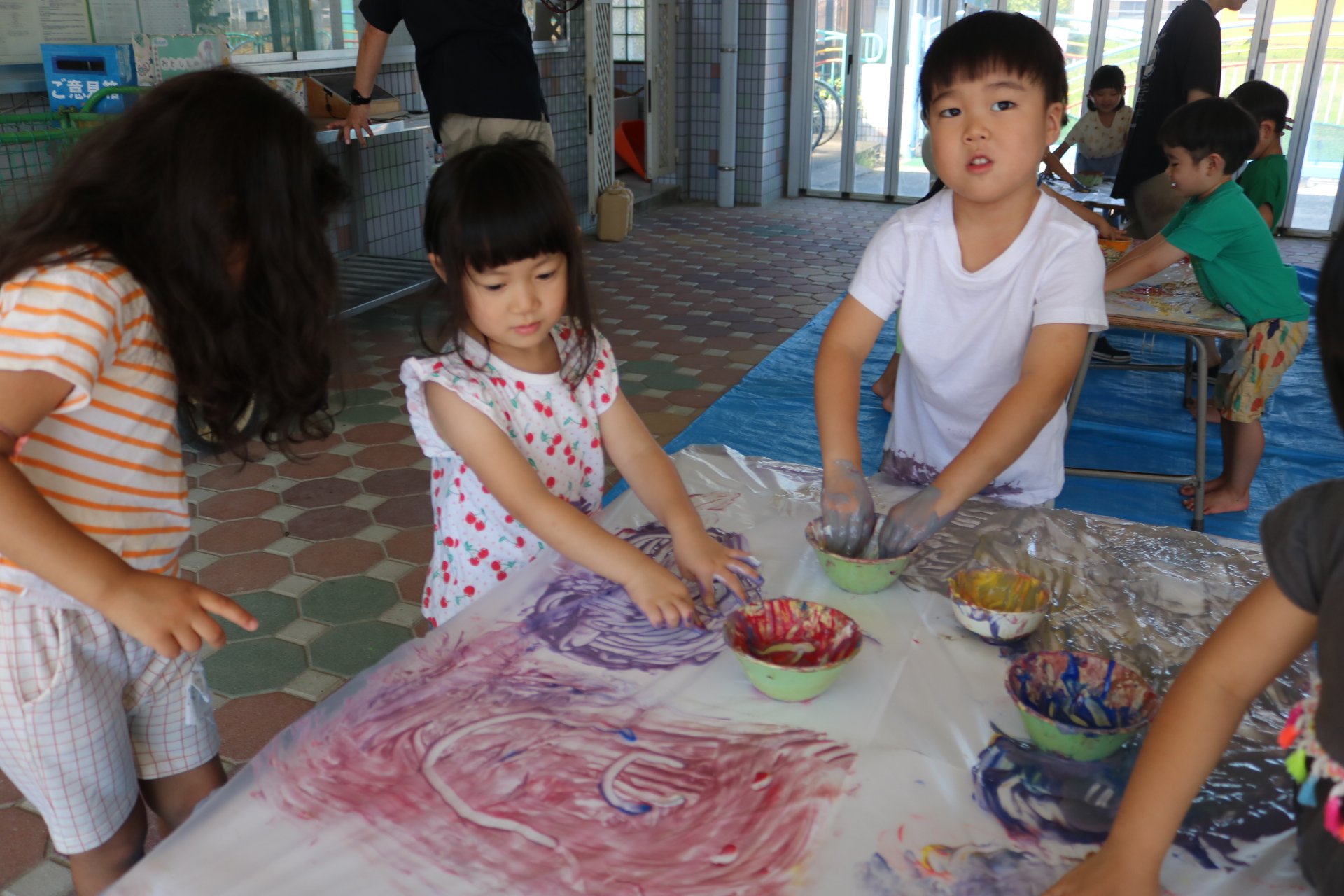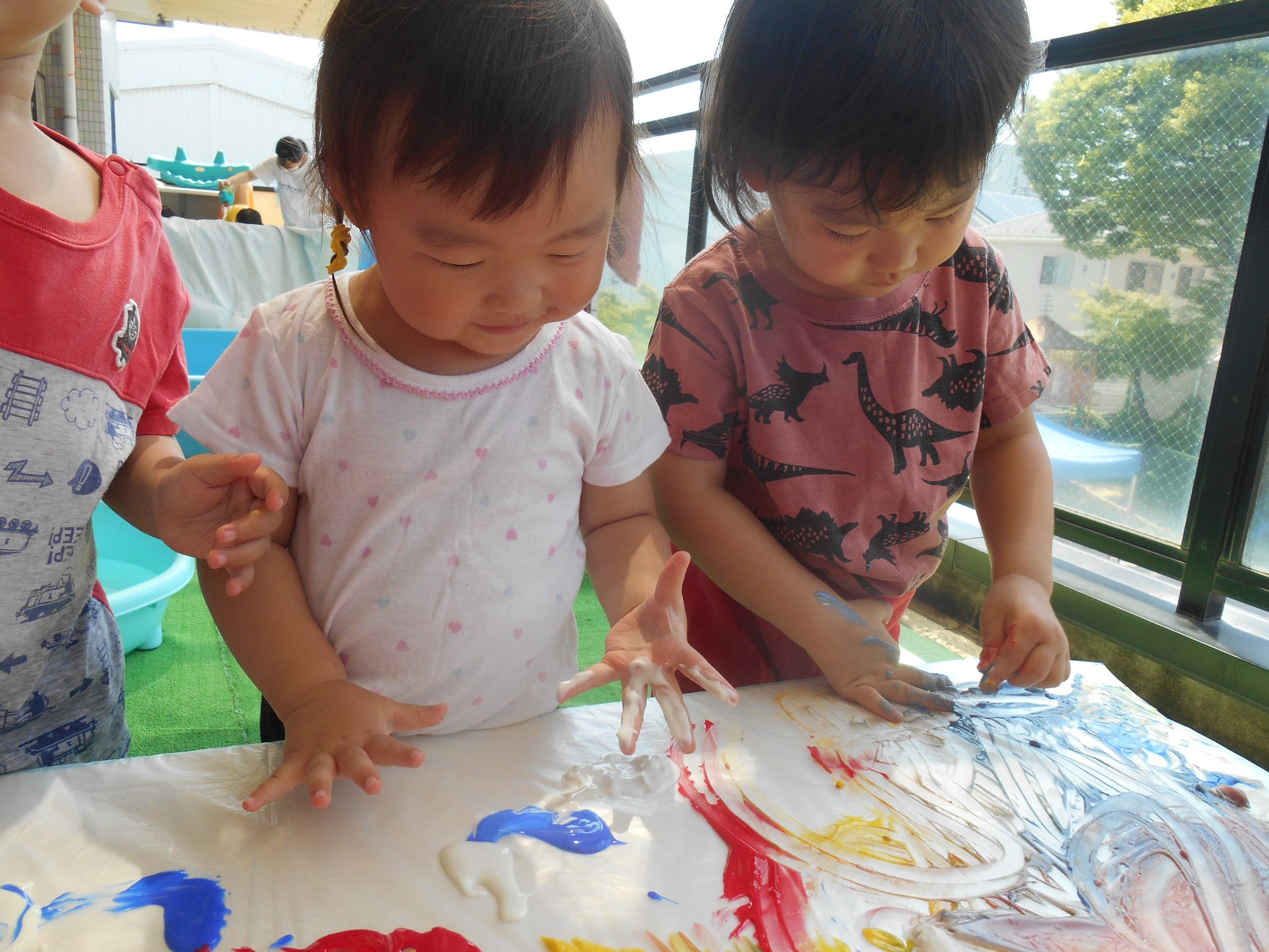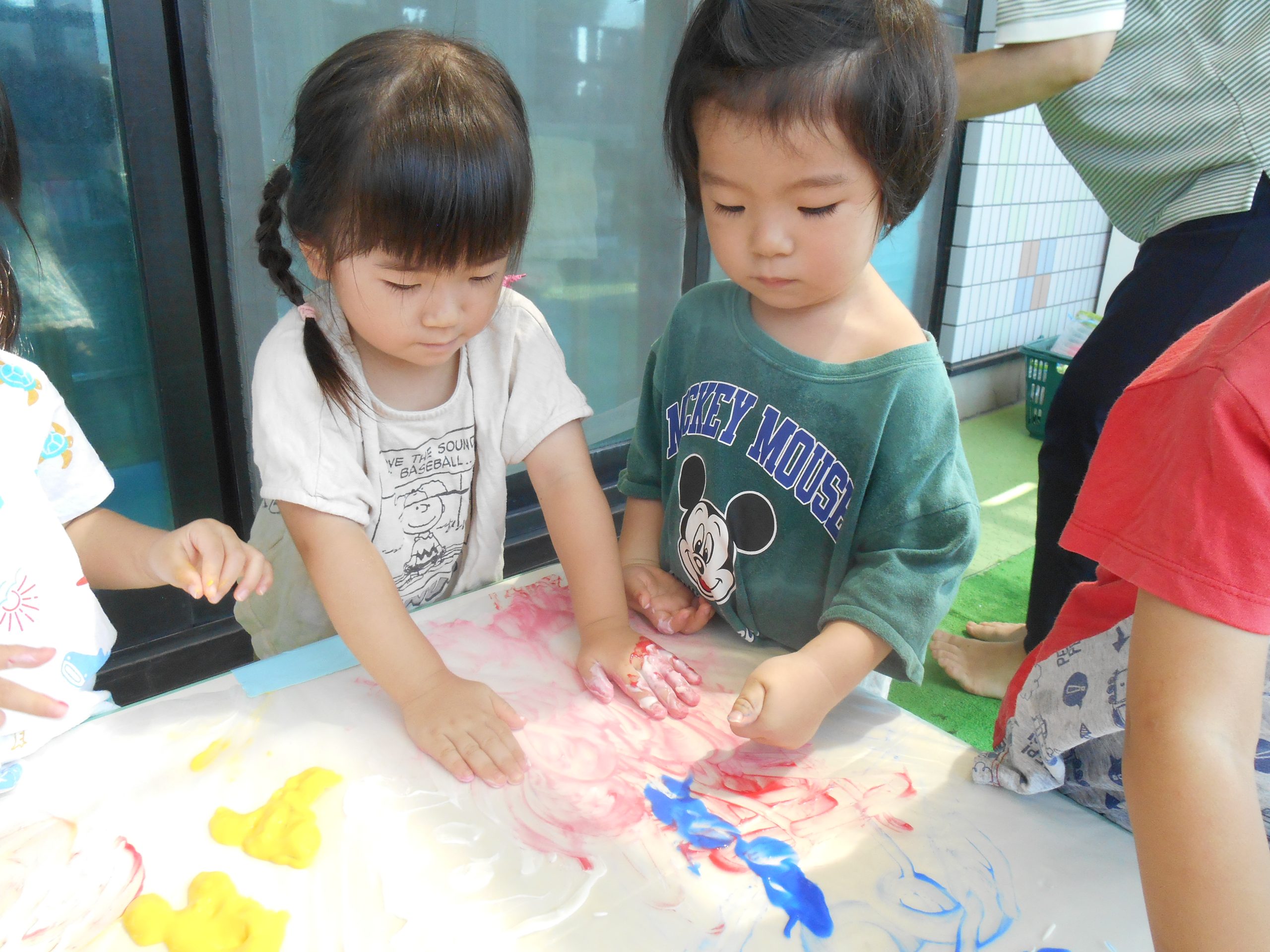 身体に付けて感触を楽しんだり、色を混ぜて色をつくったり・・・いろんな遊び方を楽しむ子どもたちでした。