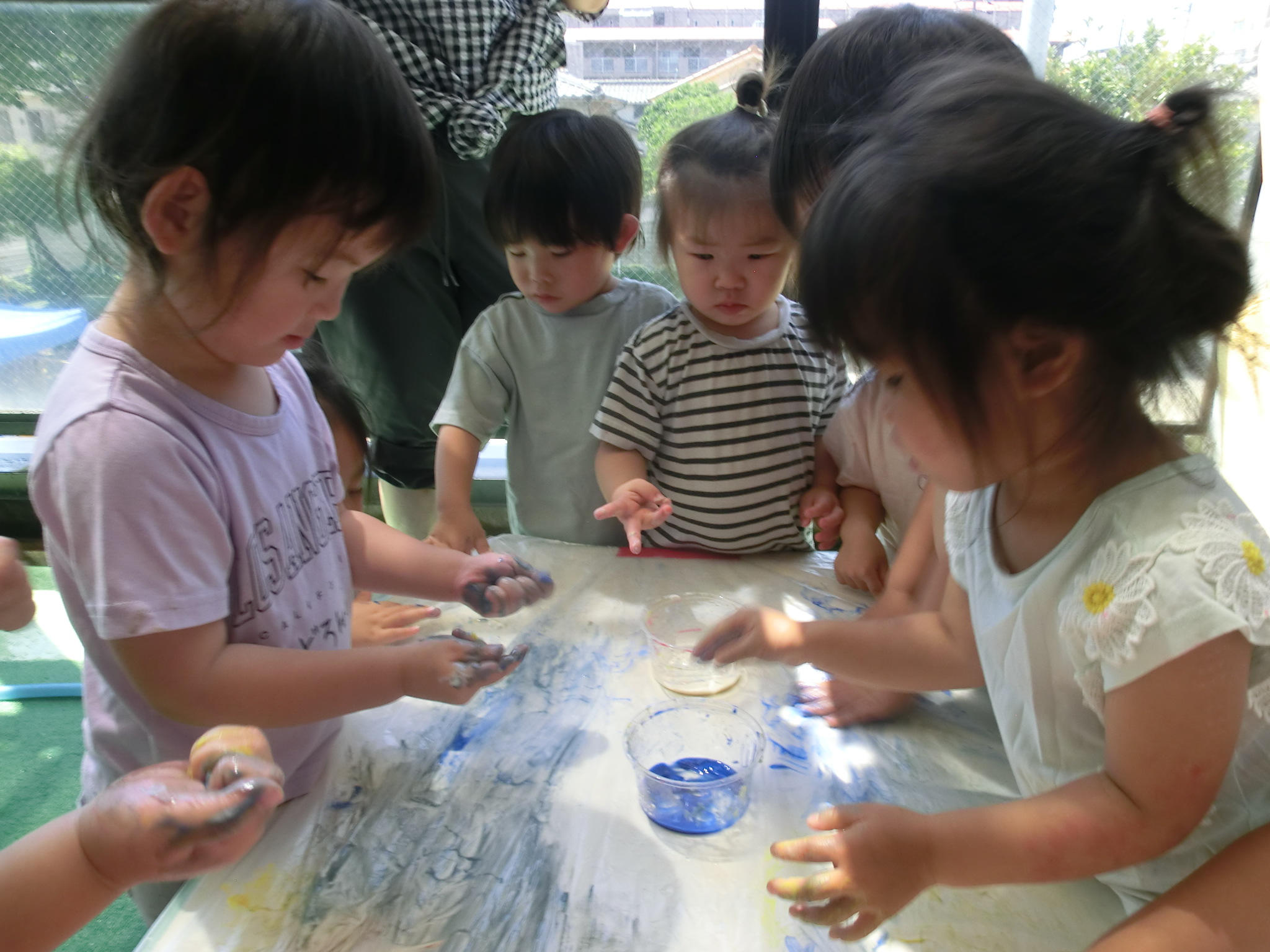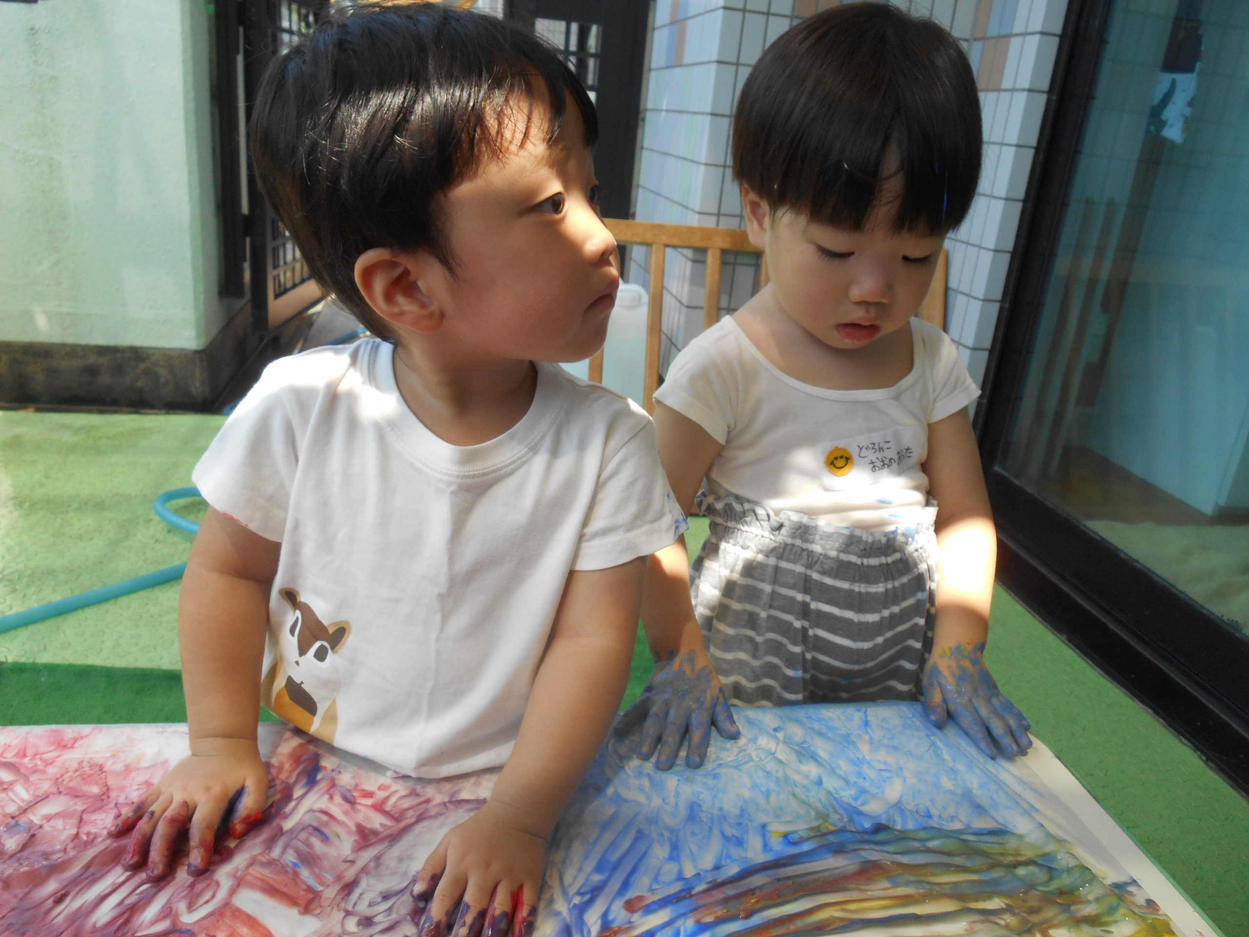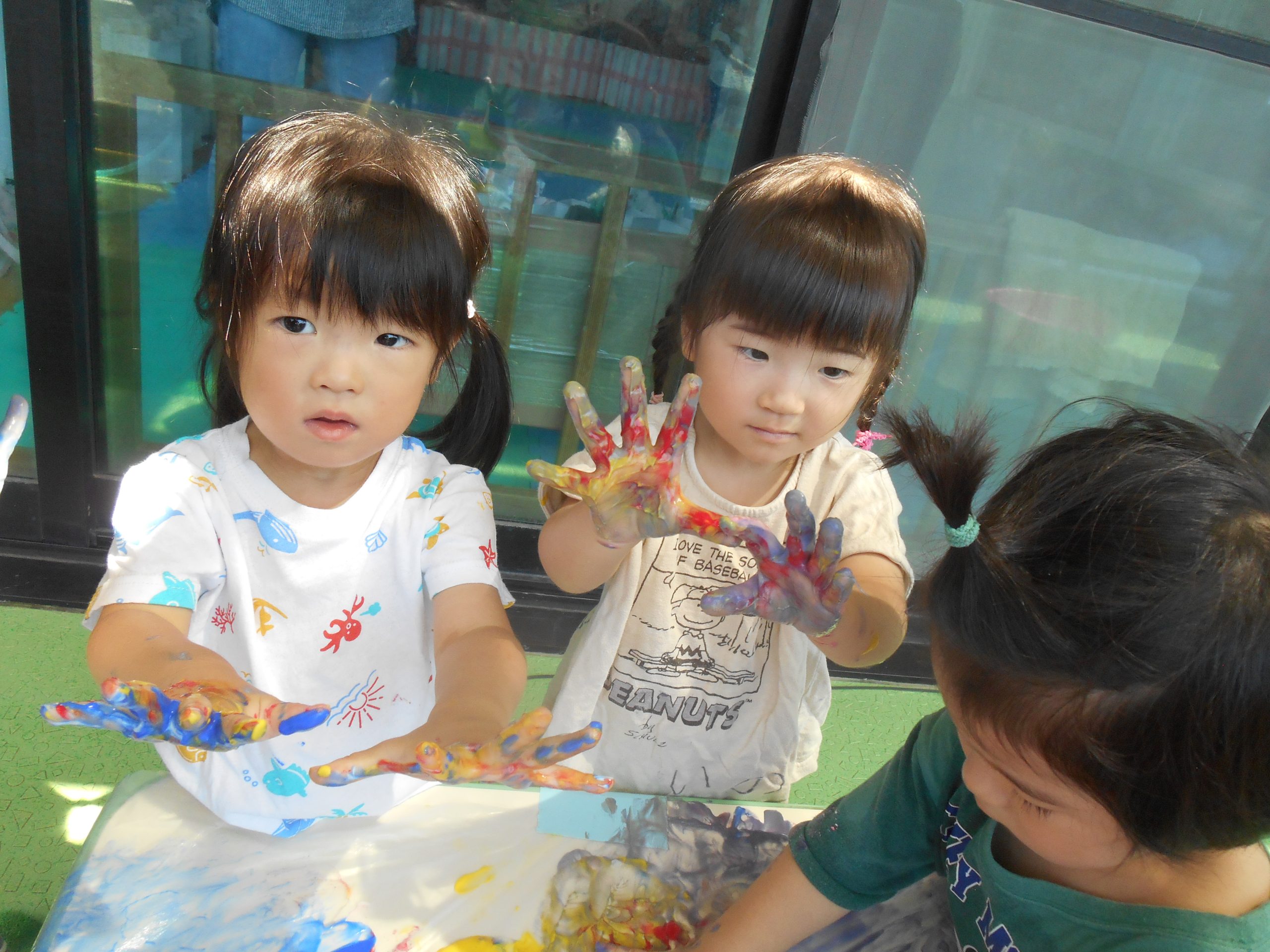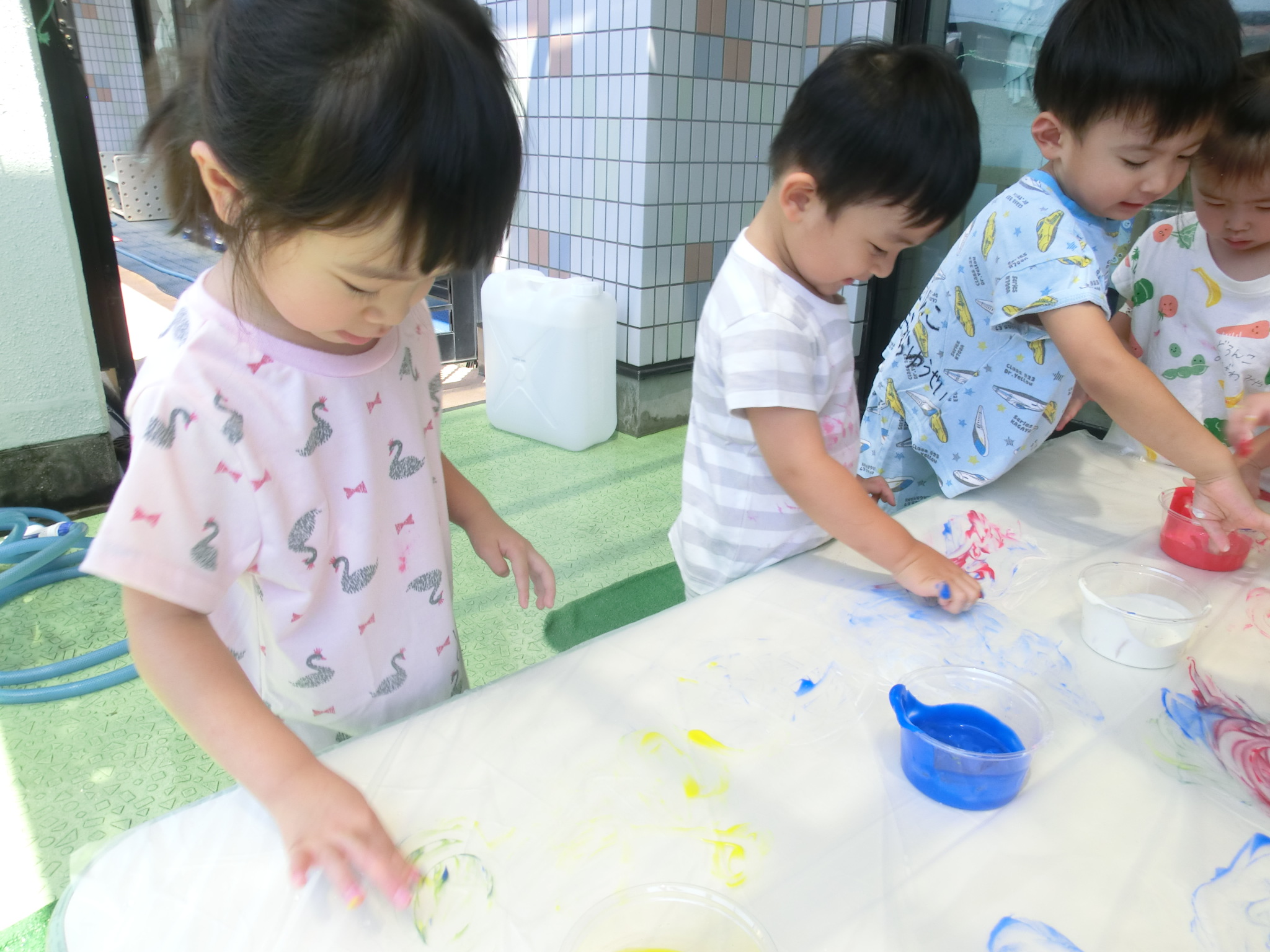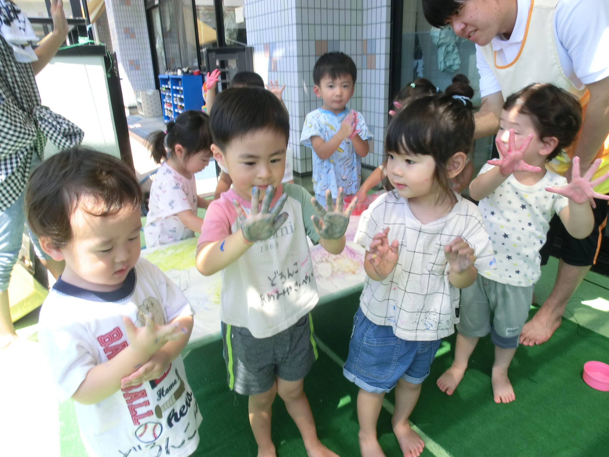 身体に付けて感触を楽しんだり、色を混ぜて色をつくったり・・・いろんな遊び方を楽しむ子どもたちでした。