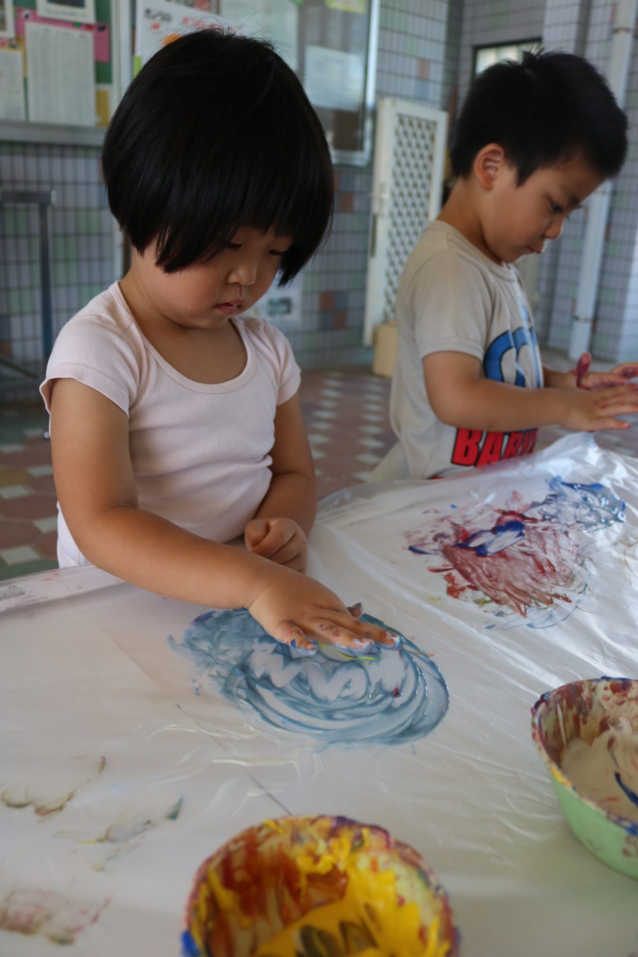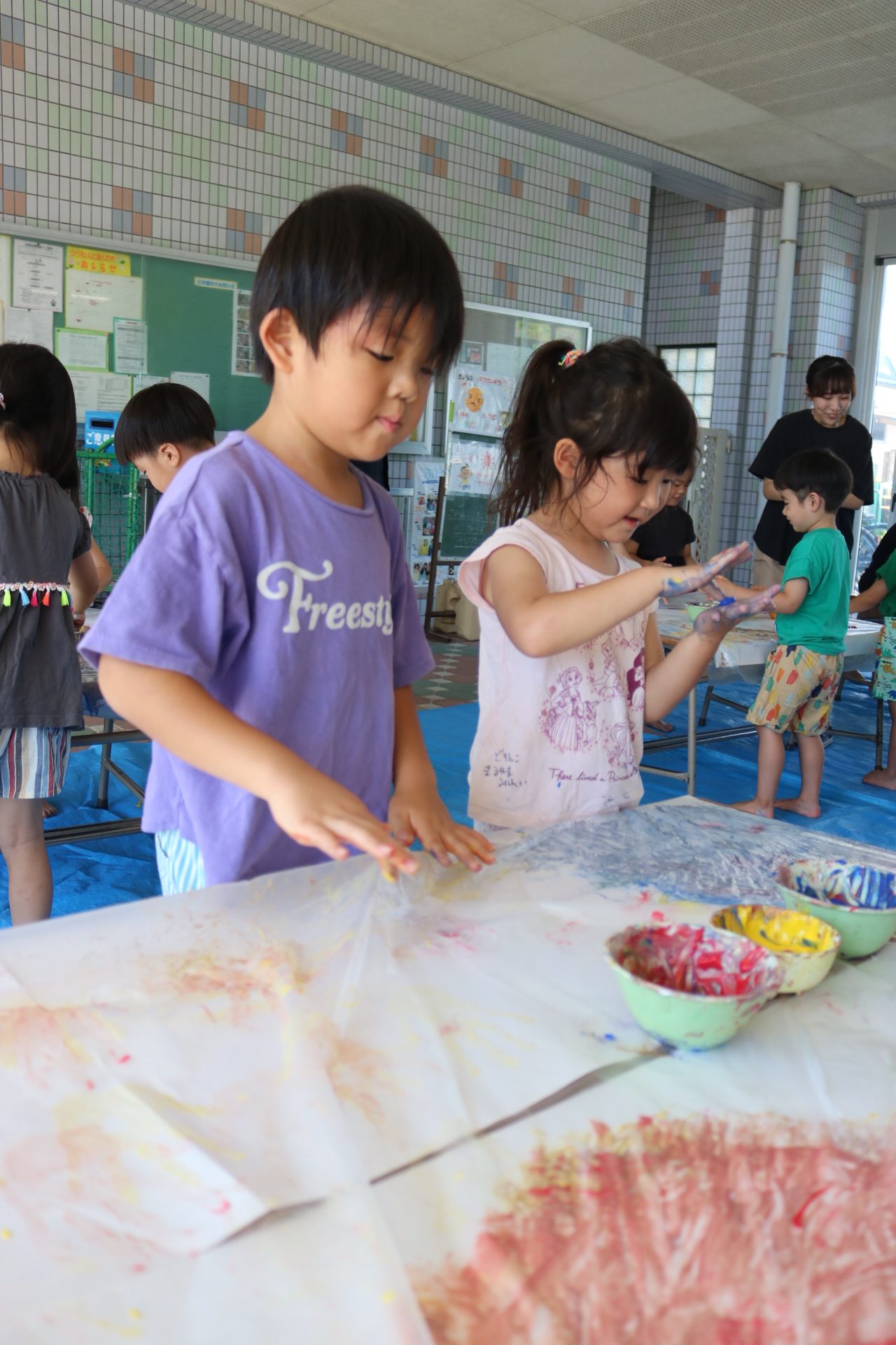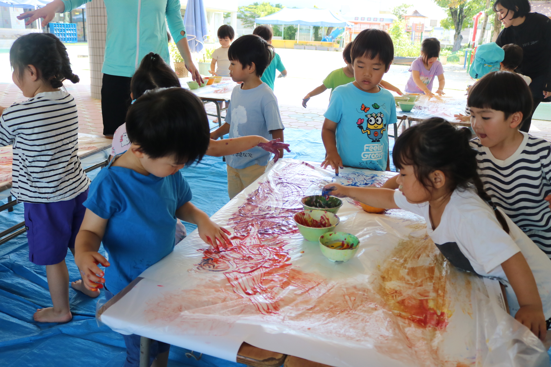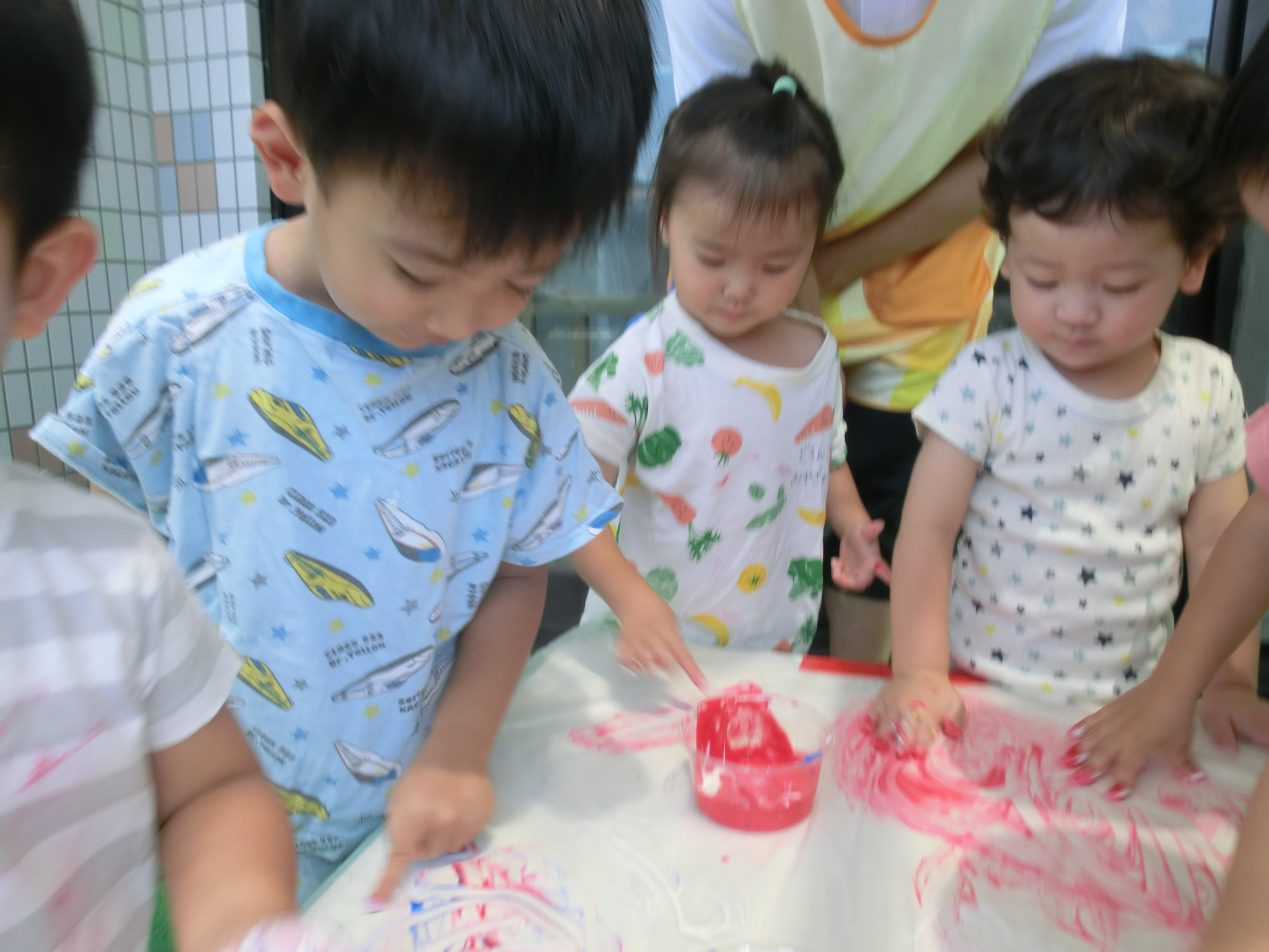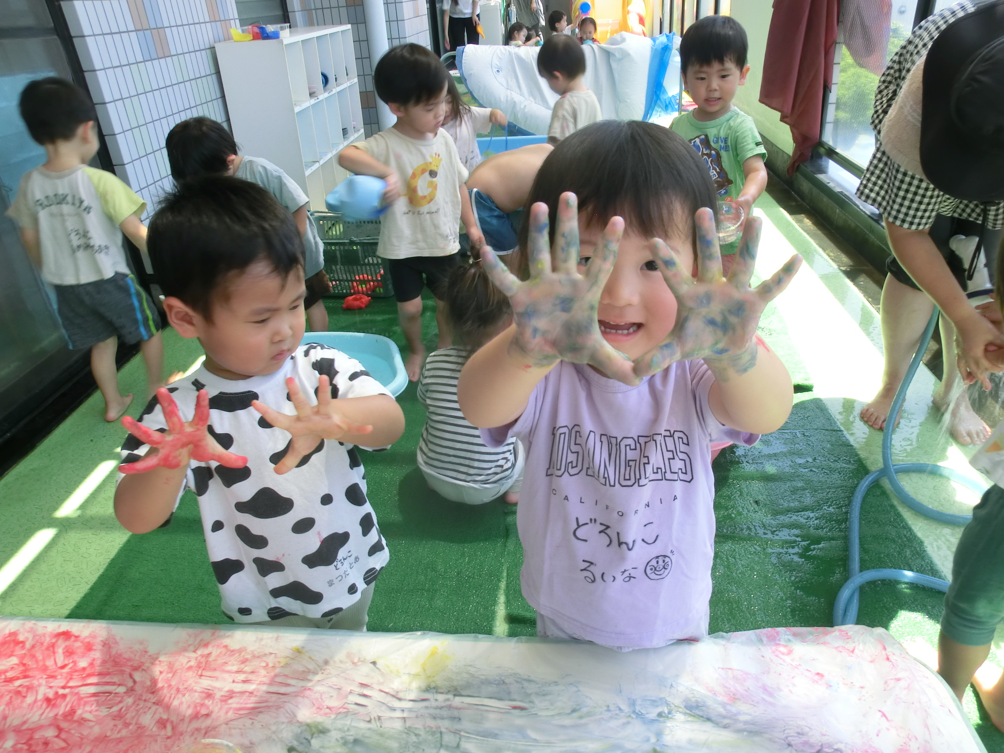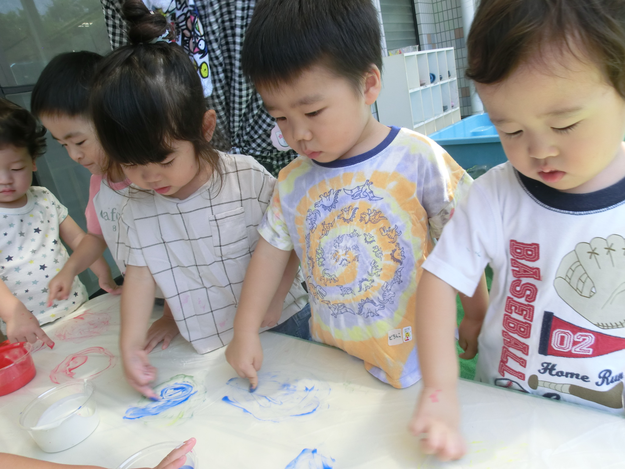 身体に付けて感触を楽しんだり、色を混ぜて色をつくったり・・・いろんな遊び方を楽しむ子どもたちでした。