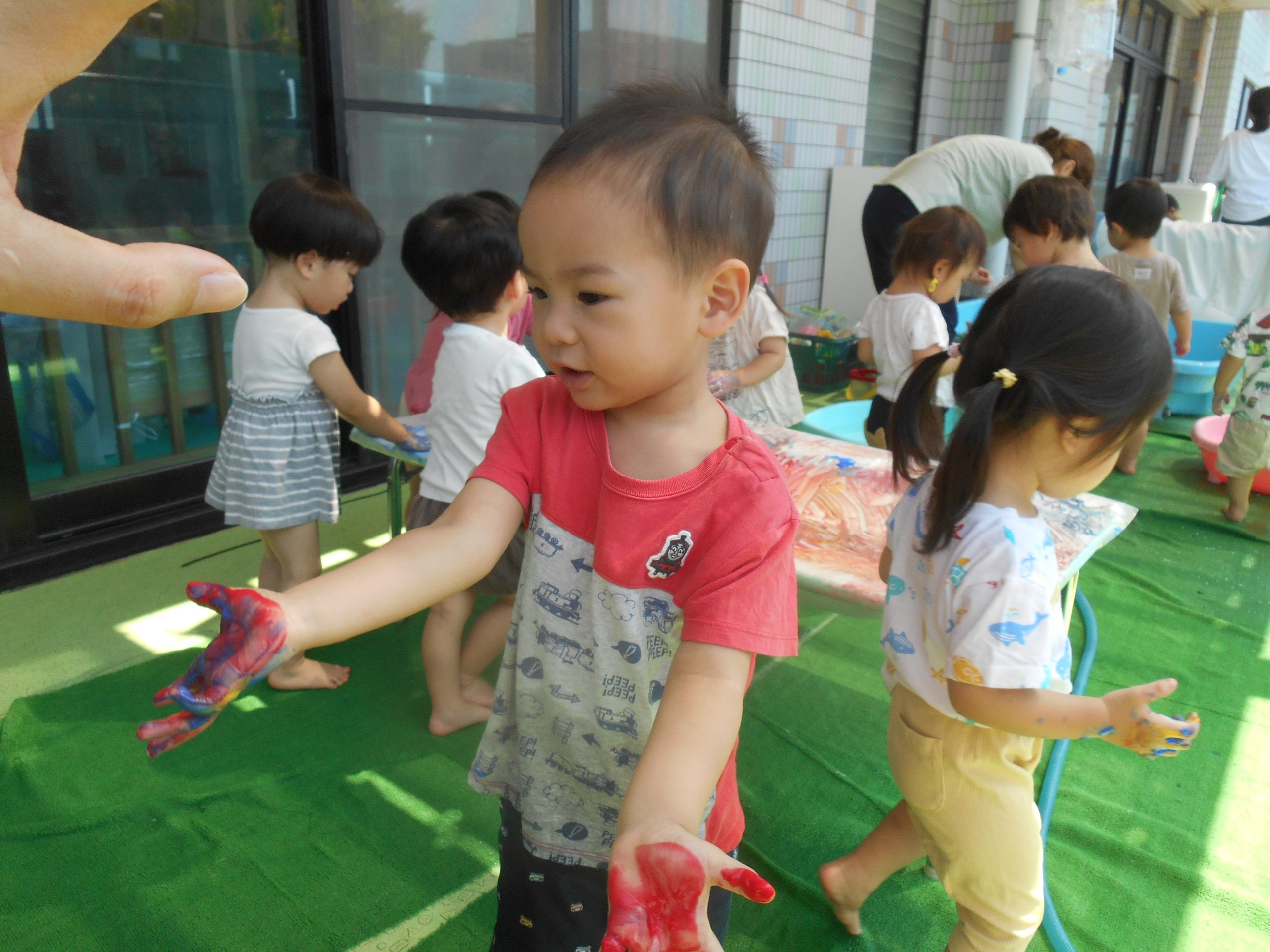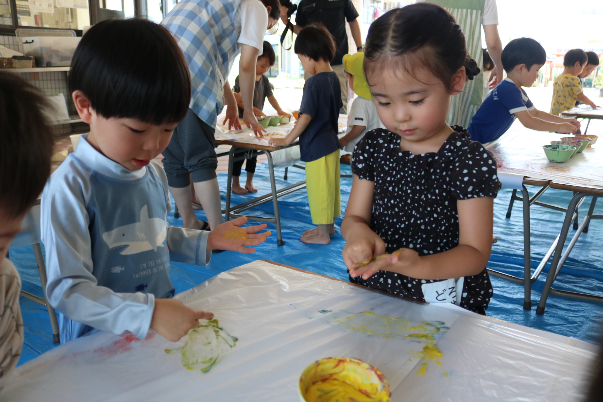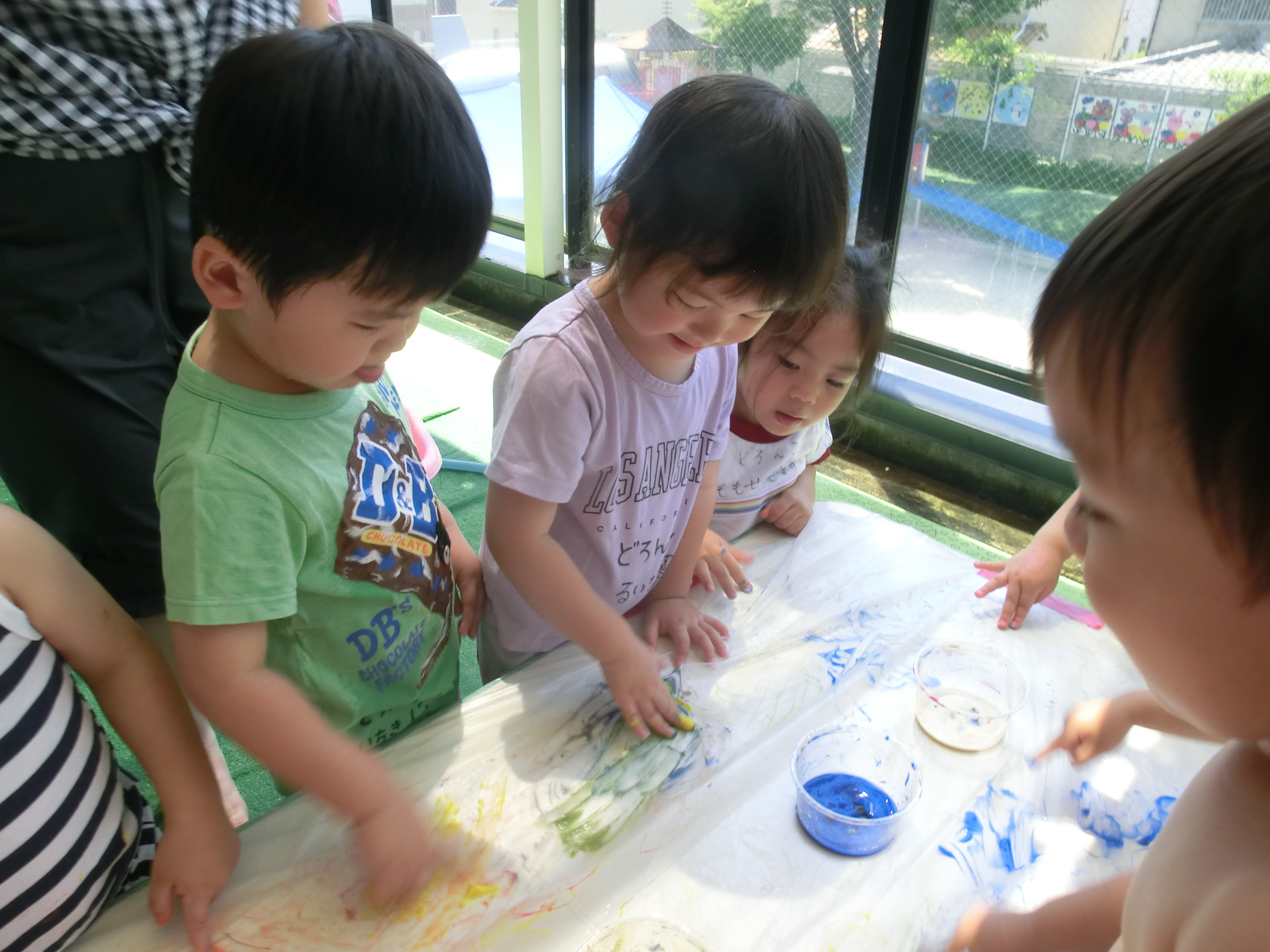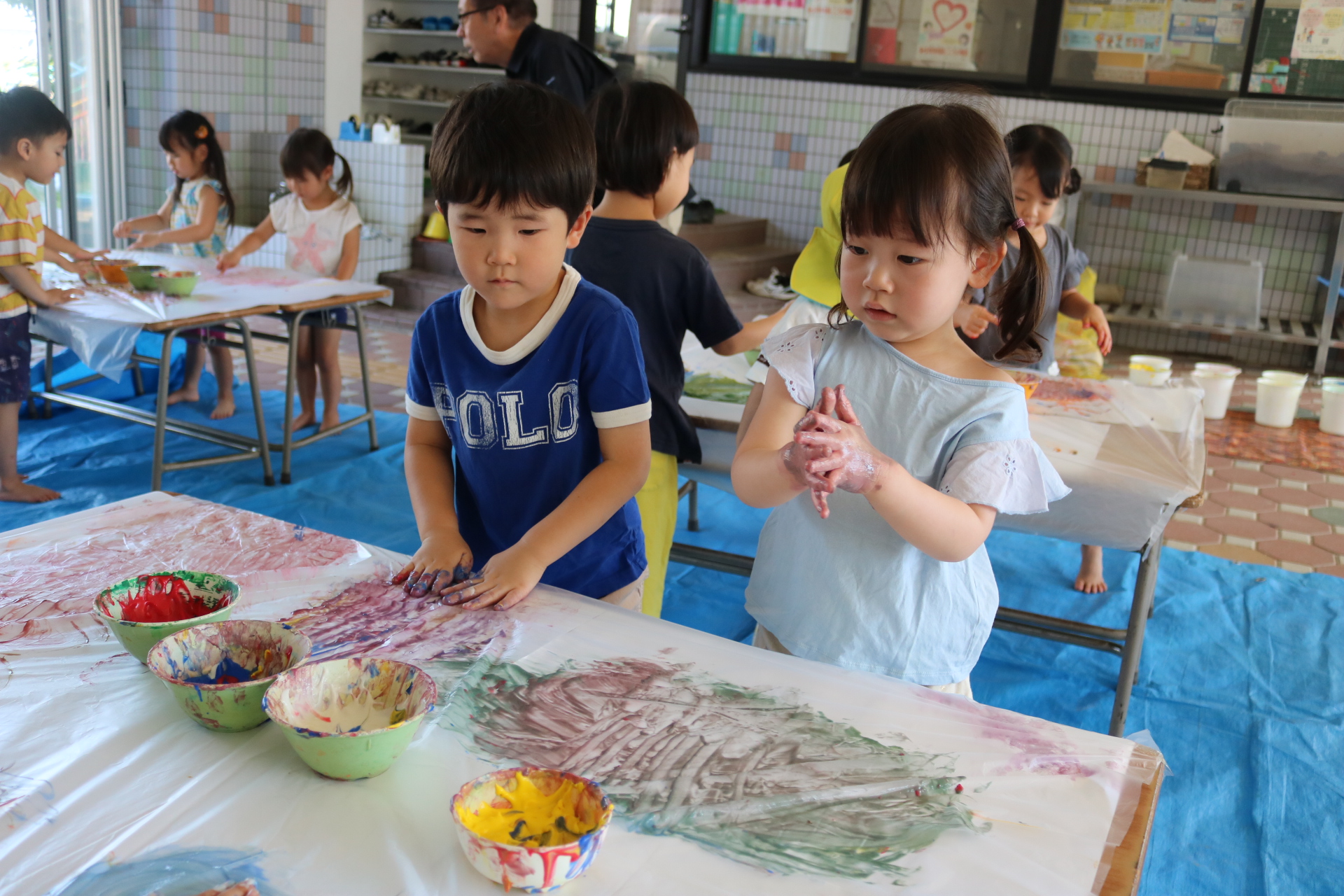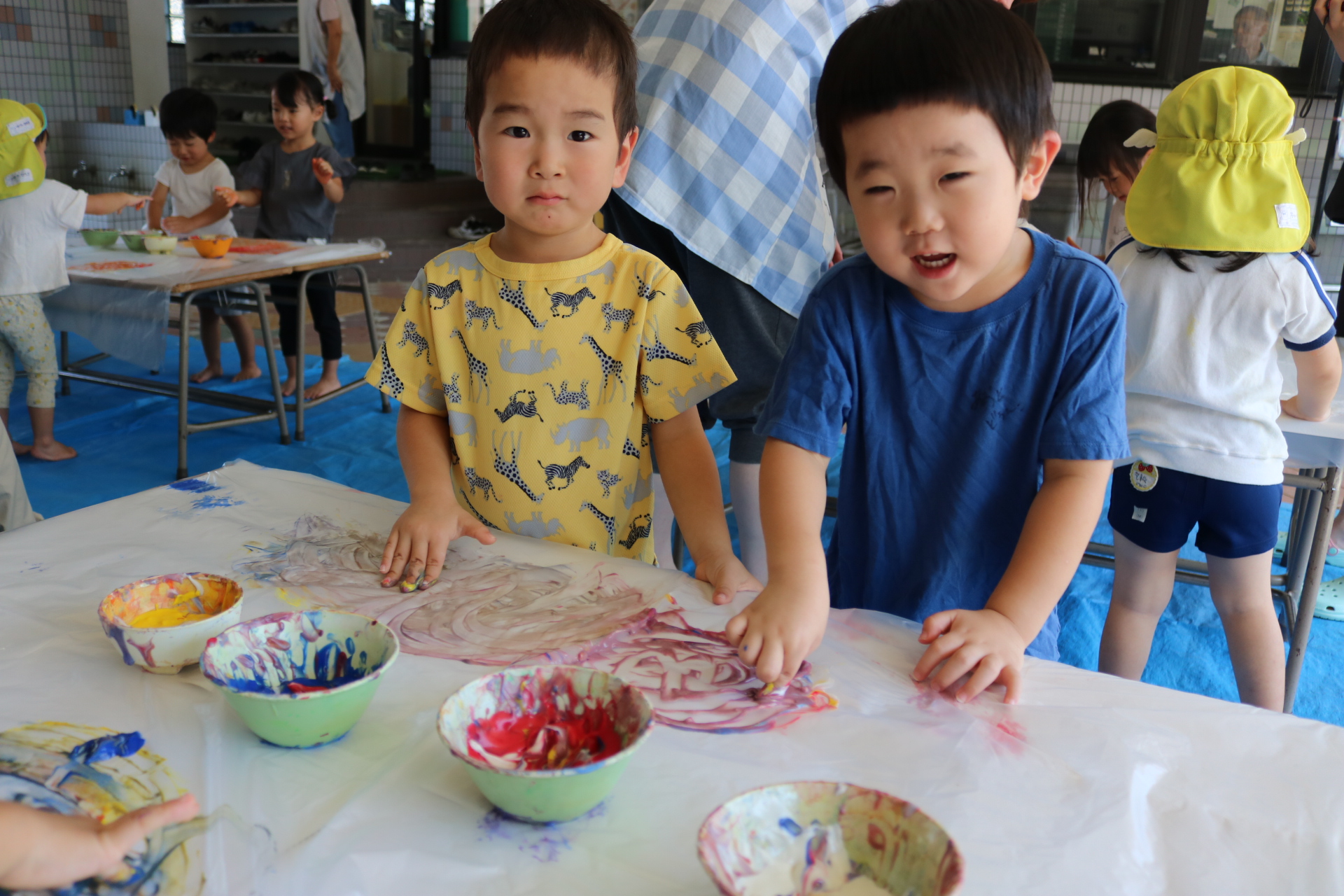 身体に付けて感触を楽しんだり、色を混ぜて色をつくったり・・・いろんな遊び方を楽しむ子どもたちでした。