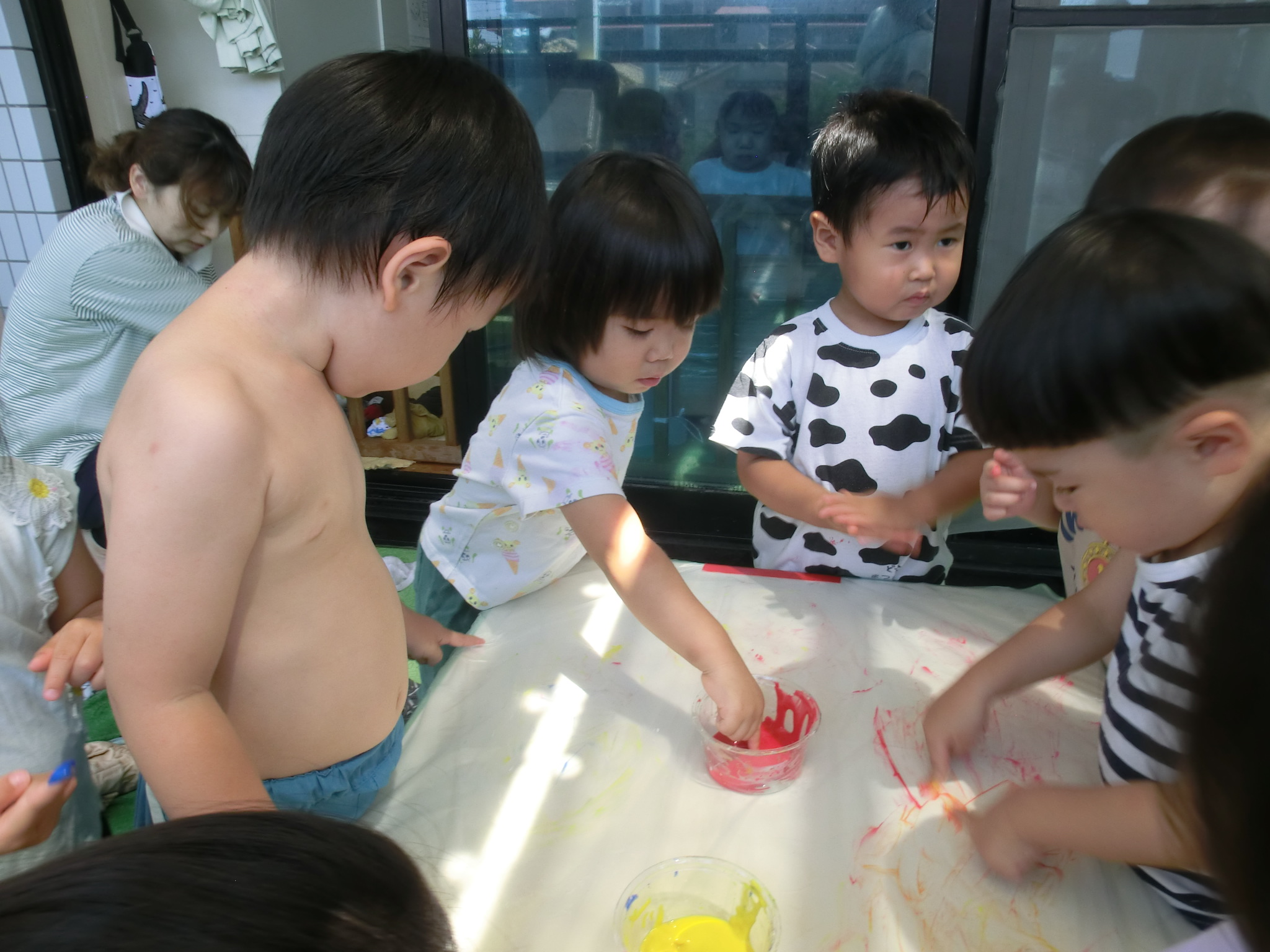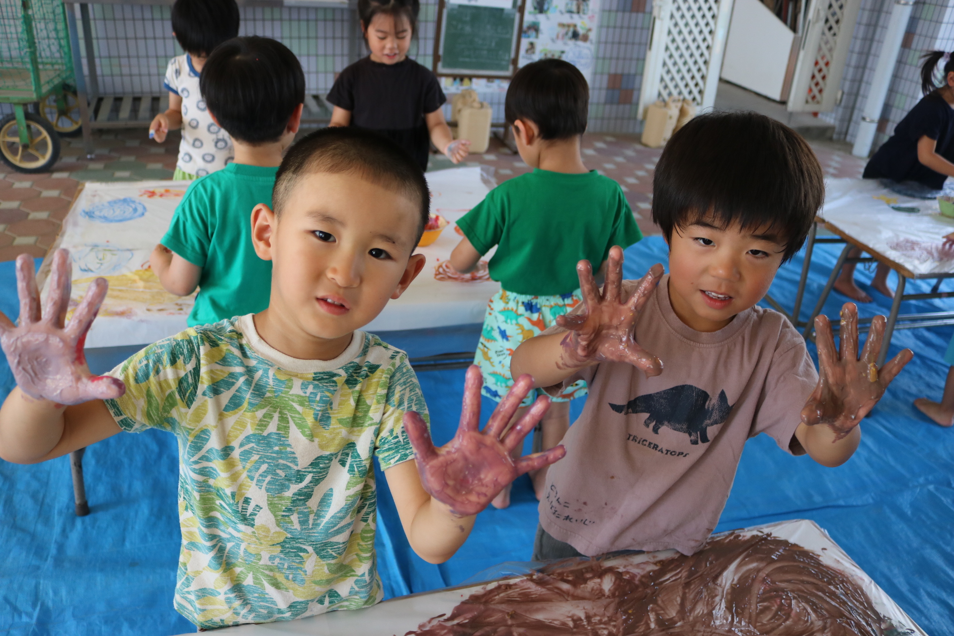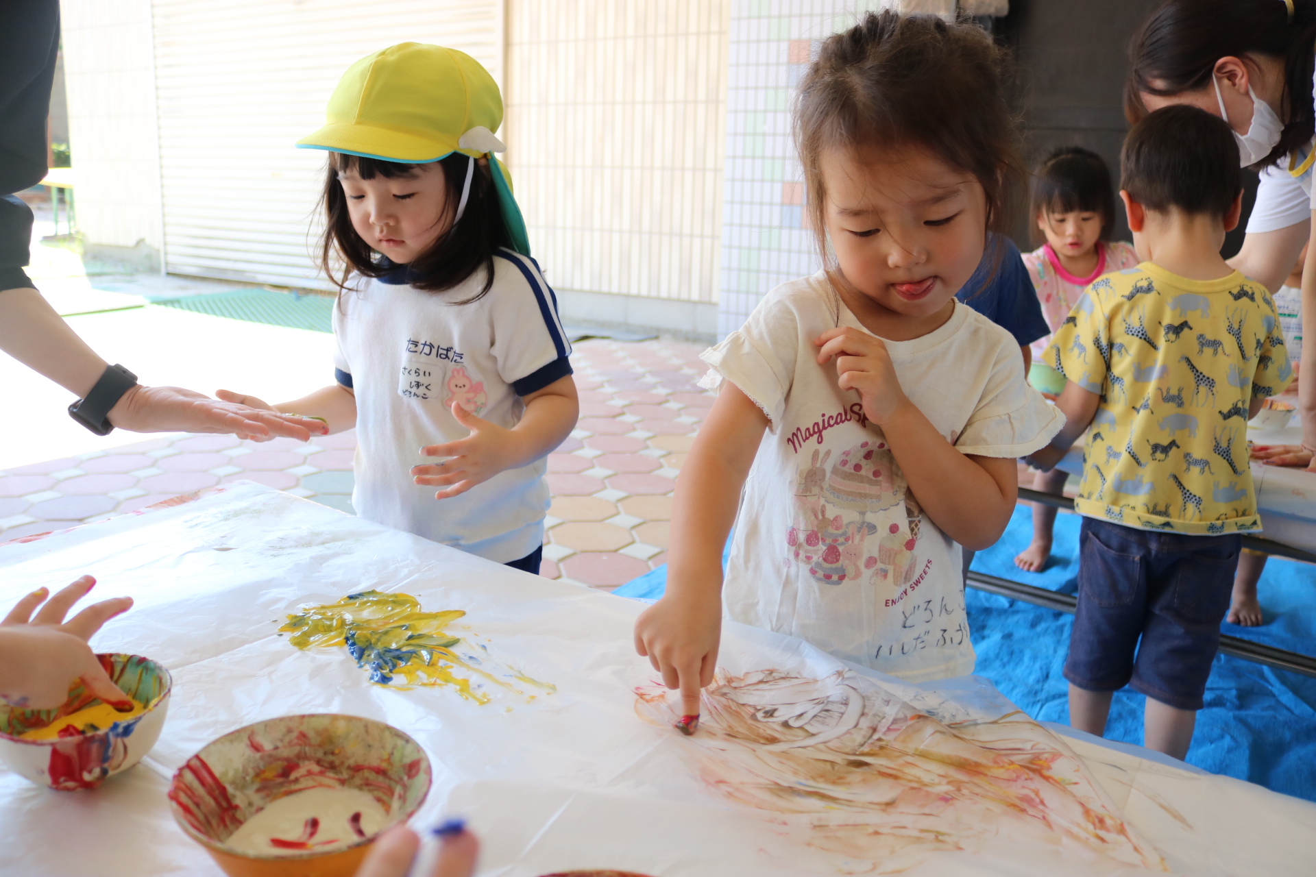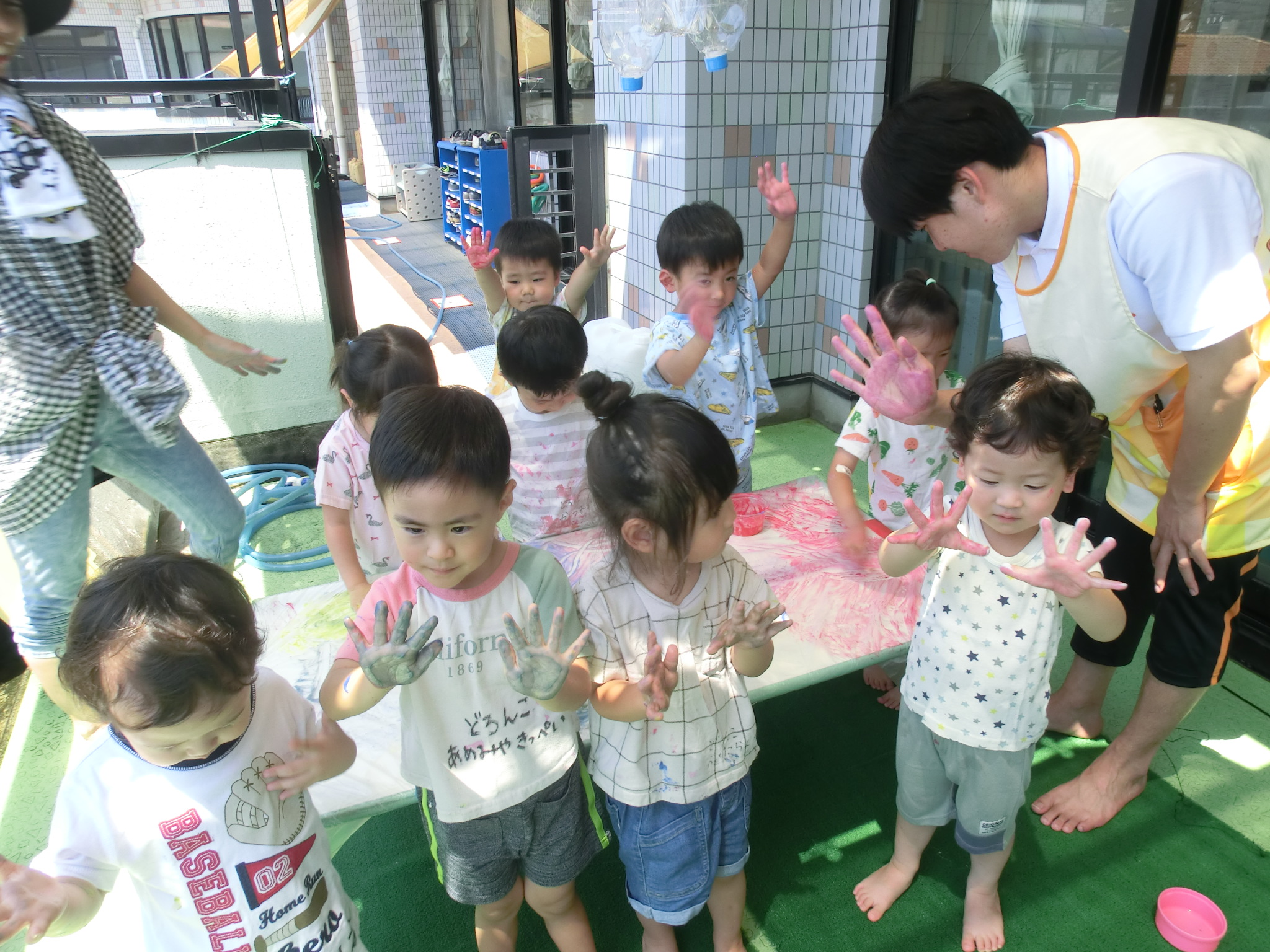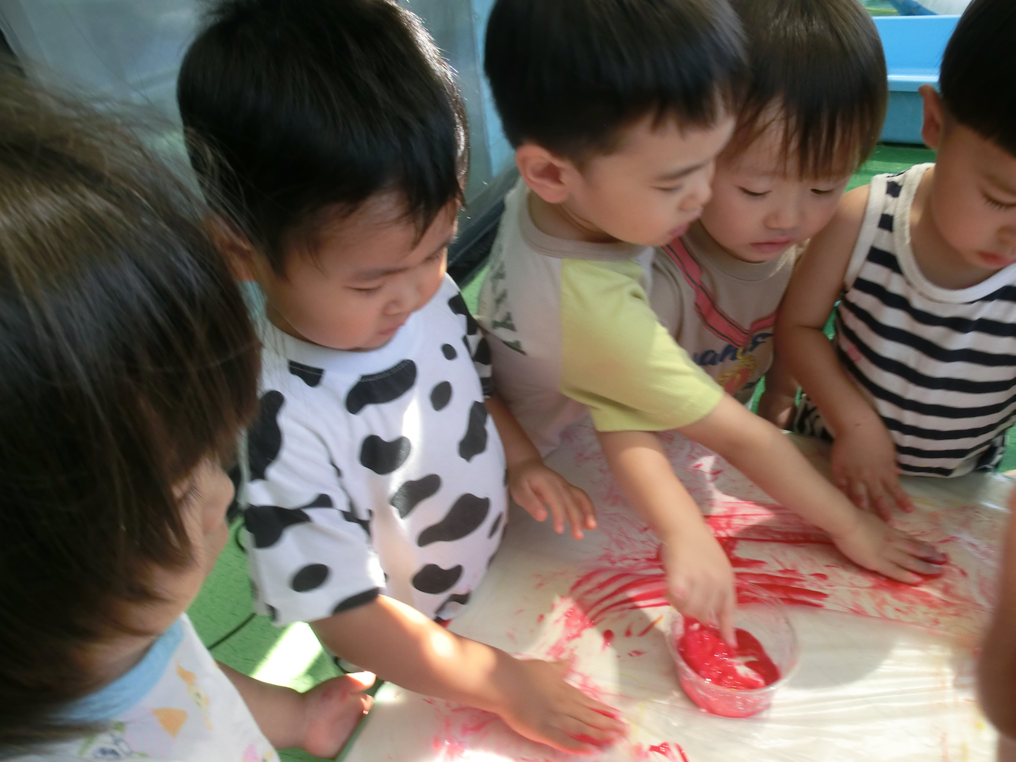 身体に付けて感触を楽しんだり、色を混ぜて色をつくったり・・・いろんな遊び方を楽しむ子どもたちでした。