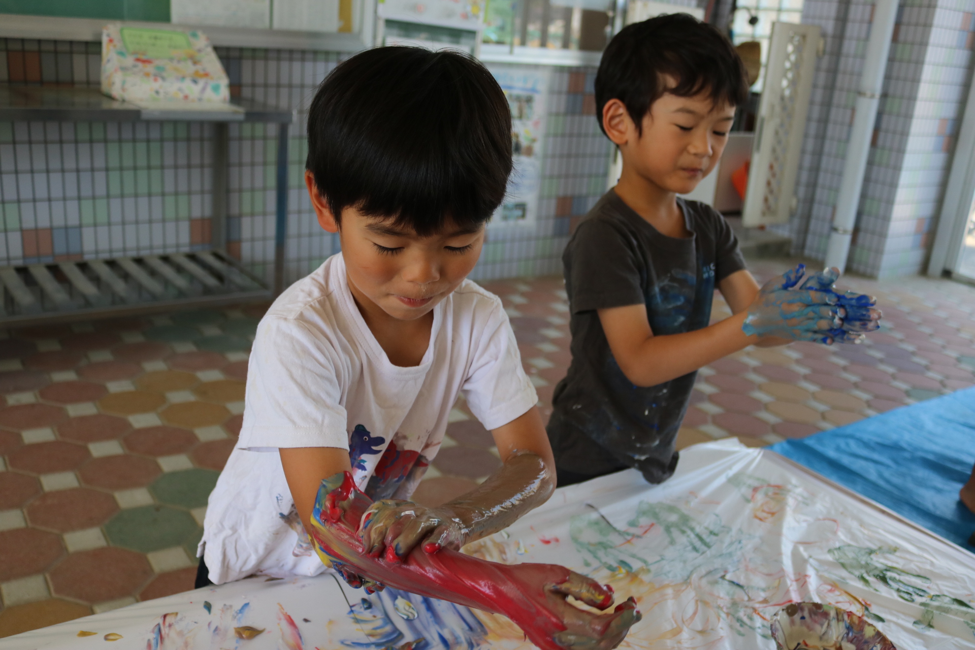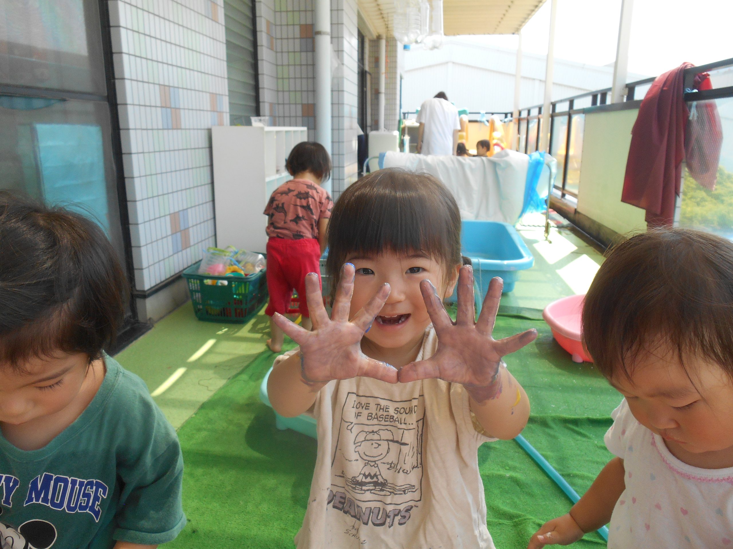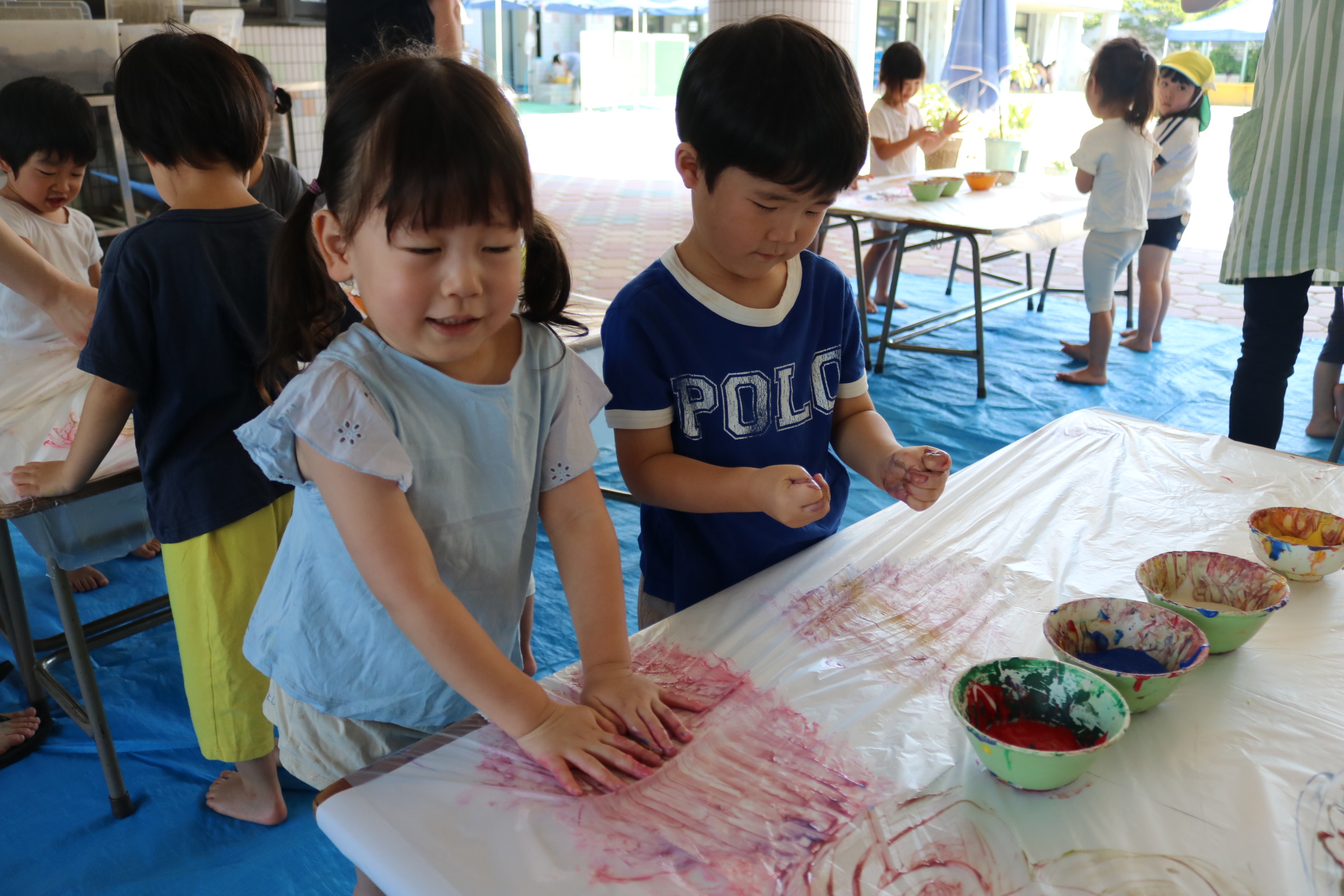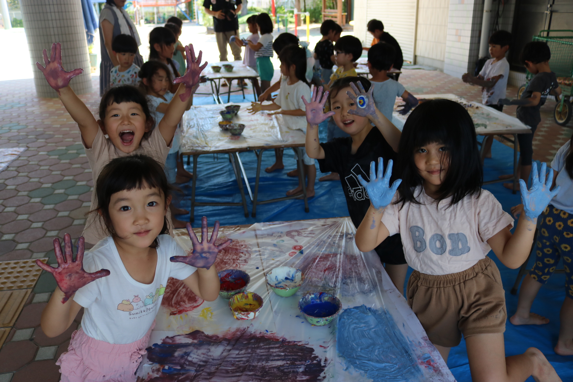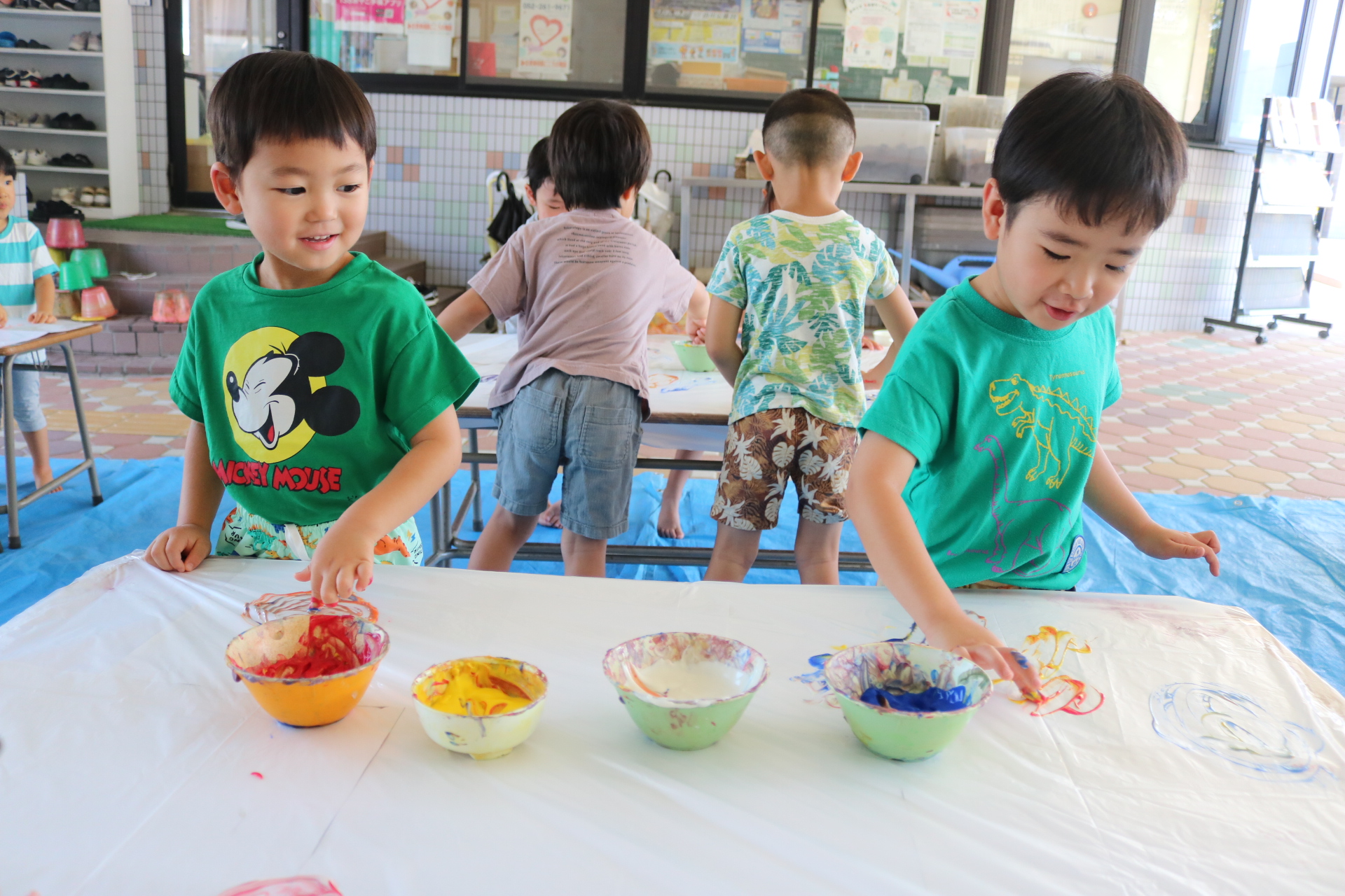 身体に付けて感触を楽しんだり、色を混ぜて色をつくったり・・・いろんな遊び方を楽しむ子どもたちでした。