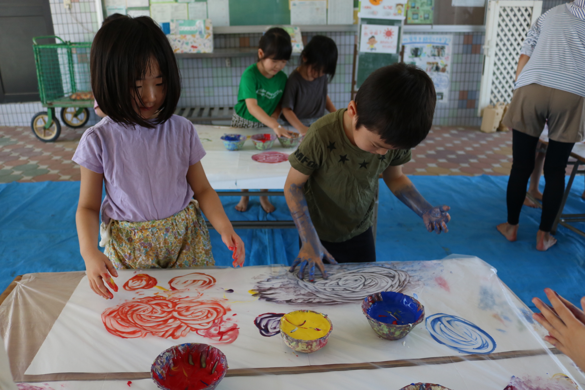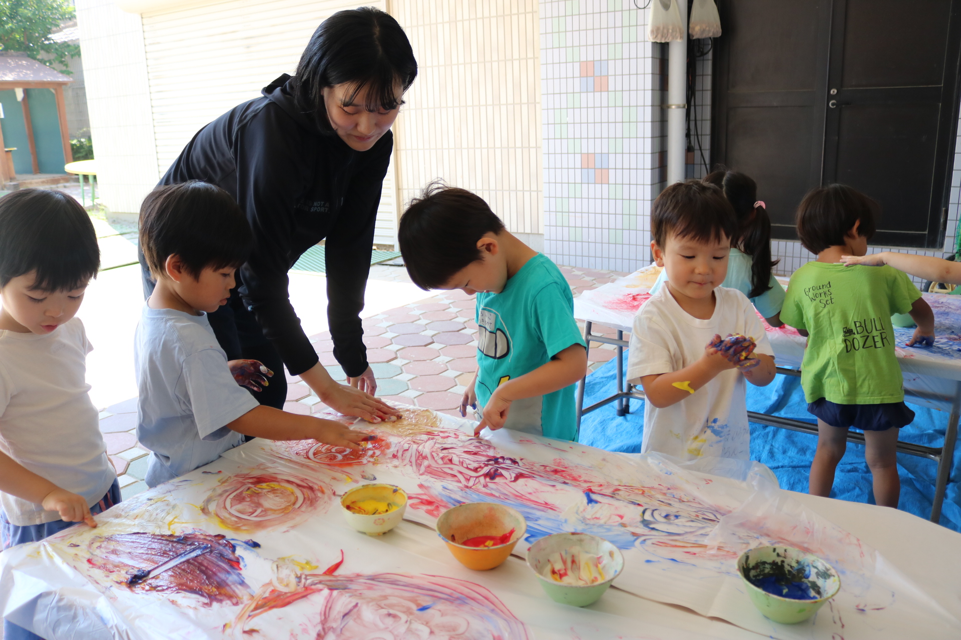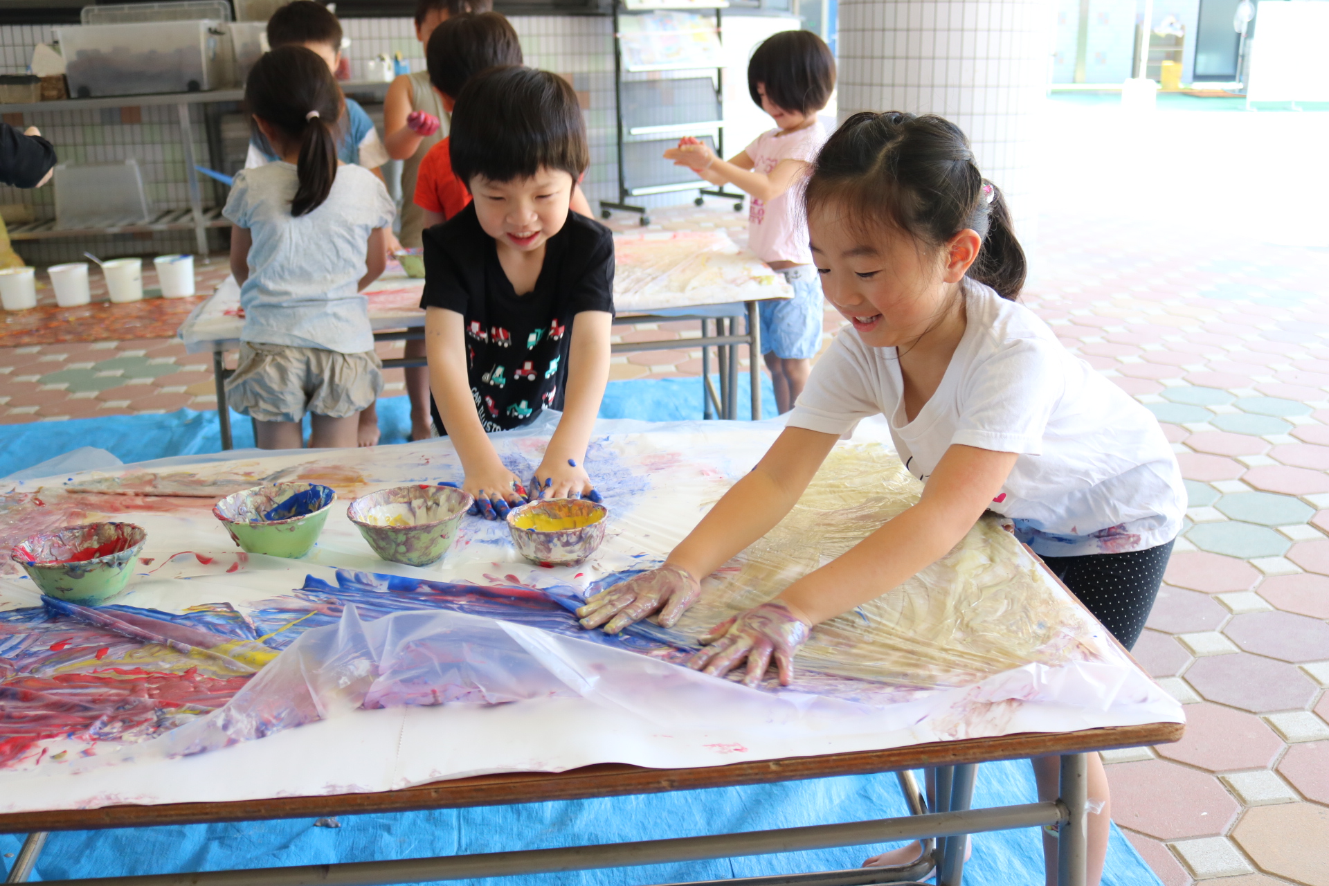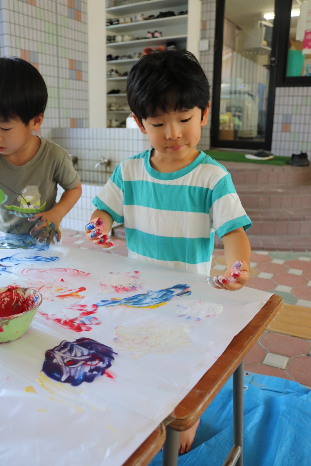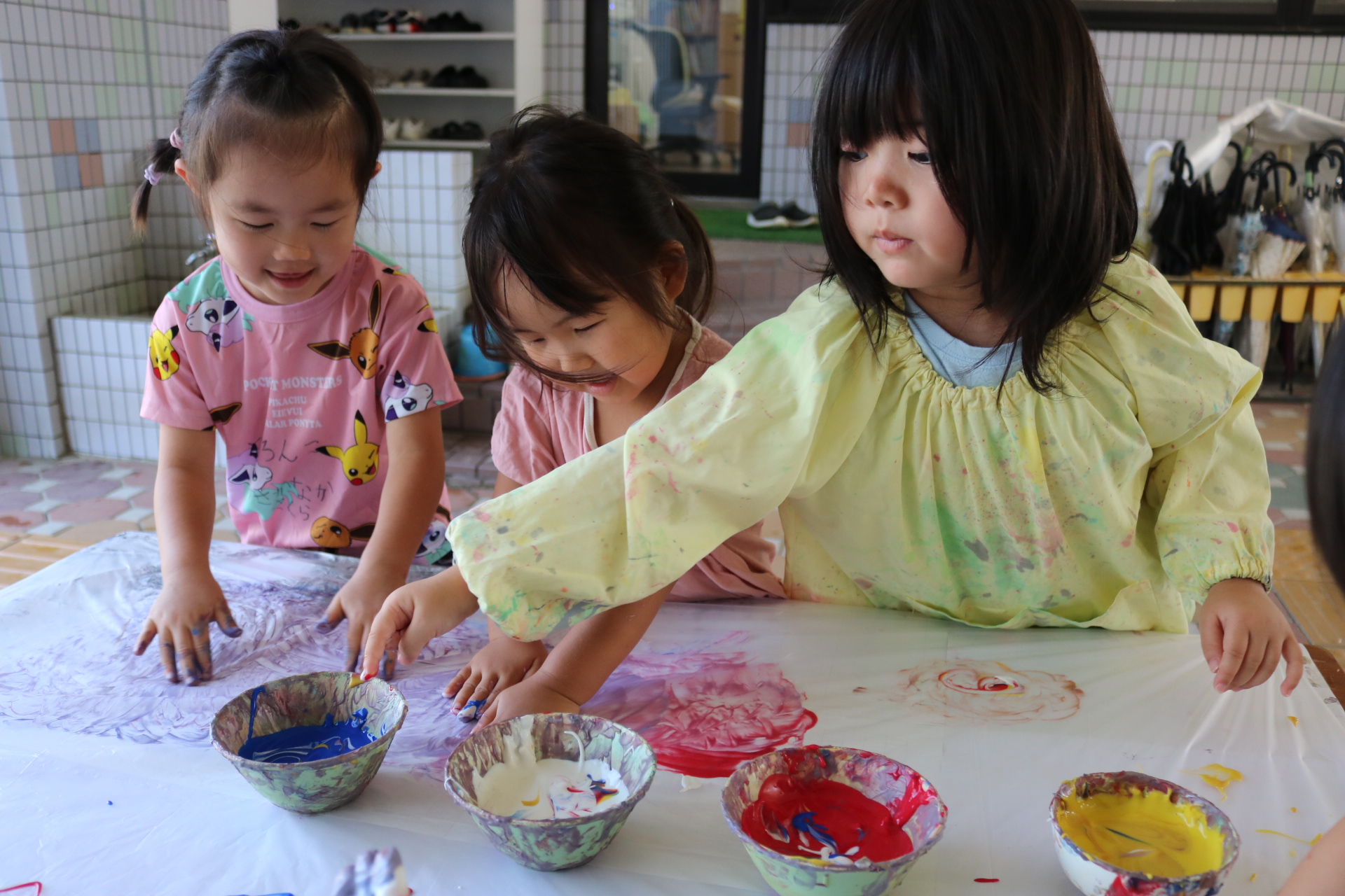 身体に付けて感触を楽しんだり、色を混ぜて色をつくったり・・・いろんな遊び方を楽しむ子どもたちでした。