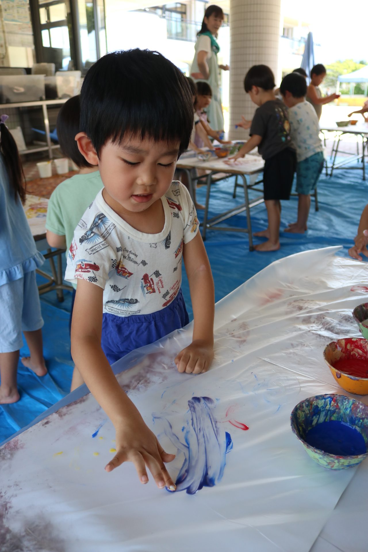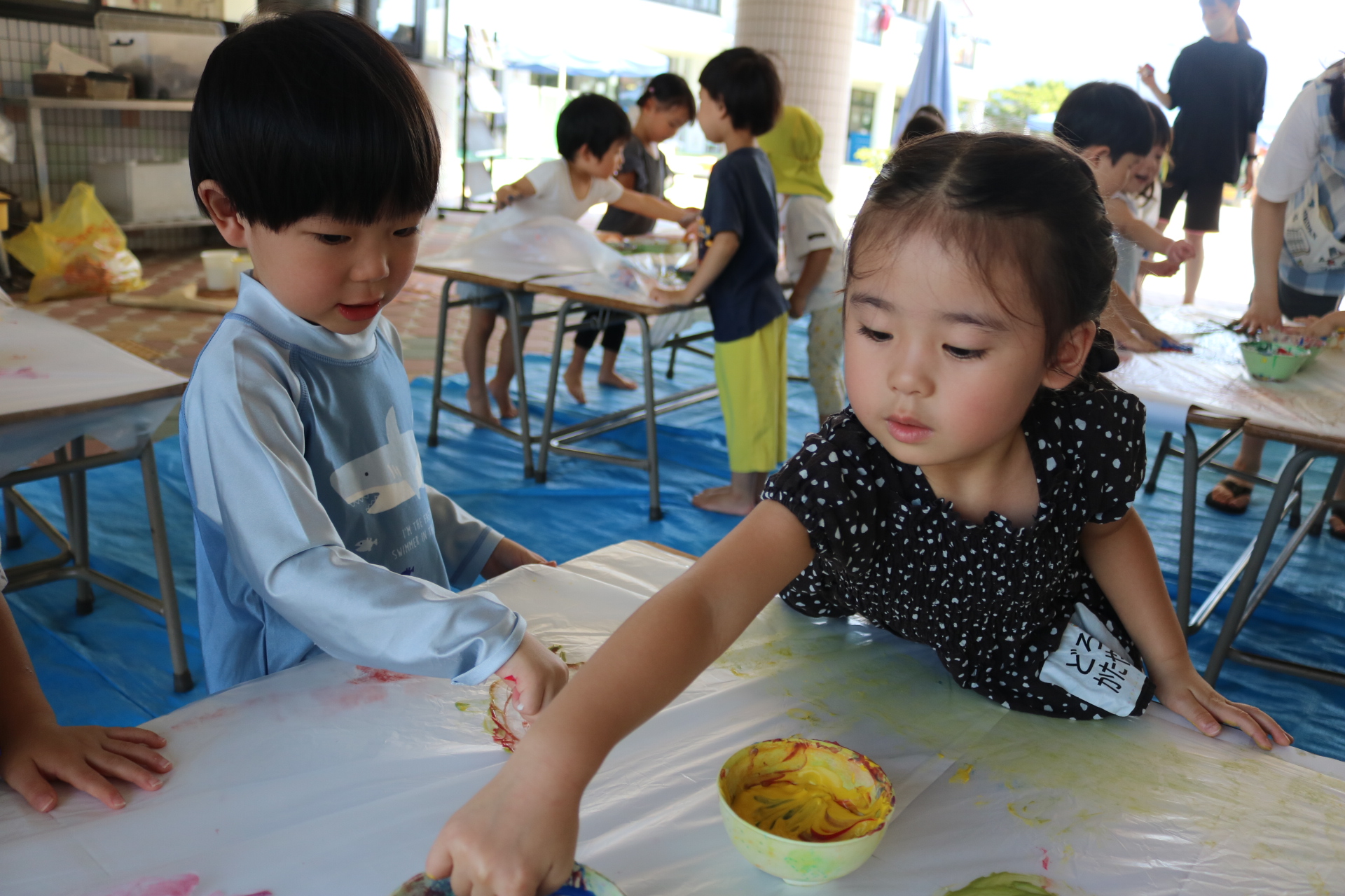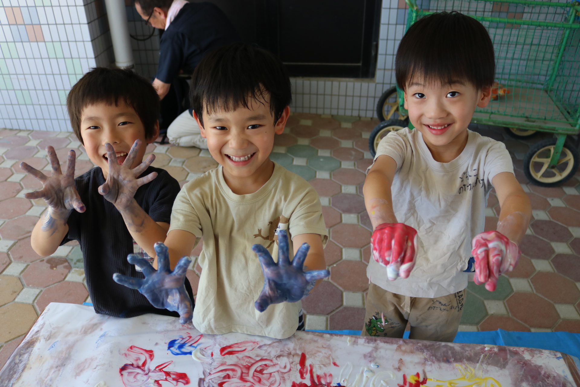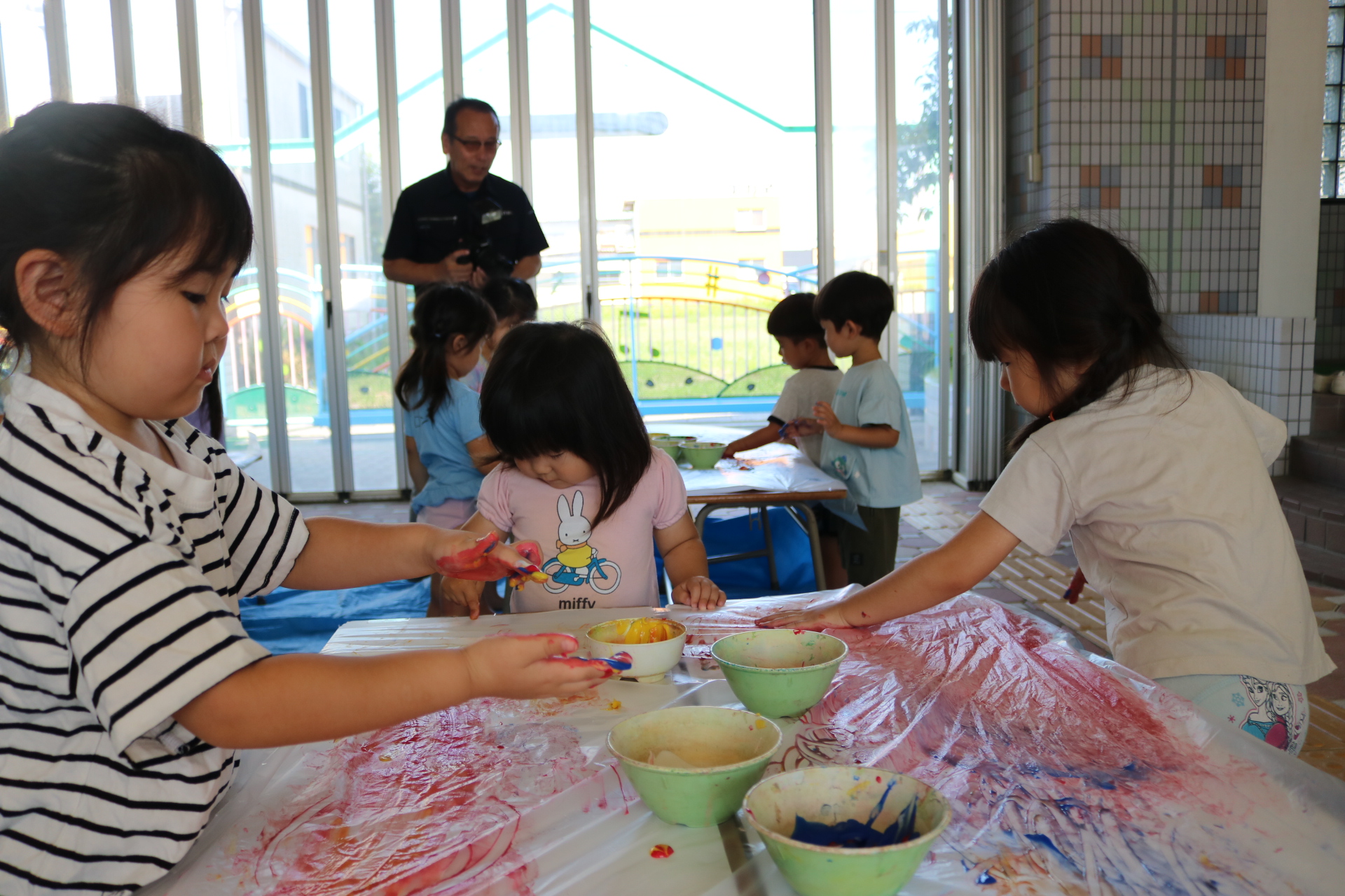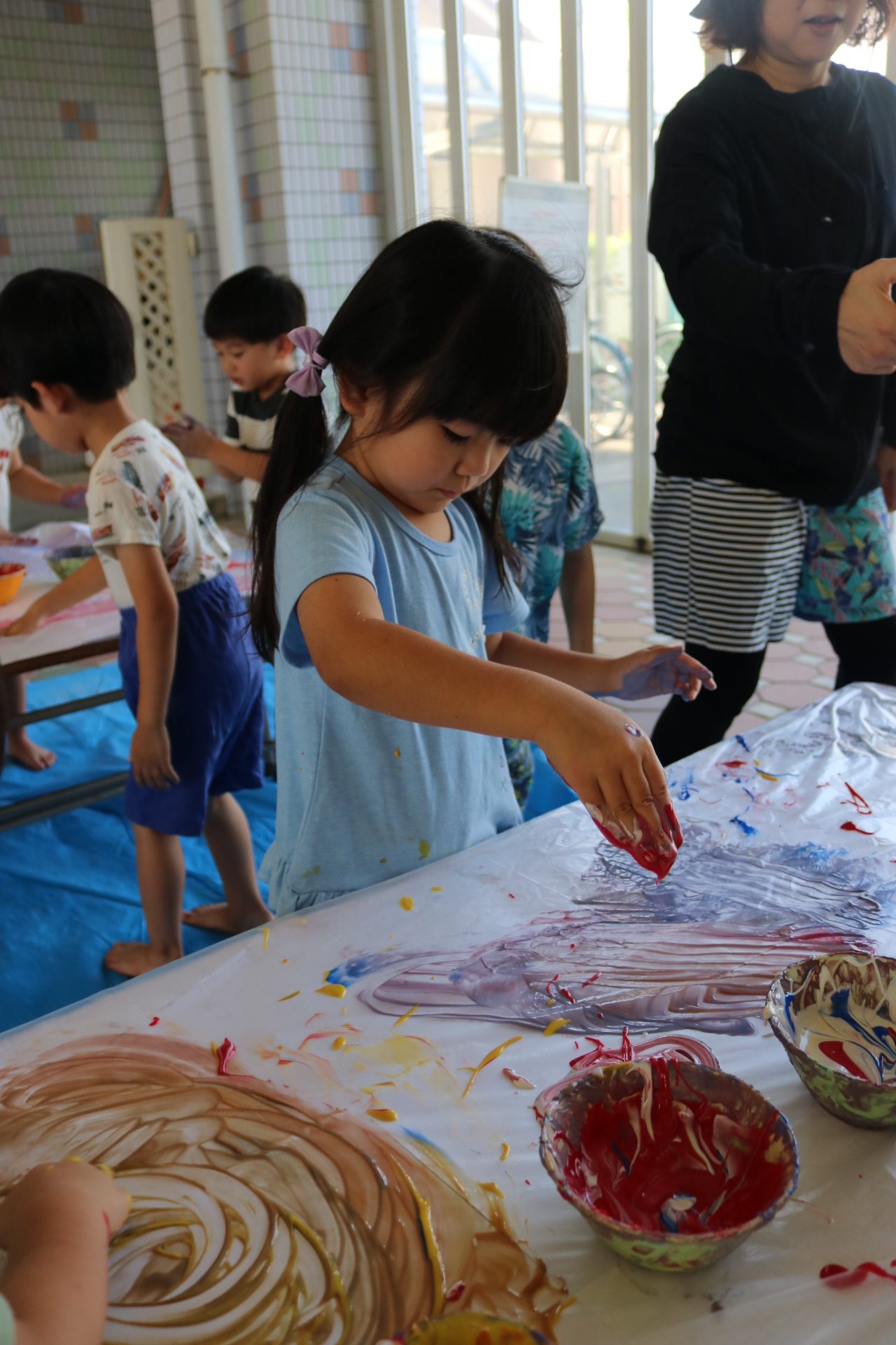 身体に付けて感触を楽しんだり、色を混ぜて色をつくったり・・・いろんな遊び方を楽しむ子どもたちでした。