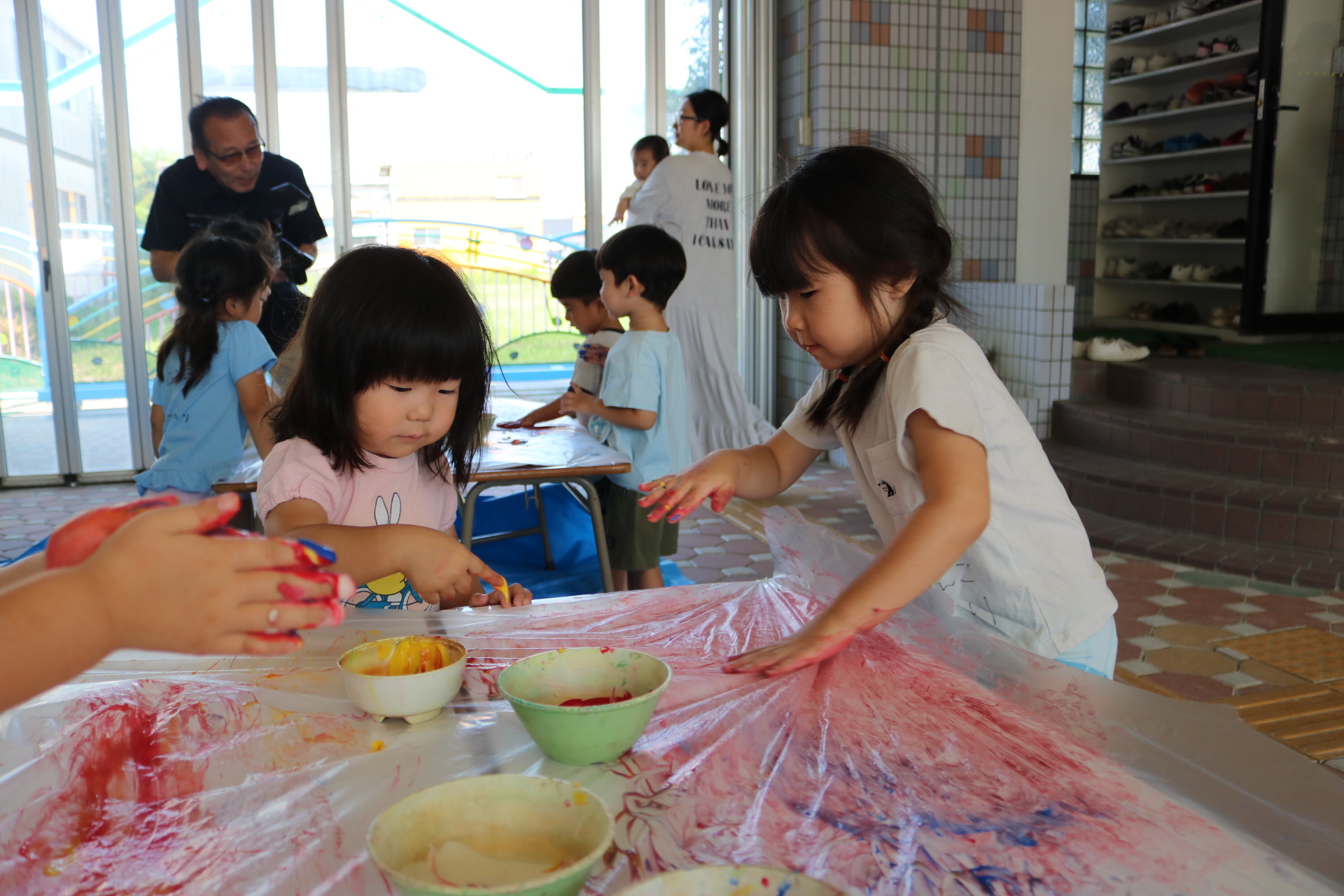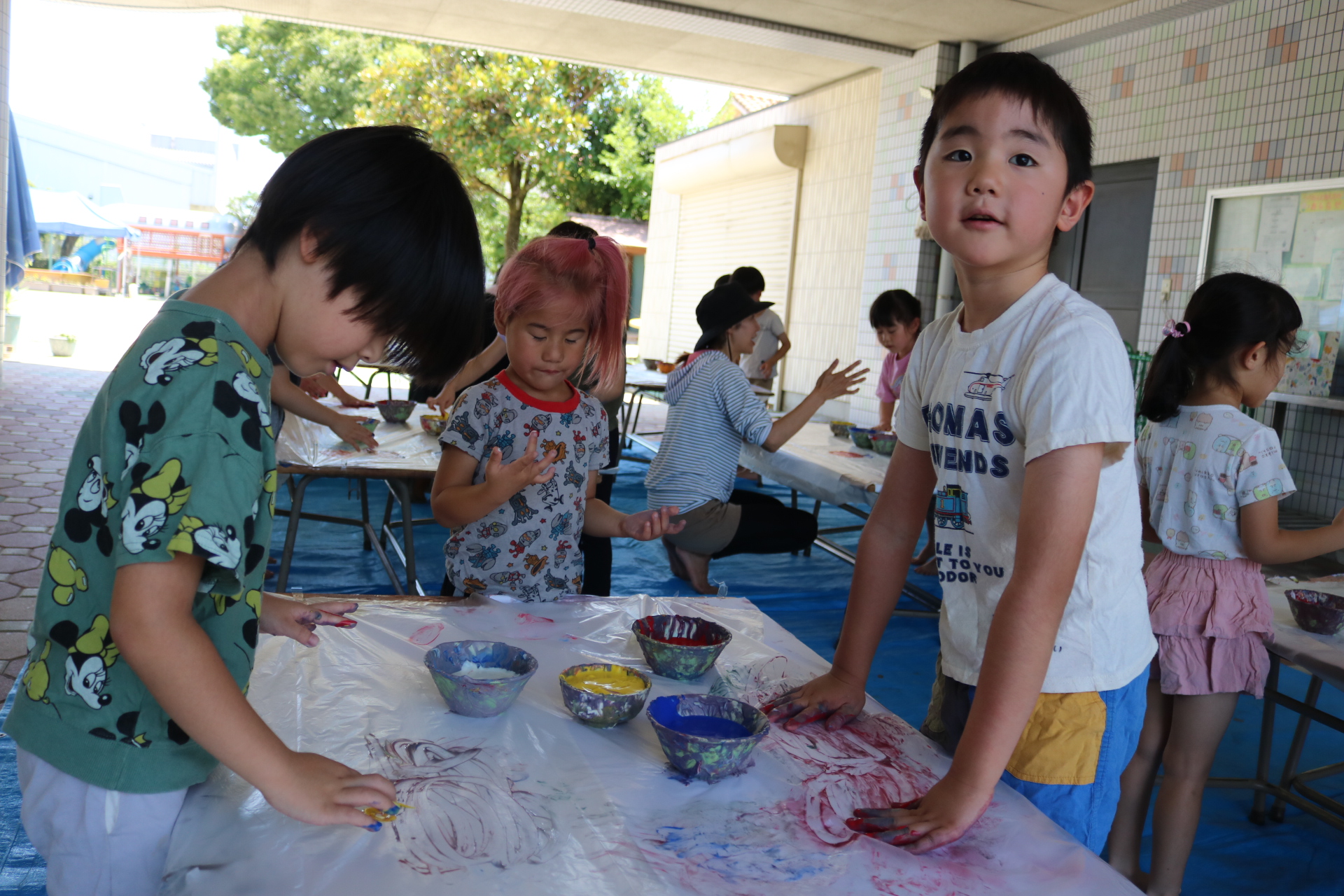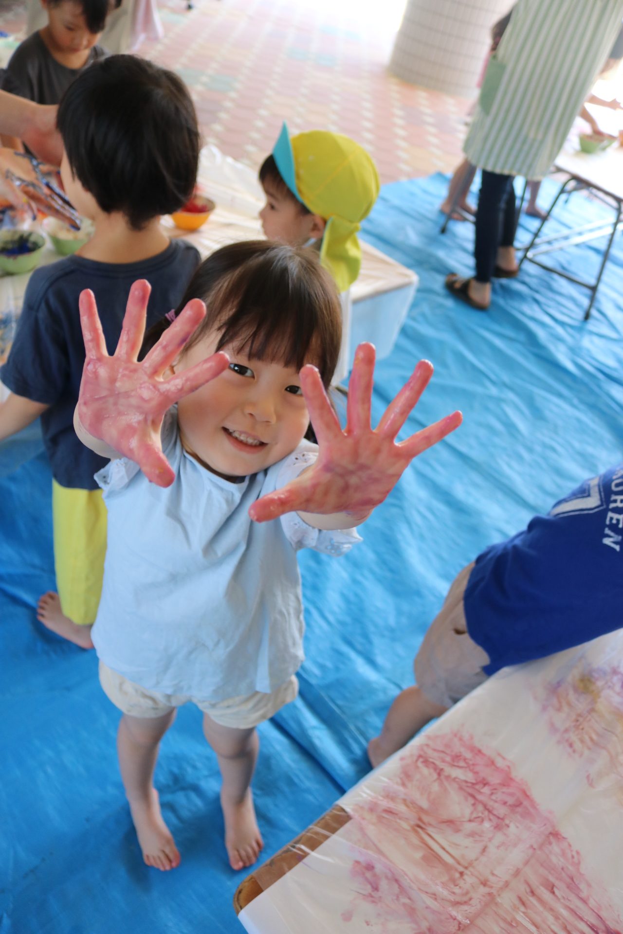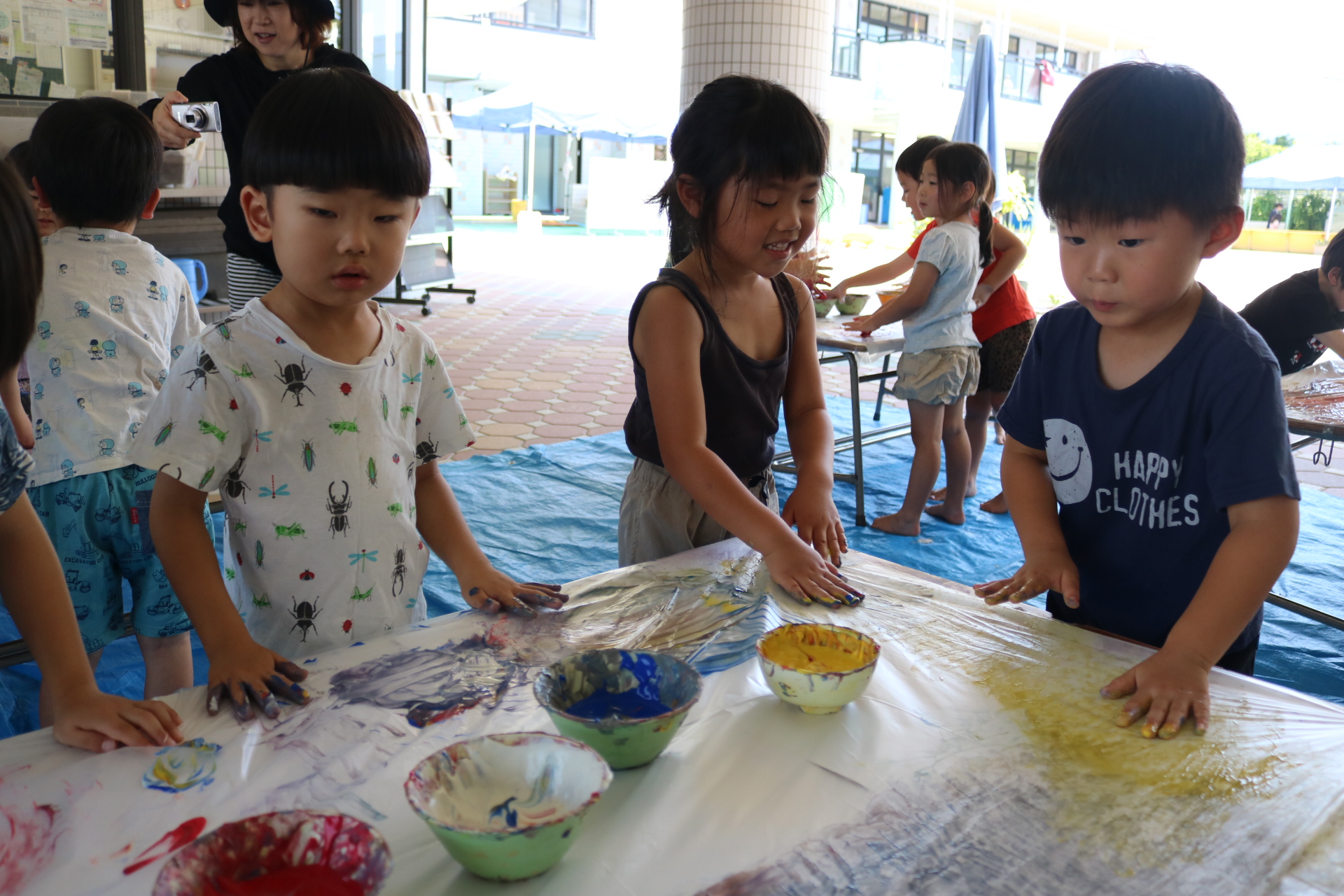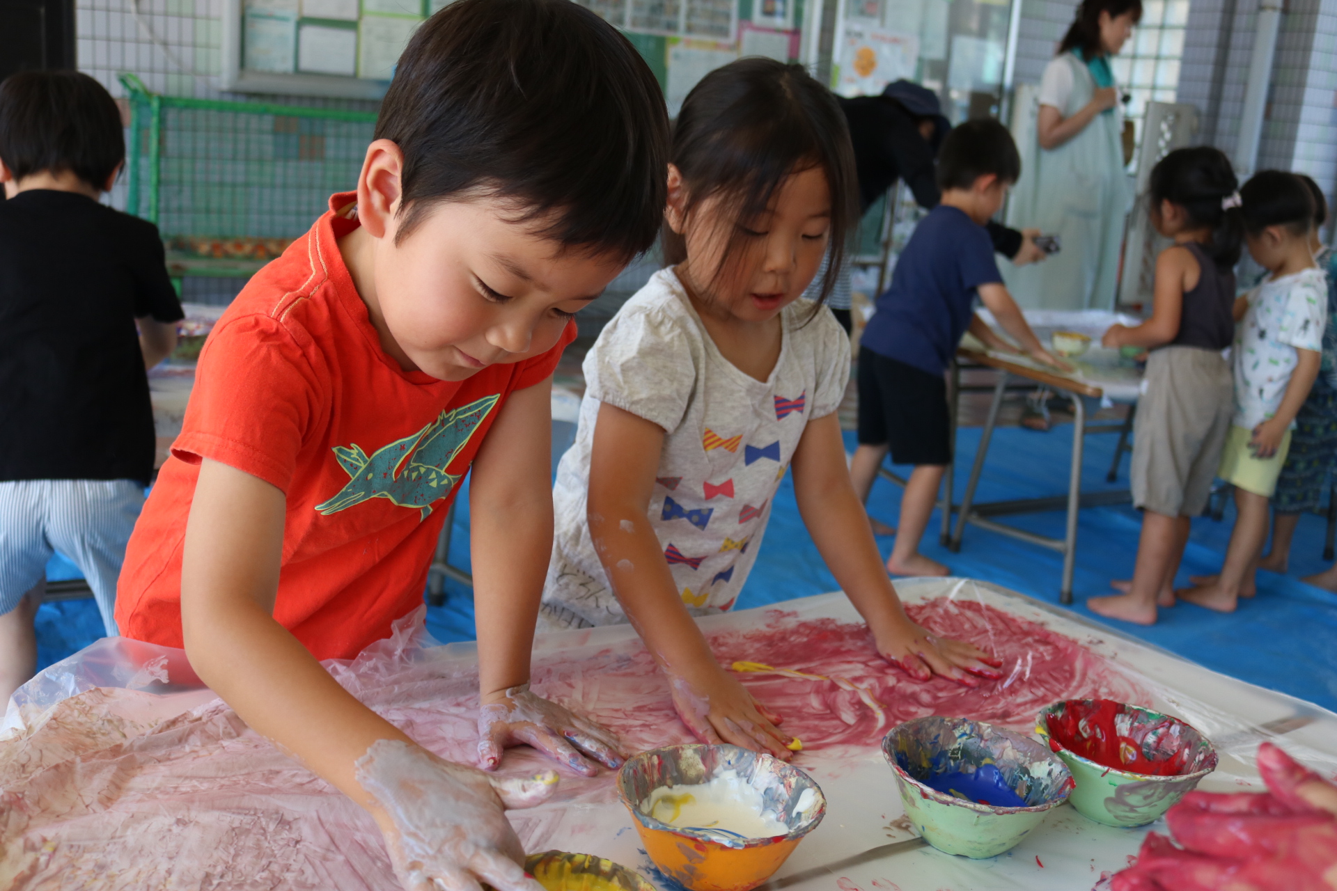 身体に付けて感触を楽しんだり、色を混ぜて色をつくったり・・・いろんな遊び方を楽しむ子どもたちでした。