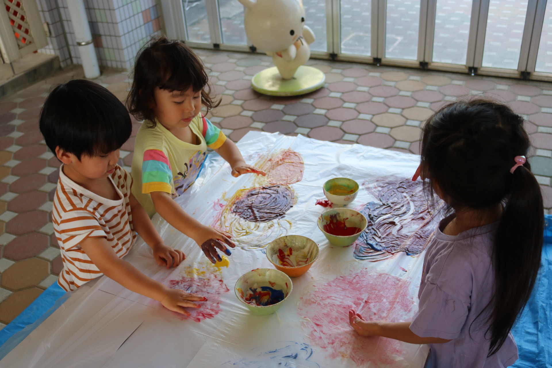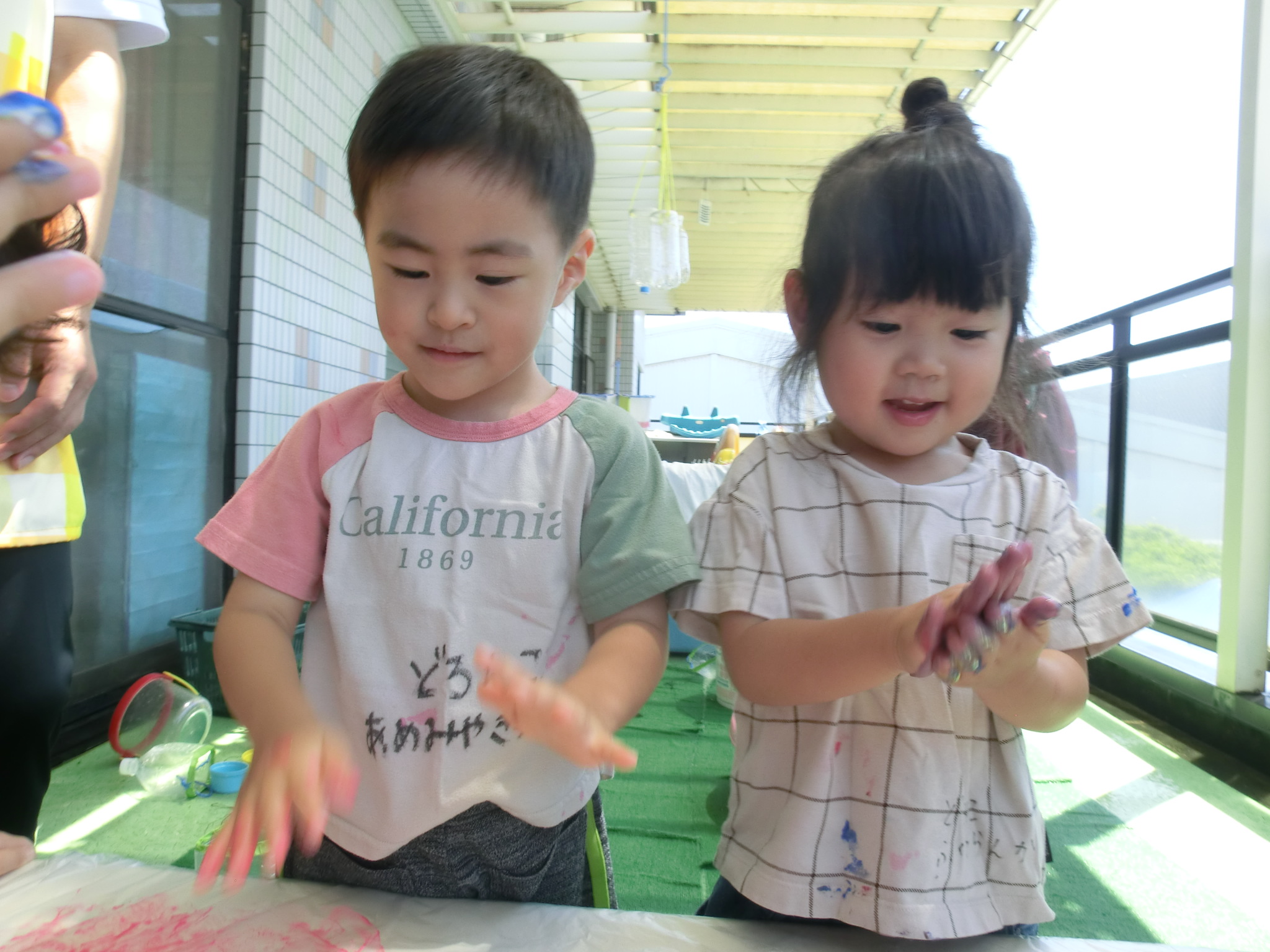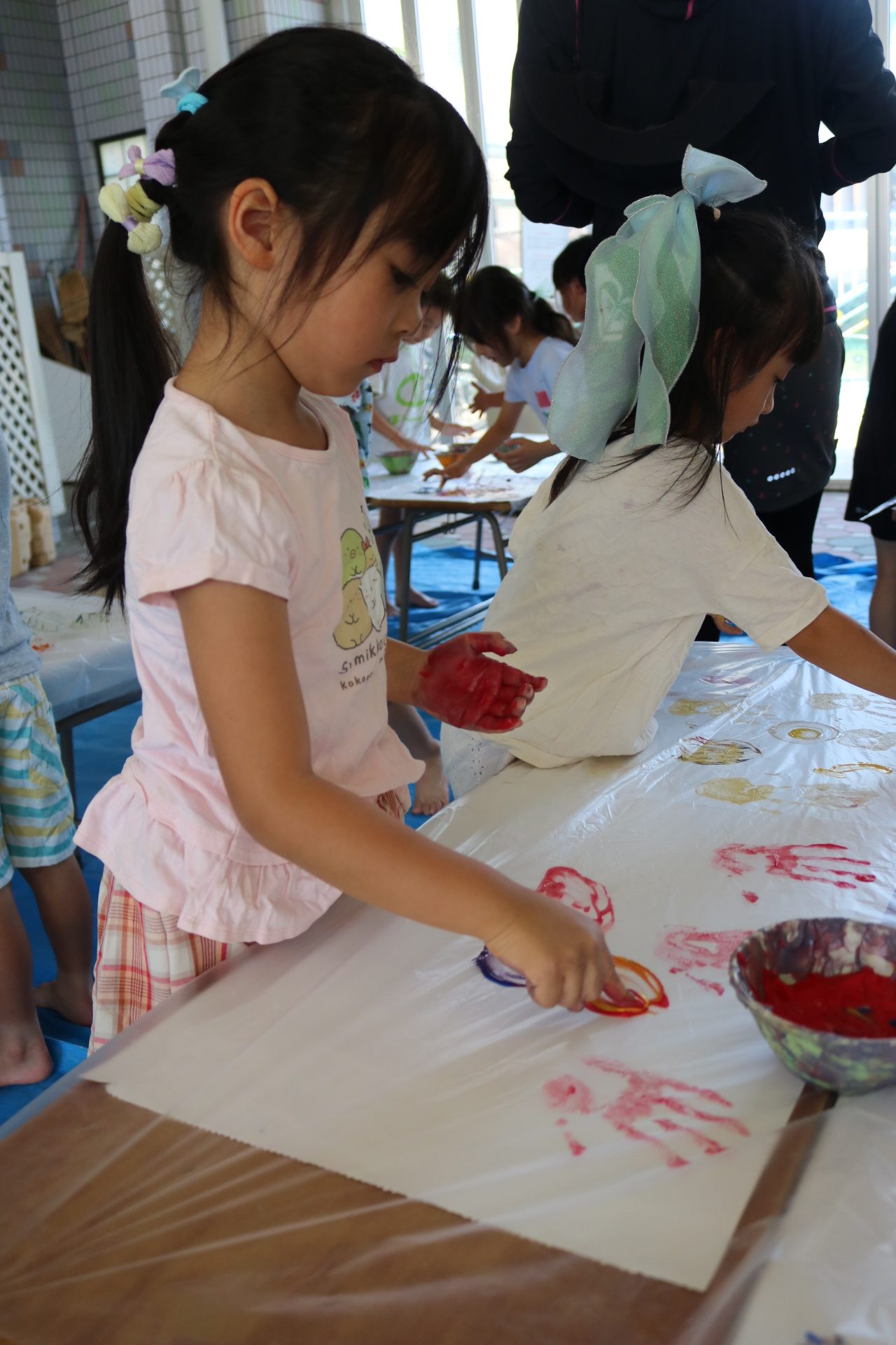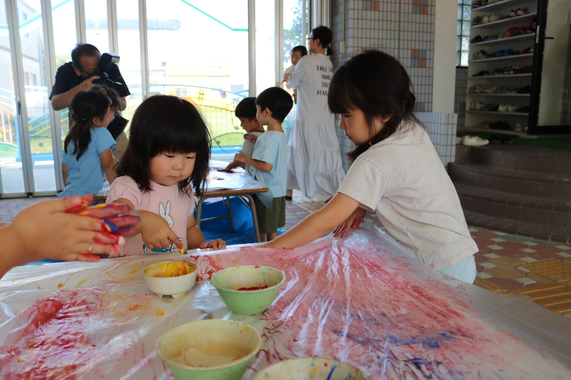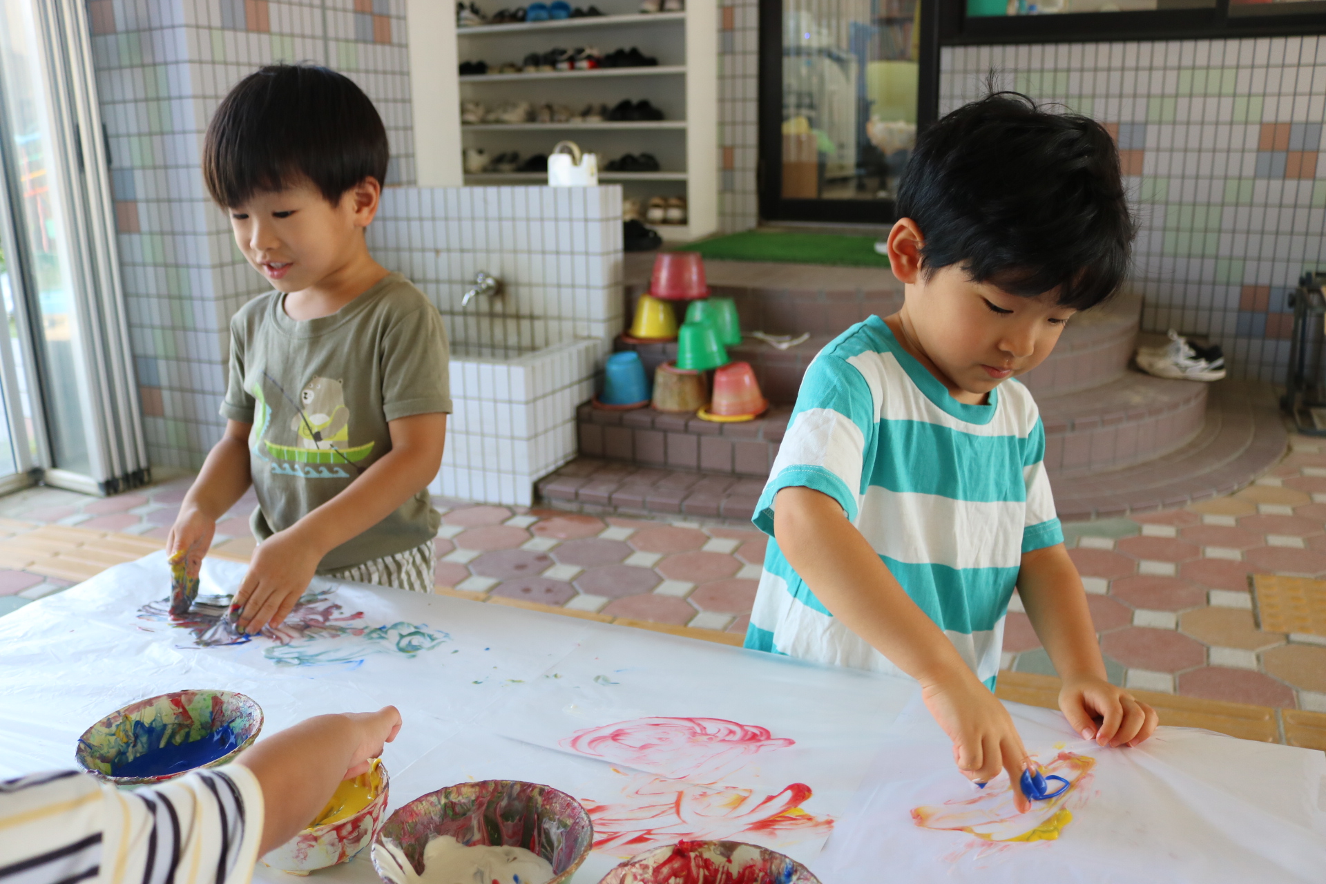 身体に付けて感触を楽しんだり、色を混ぜて色をつくったり・・・いろんな遊び方を楽しむ子どもたちでした。