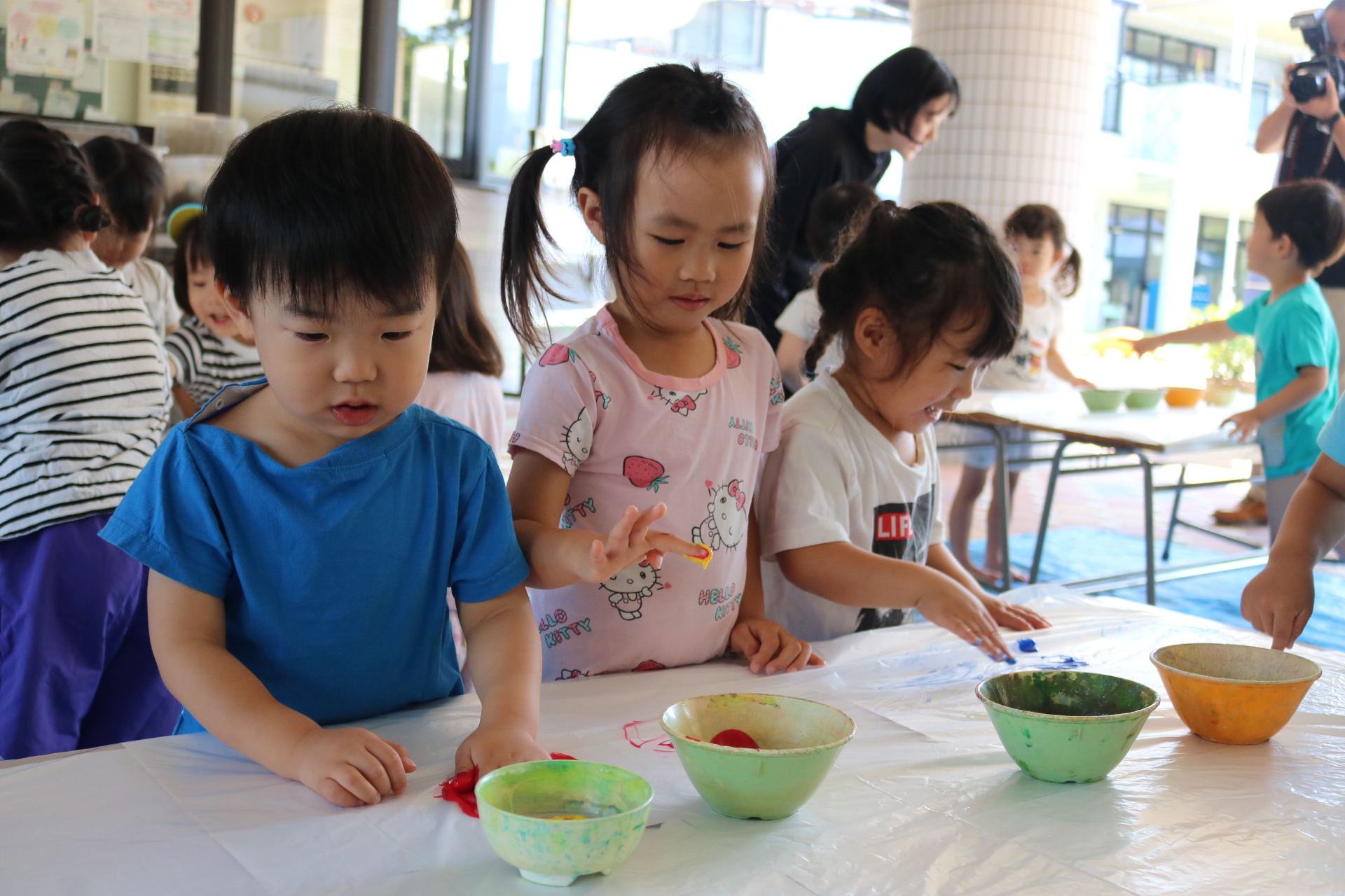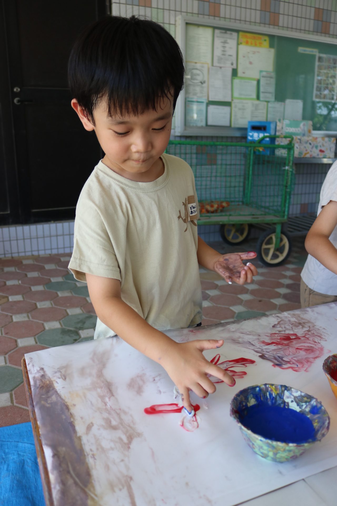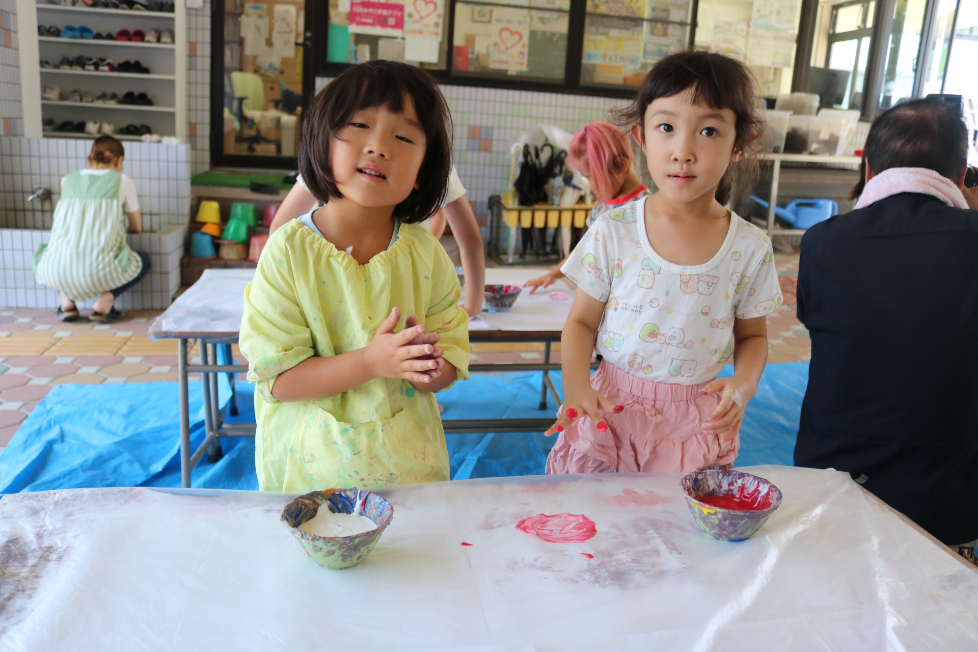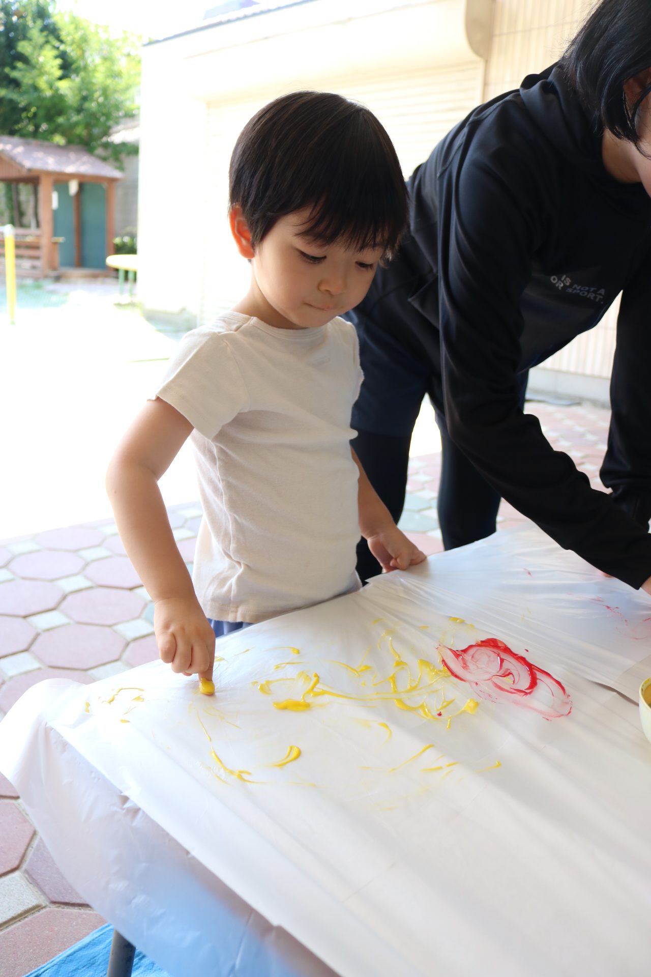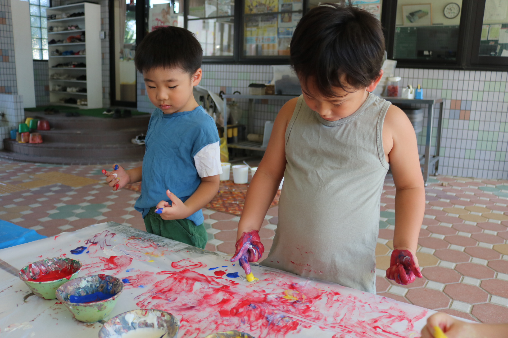 身体に付けて感触を楽しんだり、色を混ぜて色をつくったり・・・いろんな遊び方を楽しむ子どもたちでした。