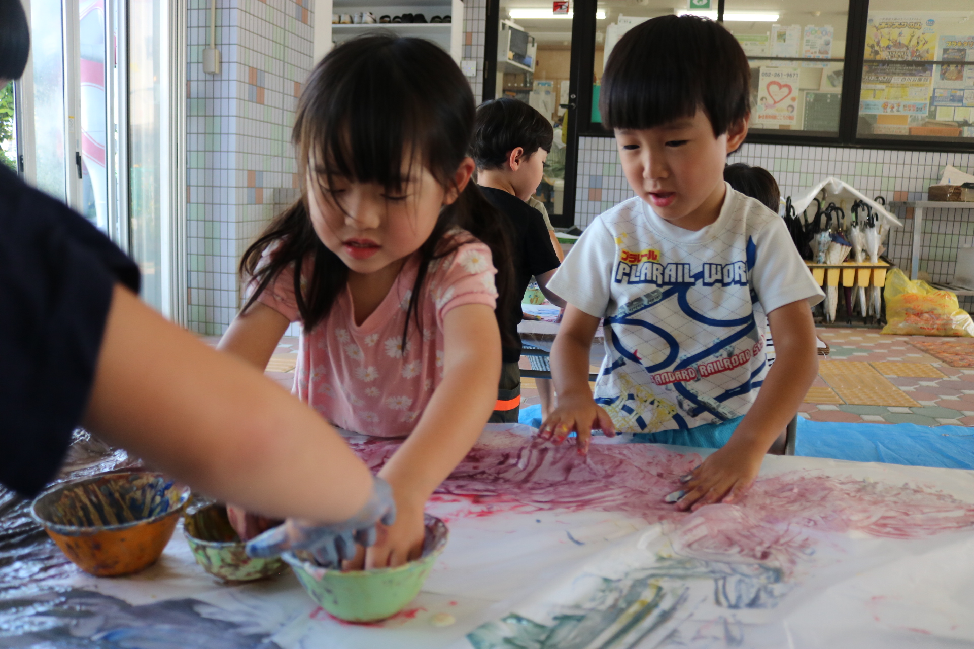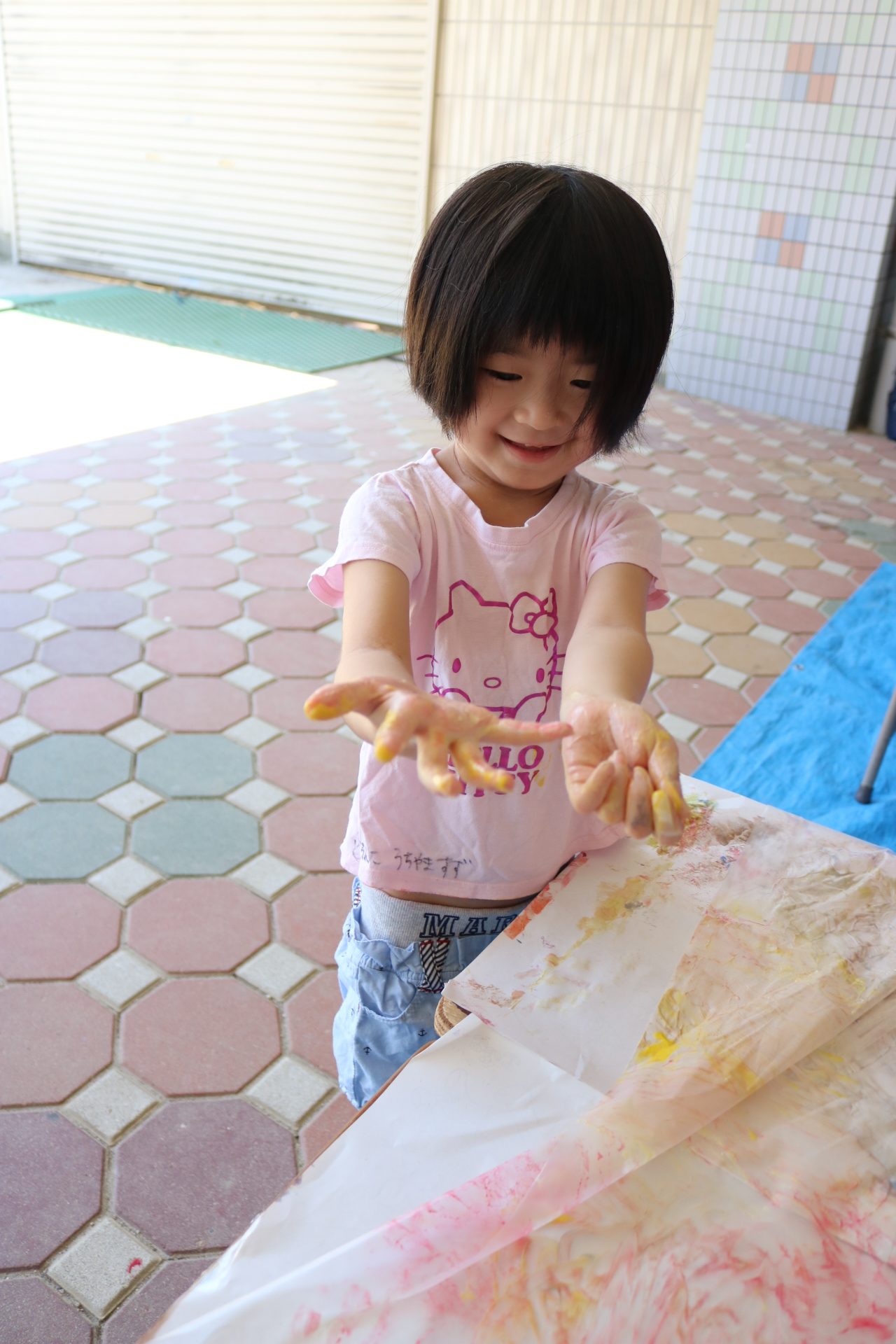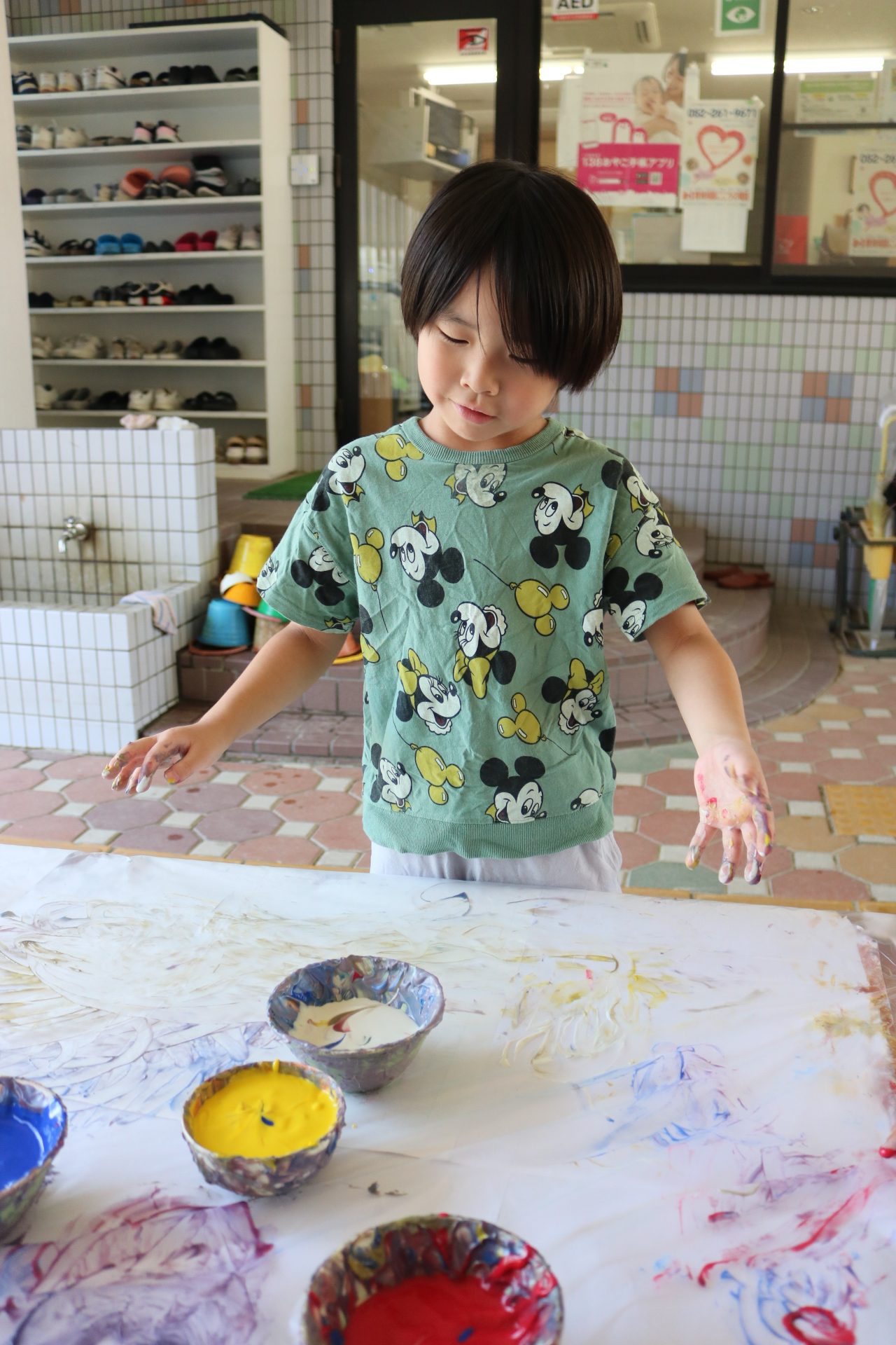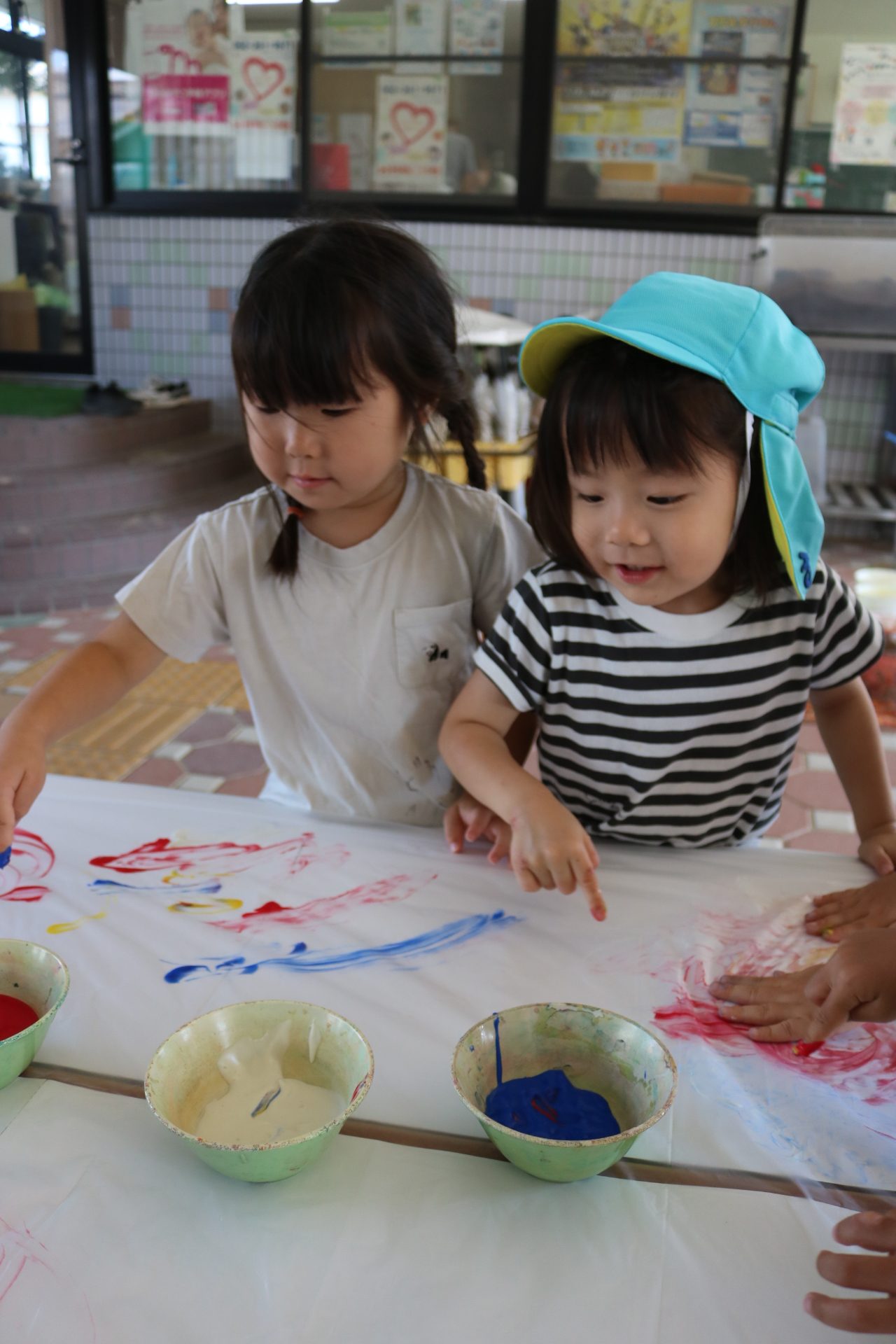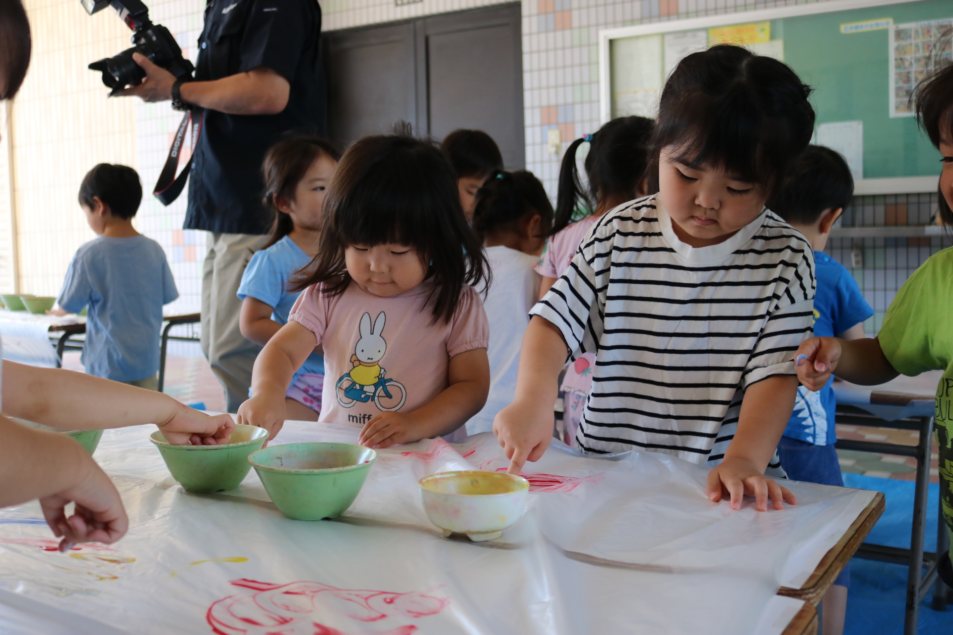 身体に付けて感触を楽しんだり、色を混ぜて色をつくったり・・・いろんな遊び方を楽しむ子どもたちでした。
