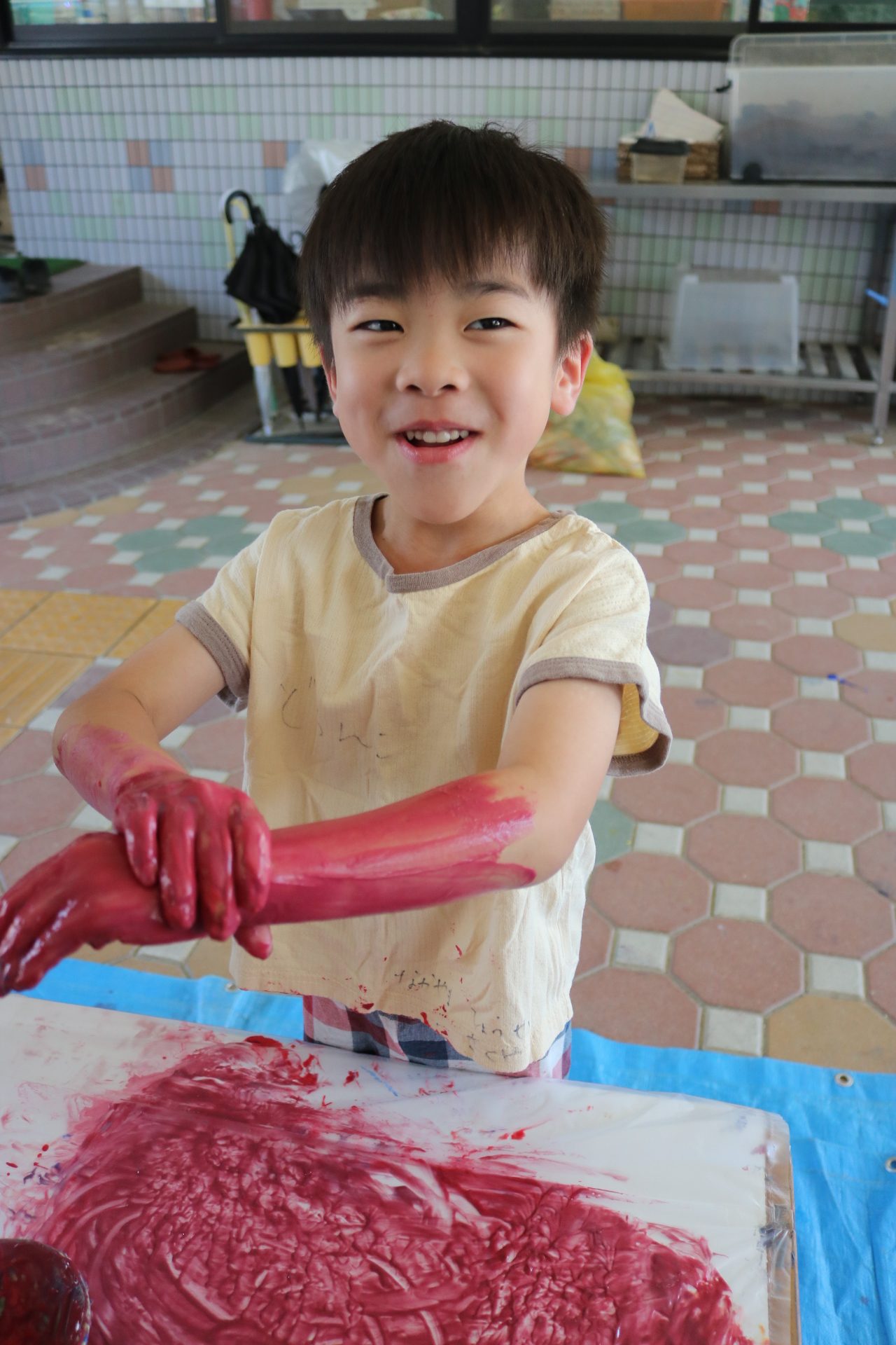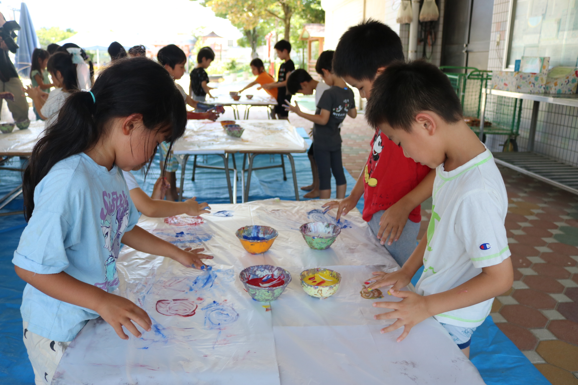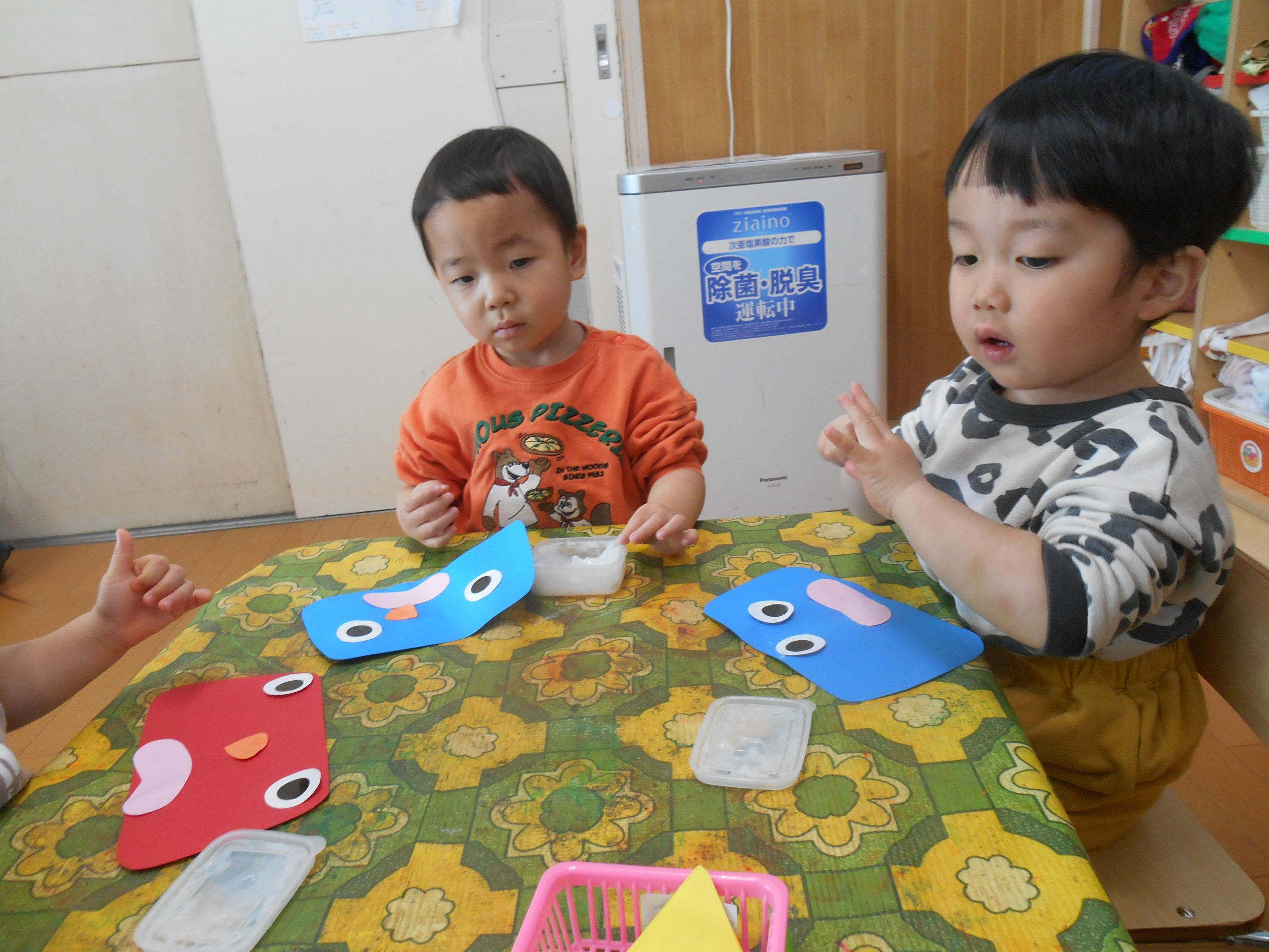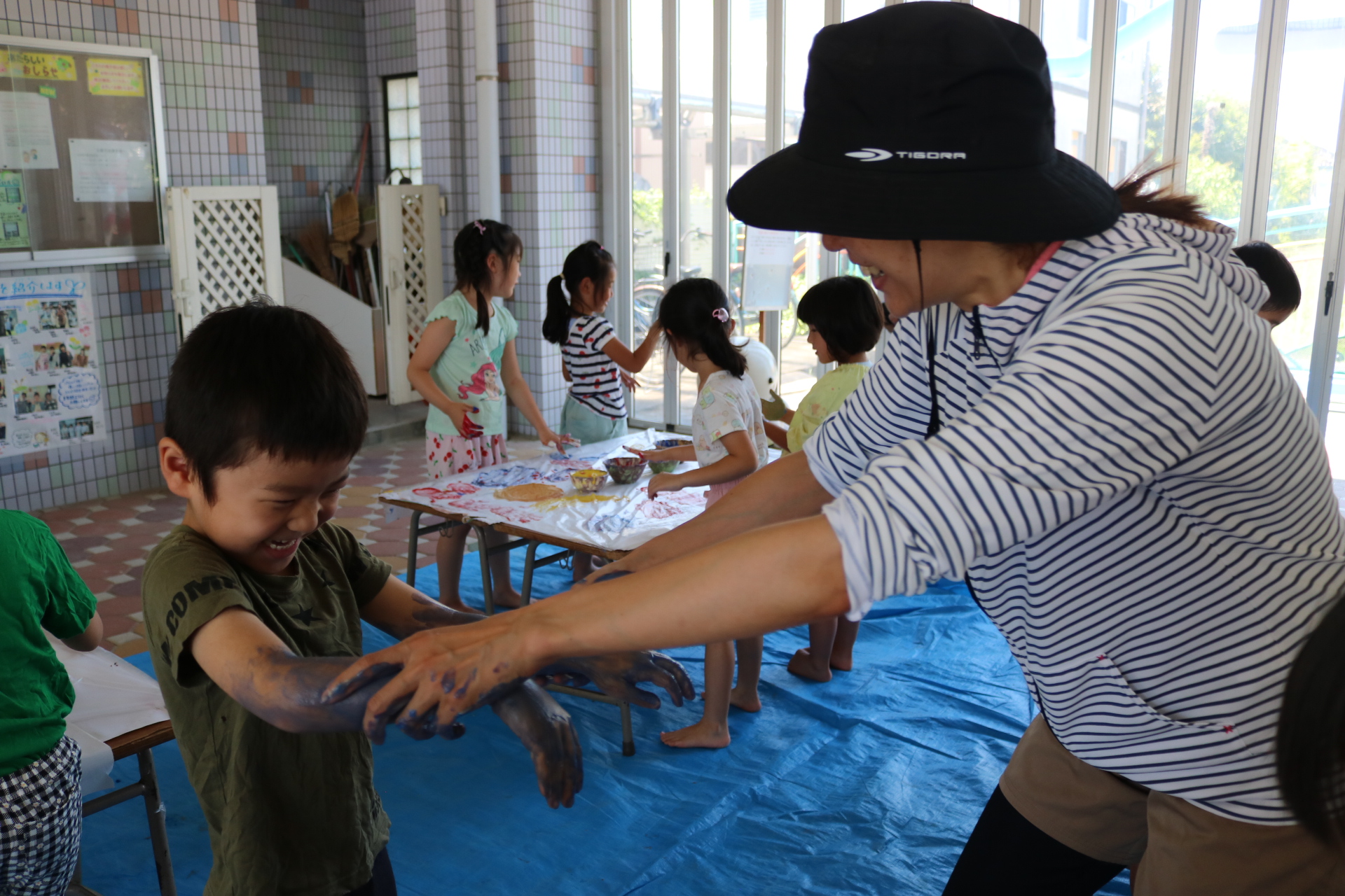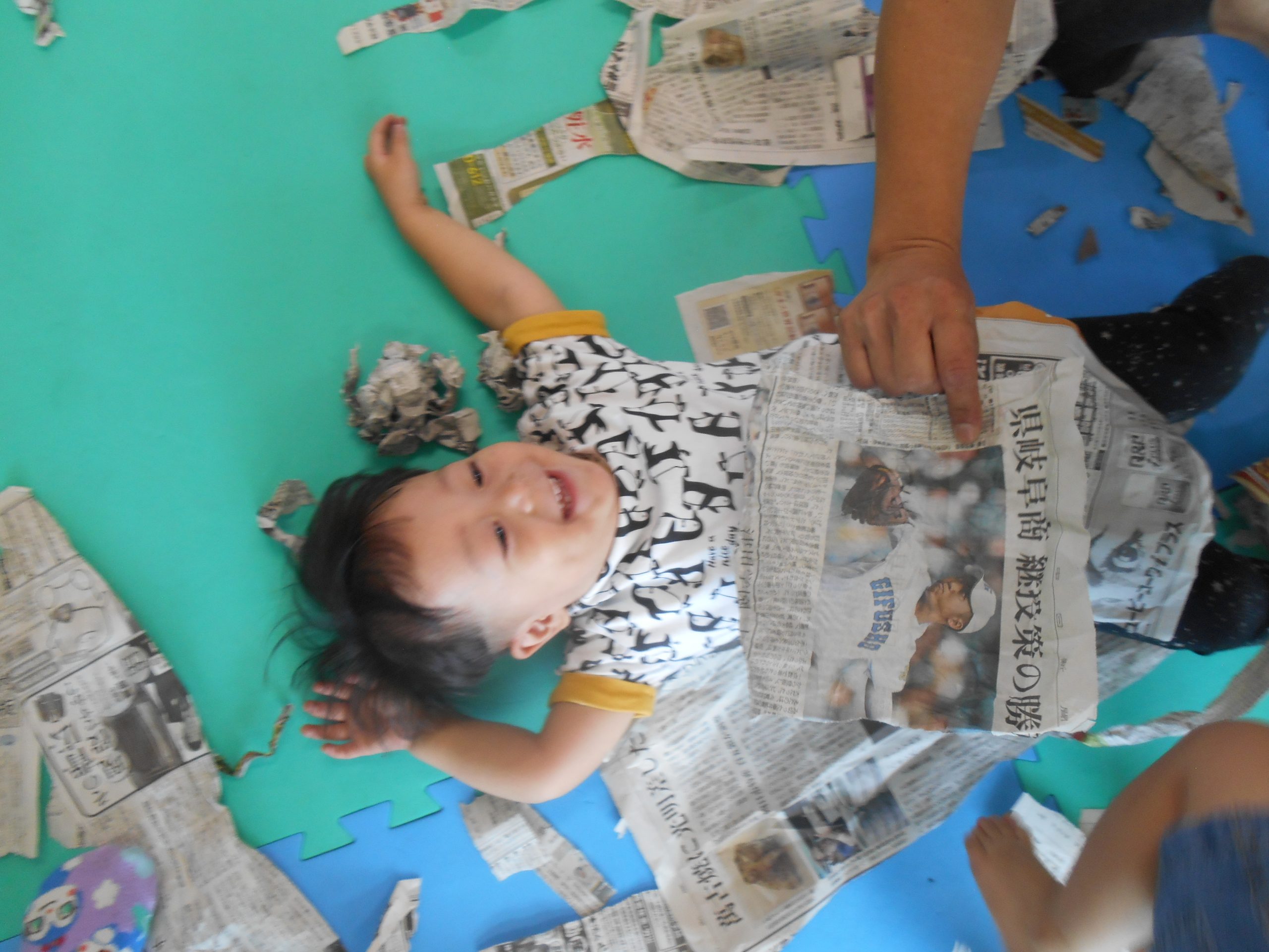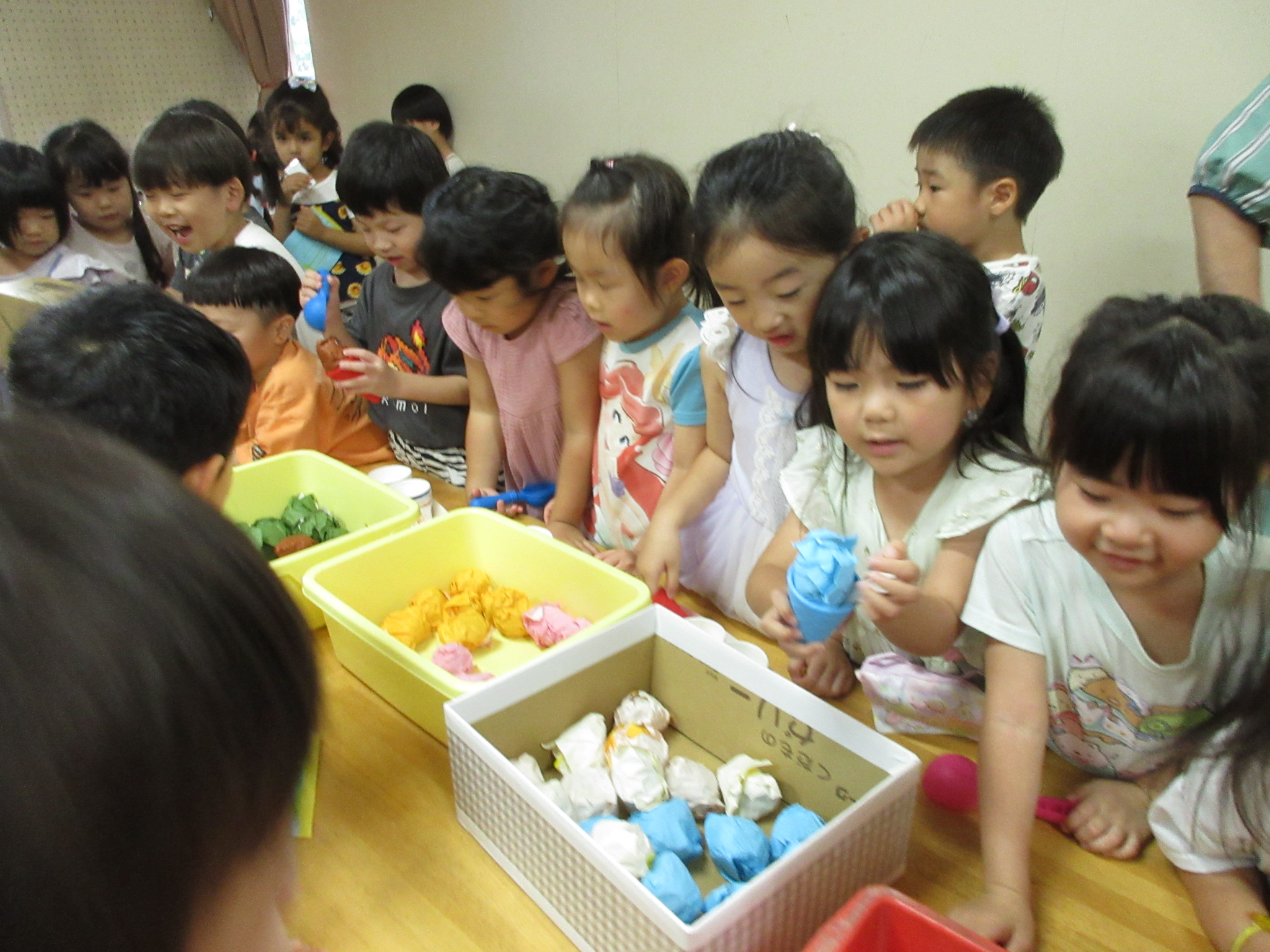 身体に付けて感触を楽しんだり、色を混ぜて色をつくったり・・・いろんな遊び方を楽しむ子どもたちでした。