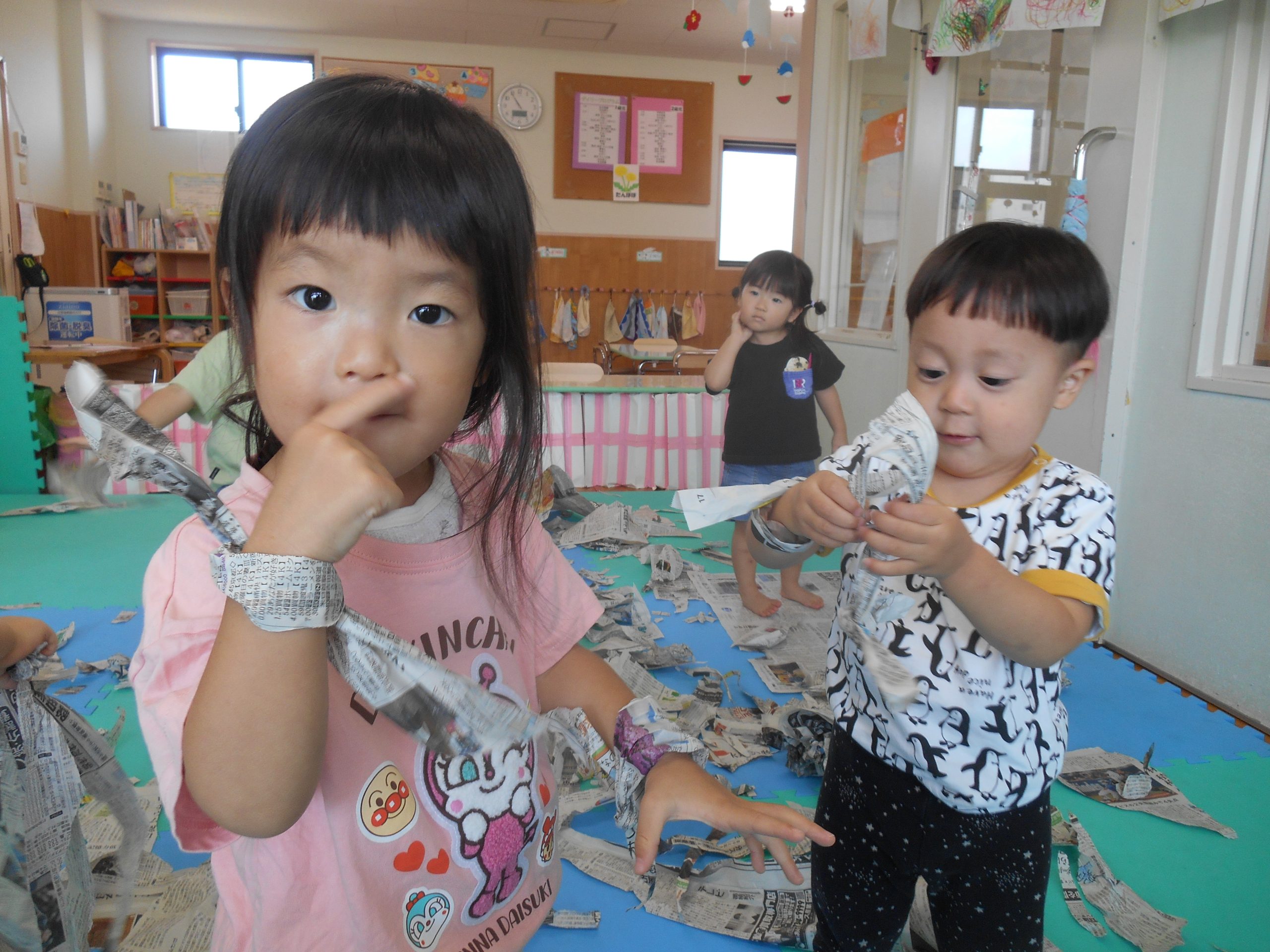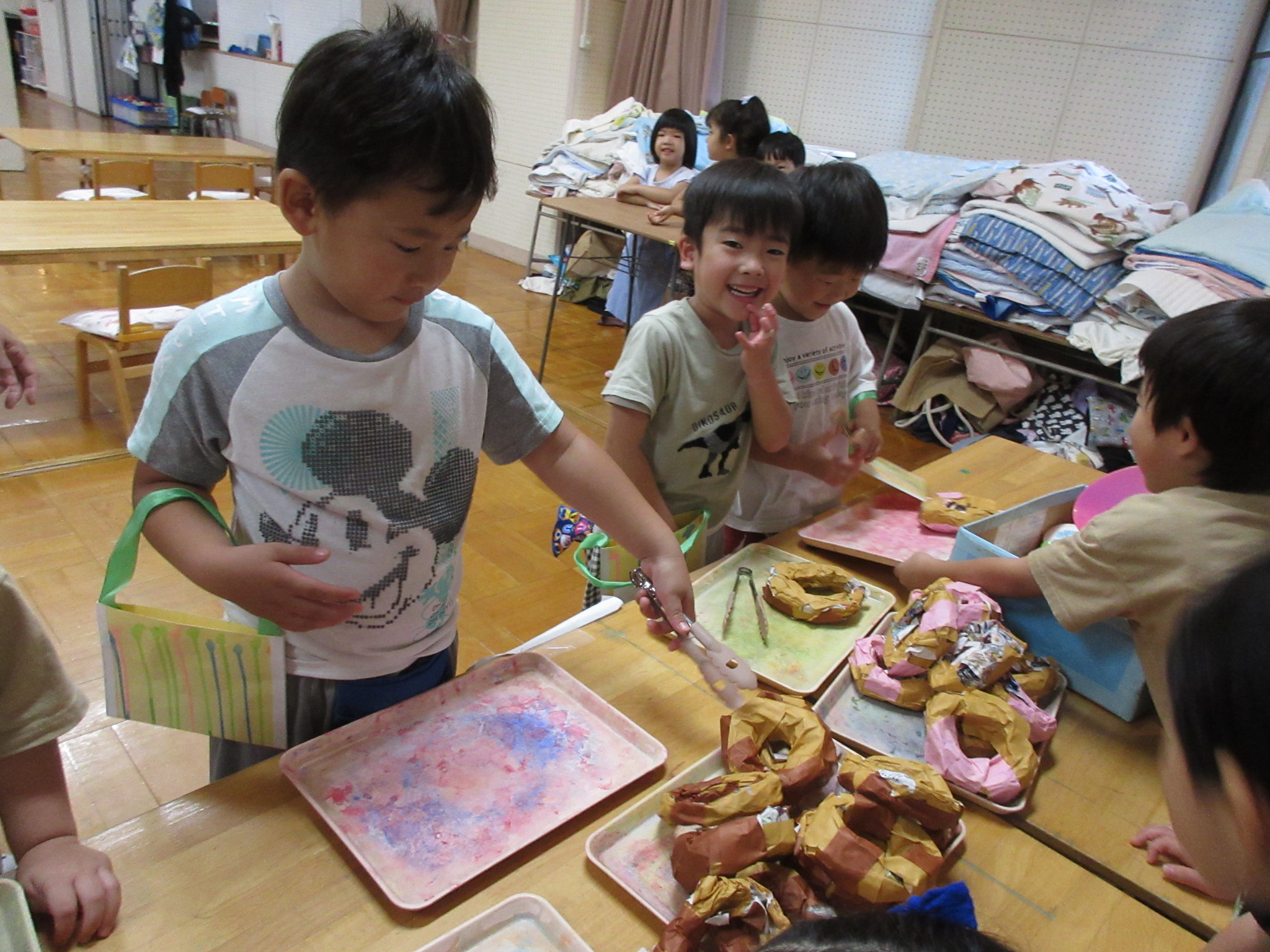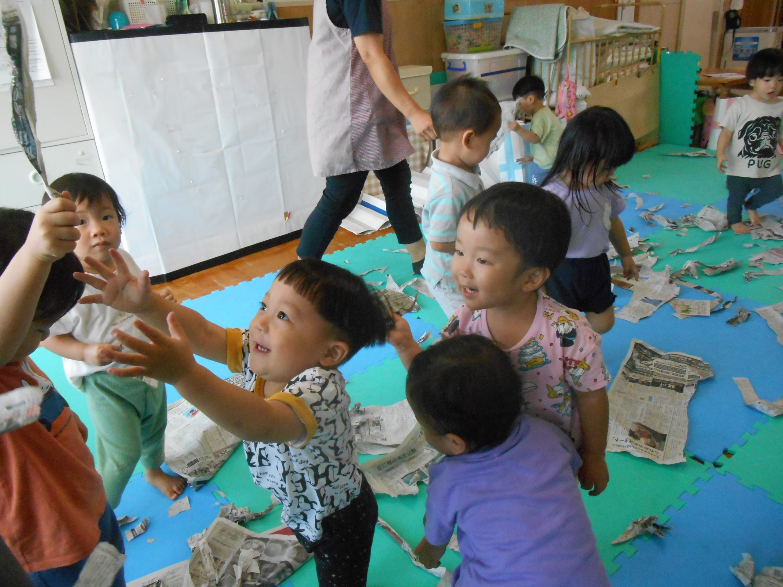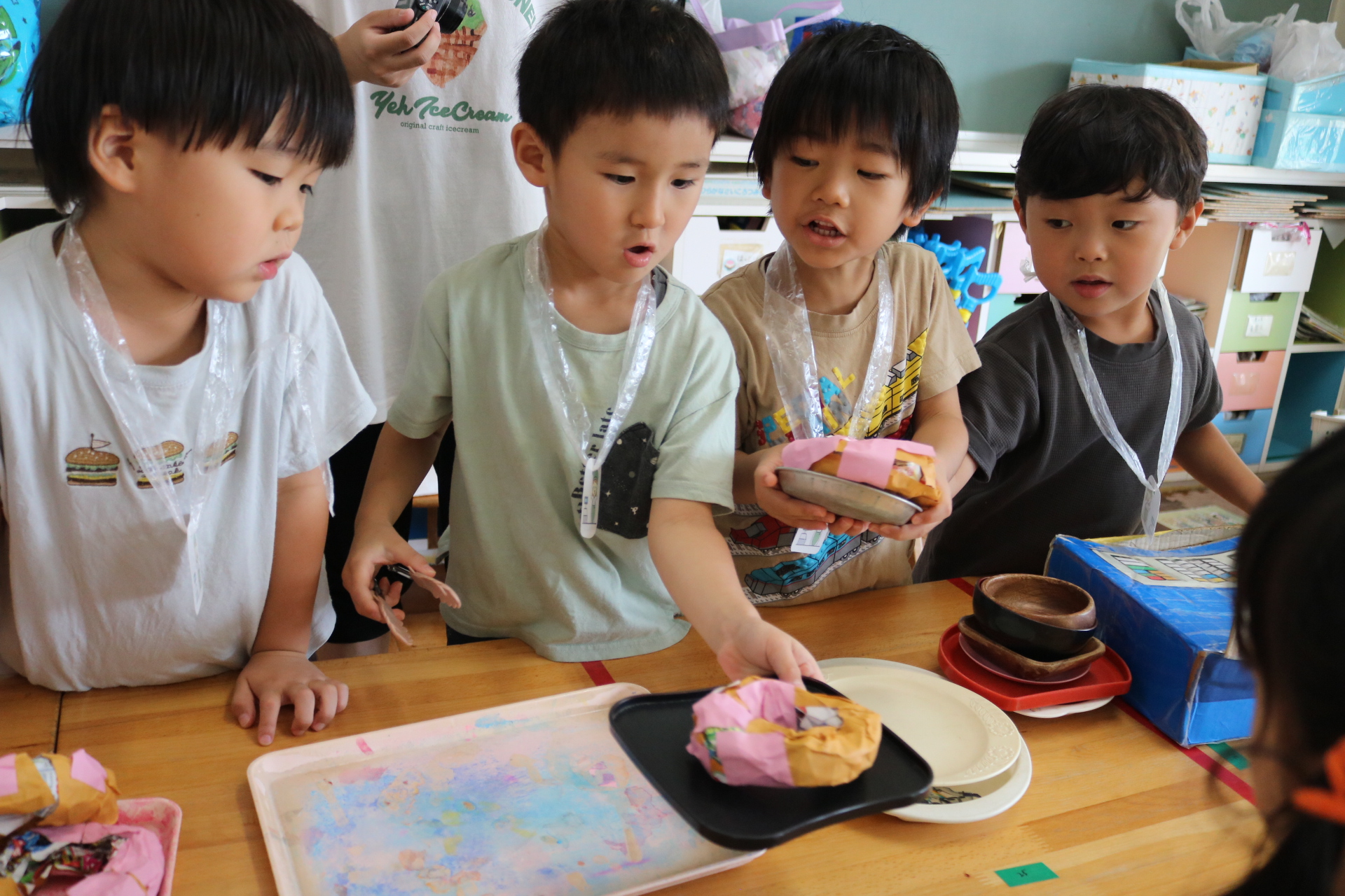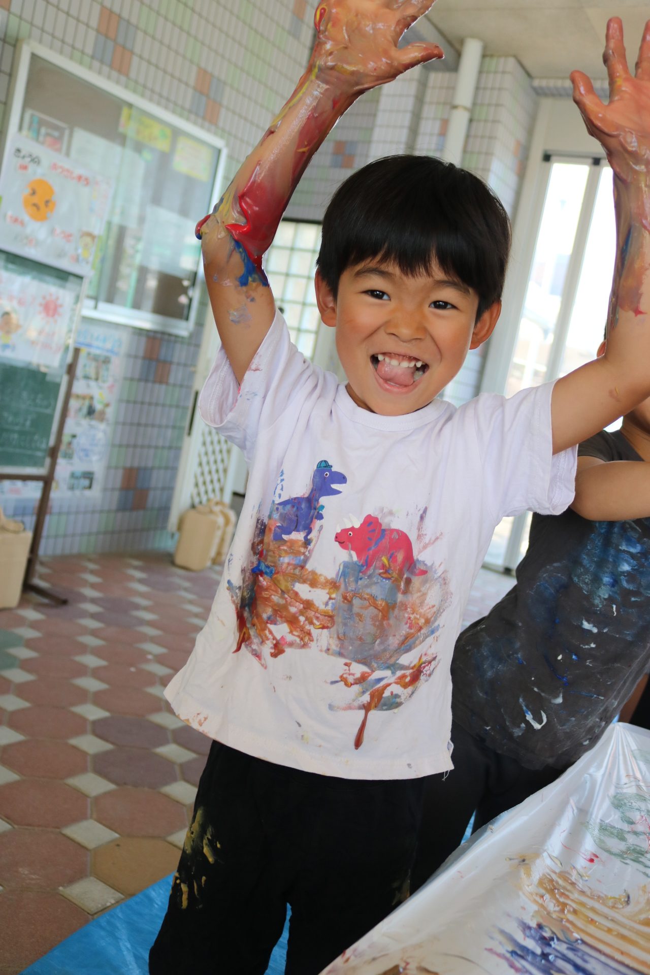 身体に付けて感触を楽しんだり、色を混ぜて色をつくったり・・・いろんな遊び方を楽しむ子どもたちでした。