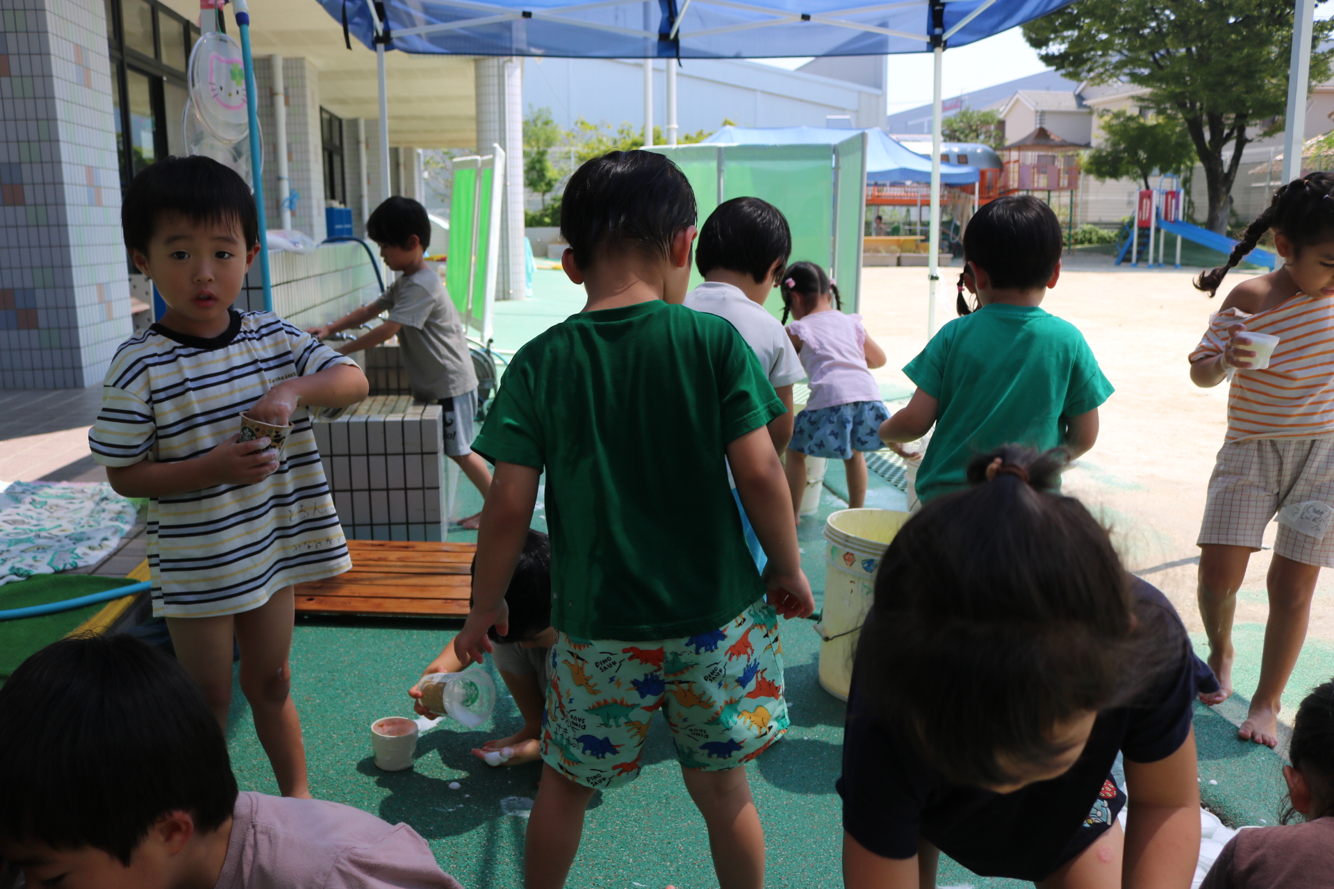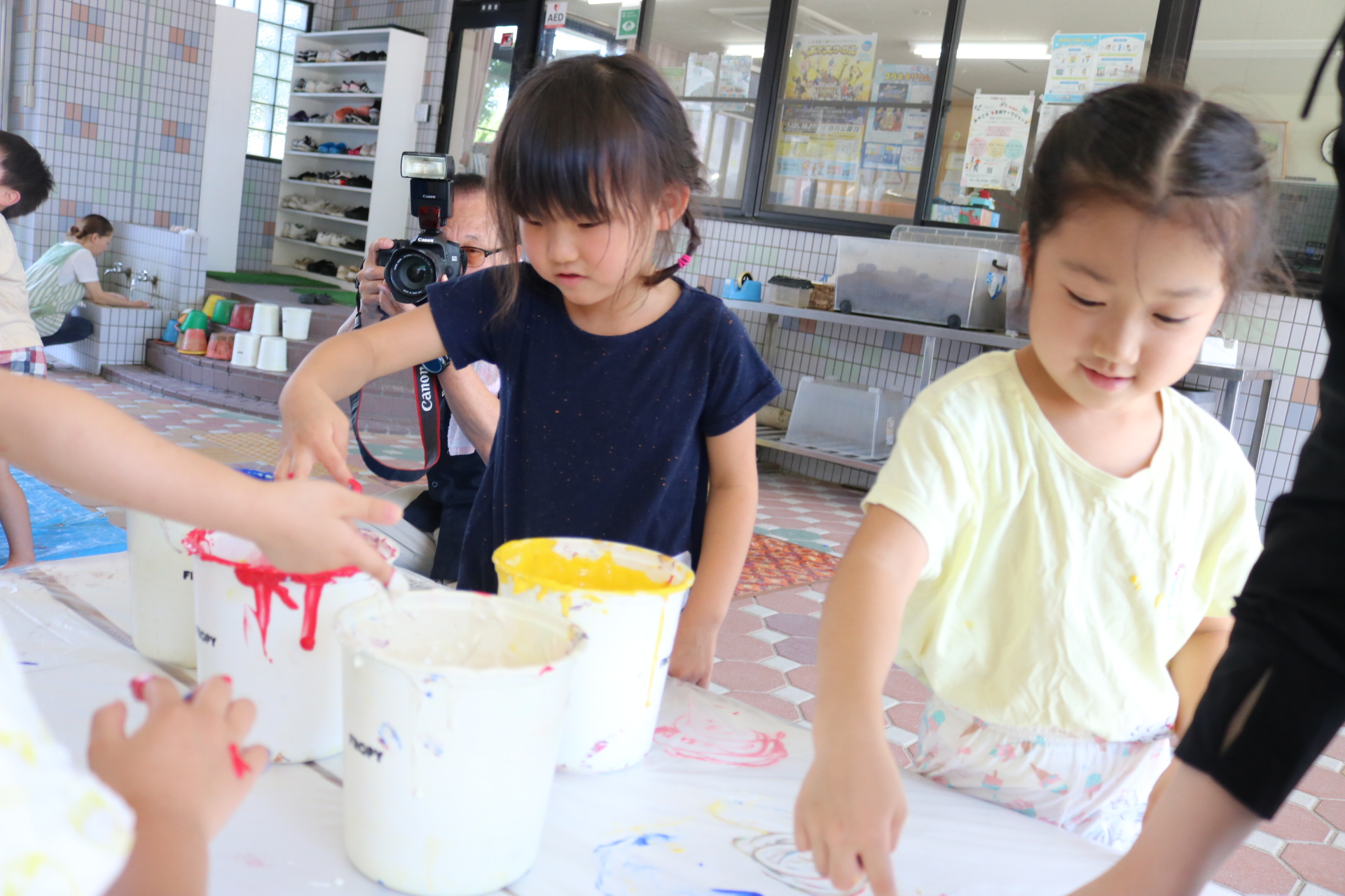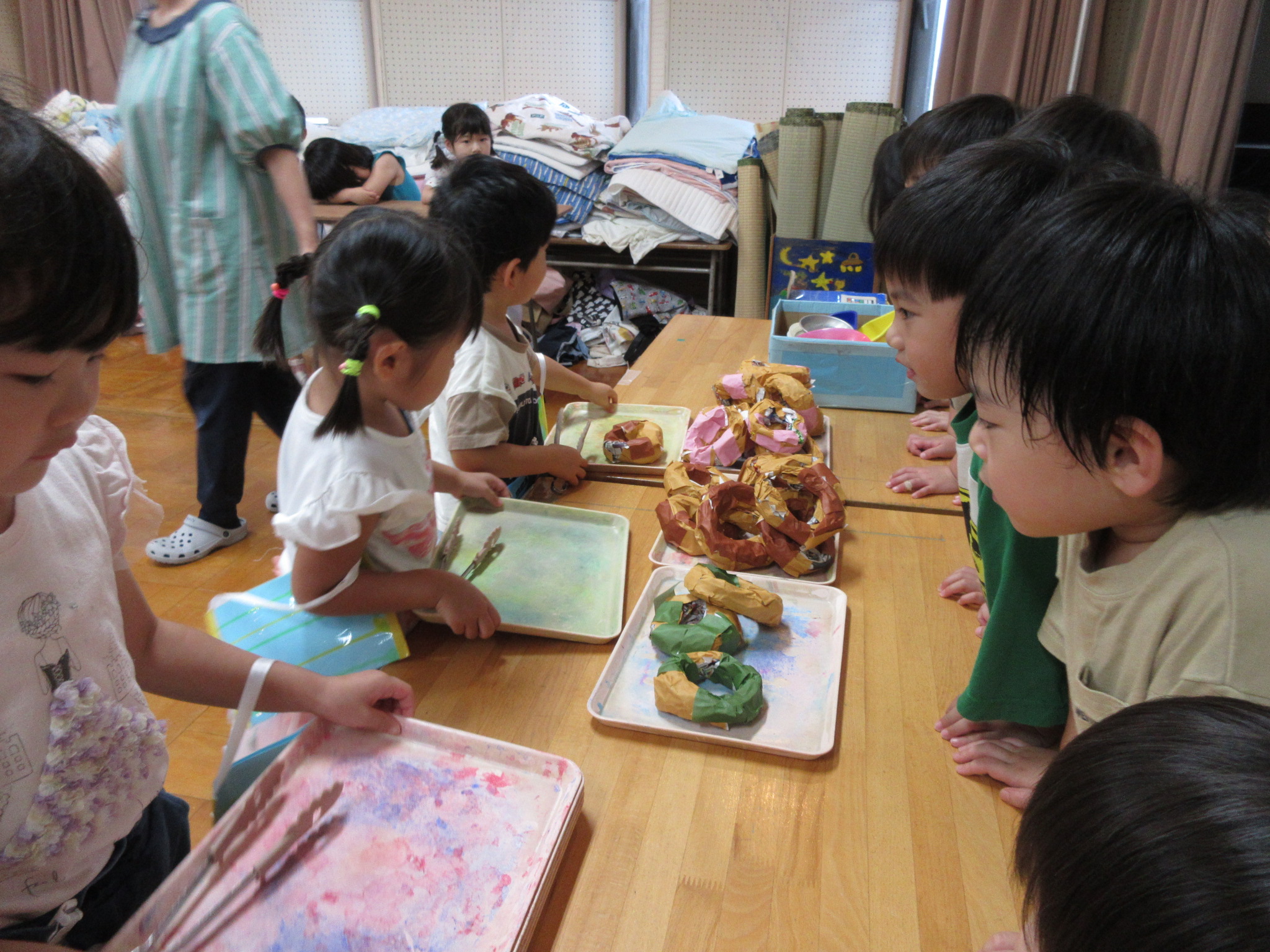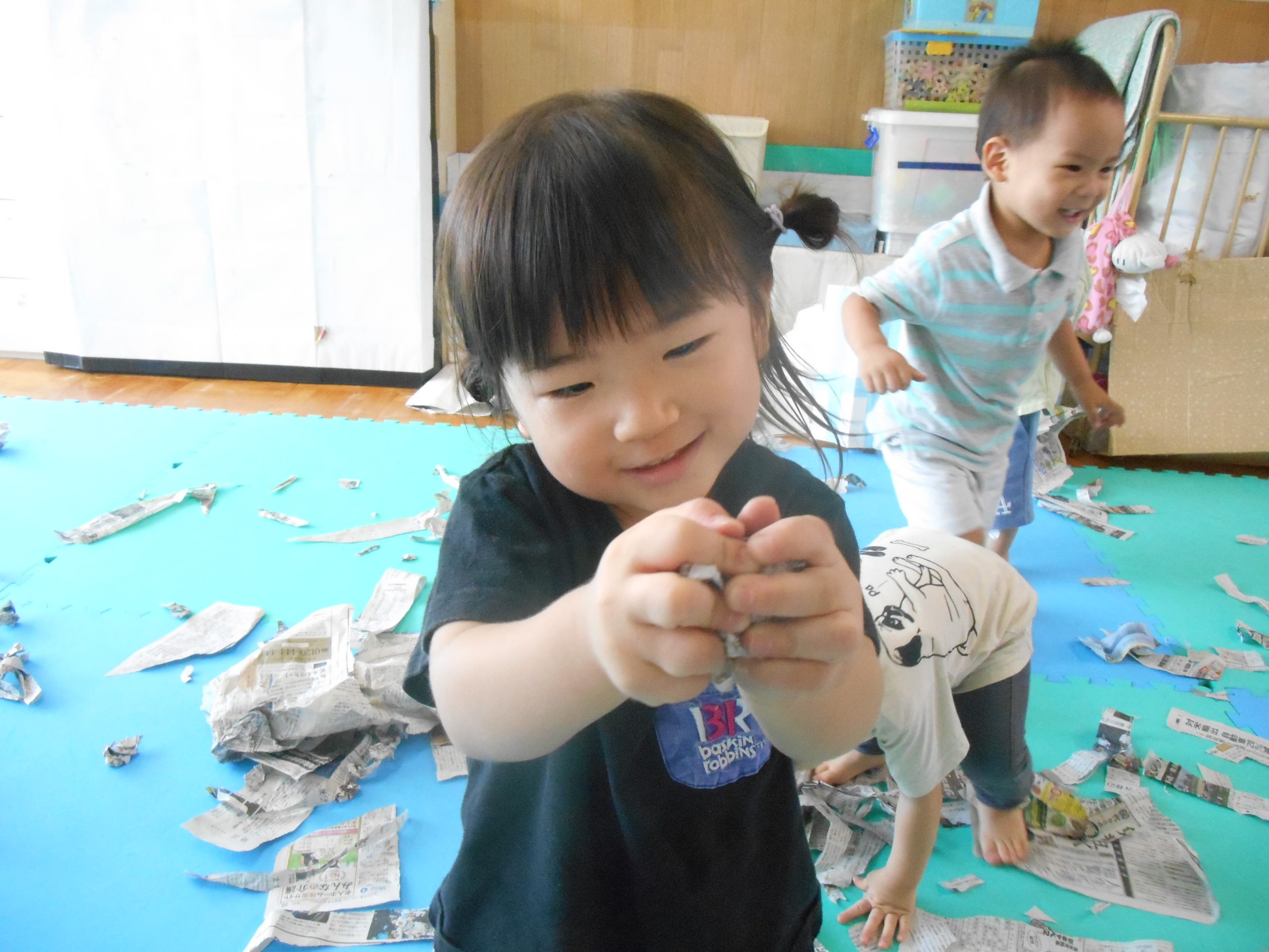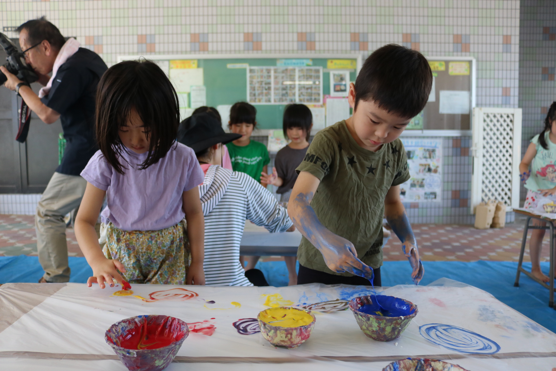 身体に付けて感触を楽しんだり、色を混ぜて色をつくったり・・・いろんな遊び方を楽しむ子どもたちでした。