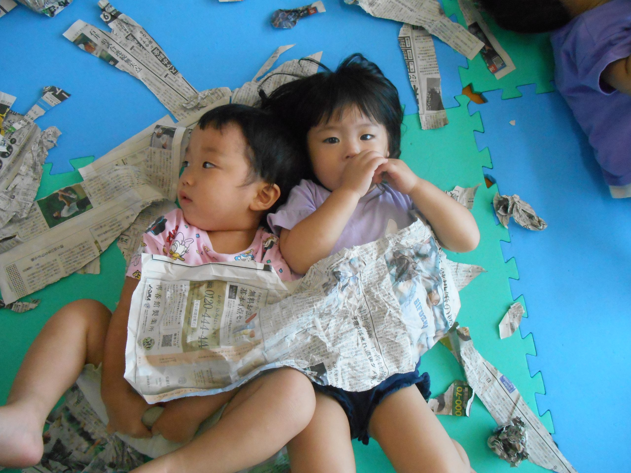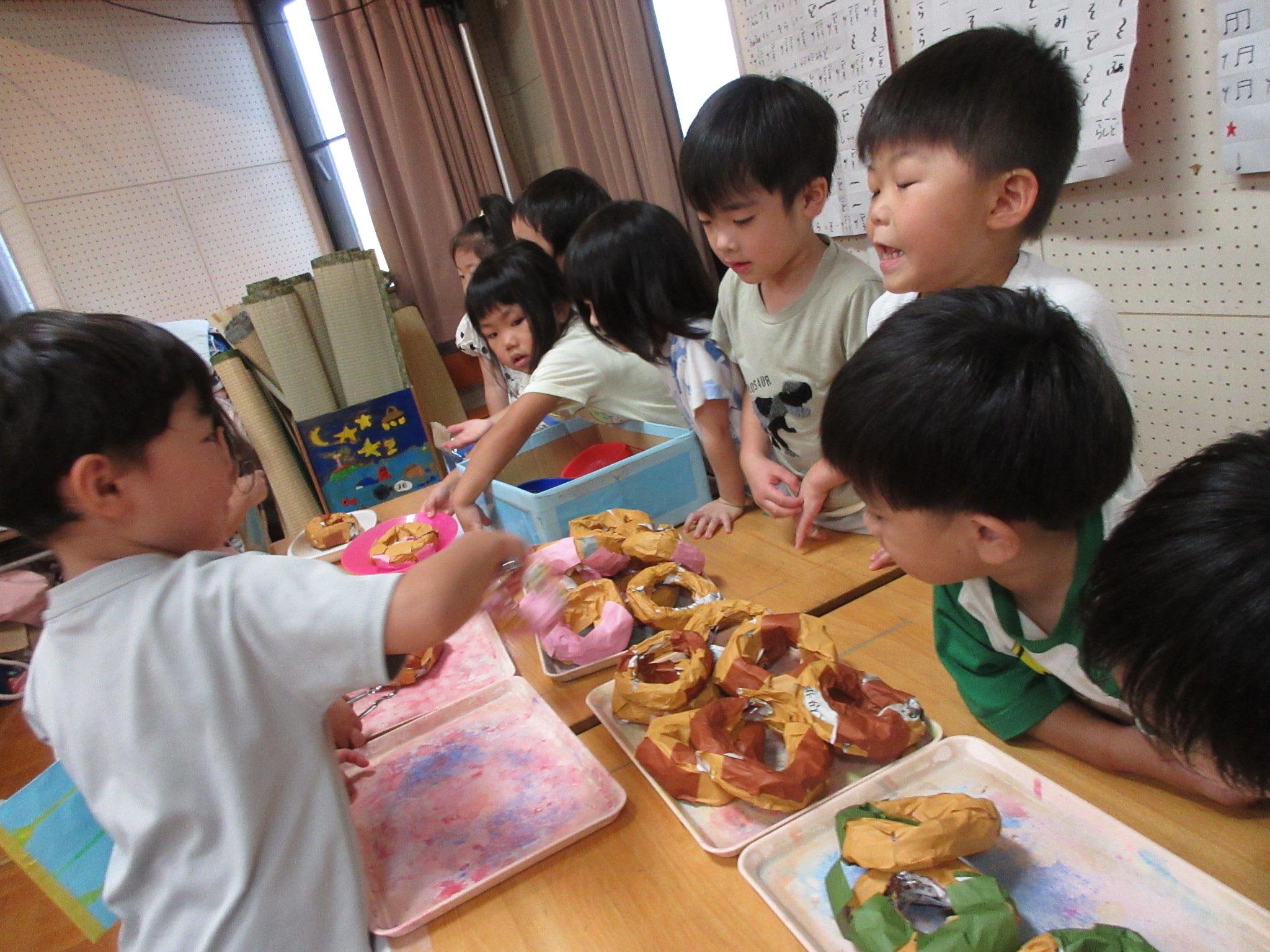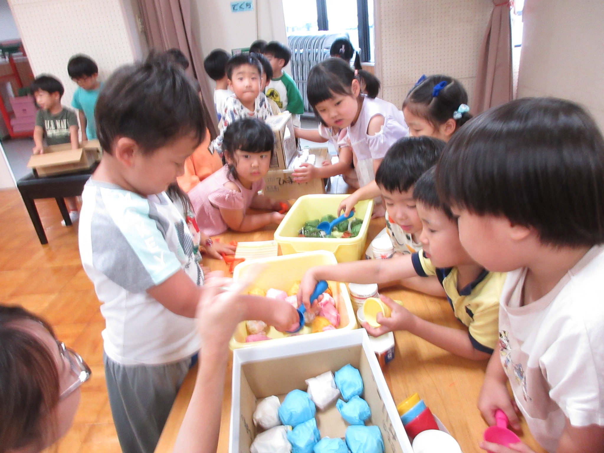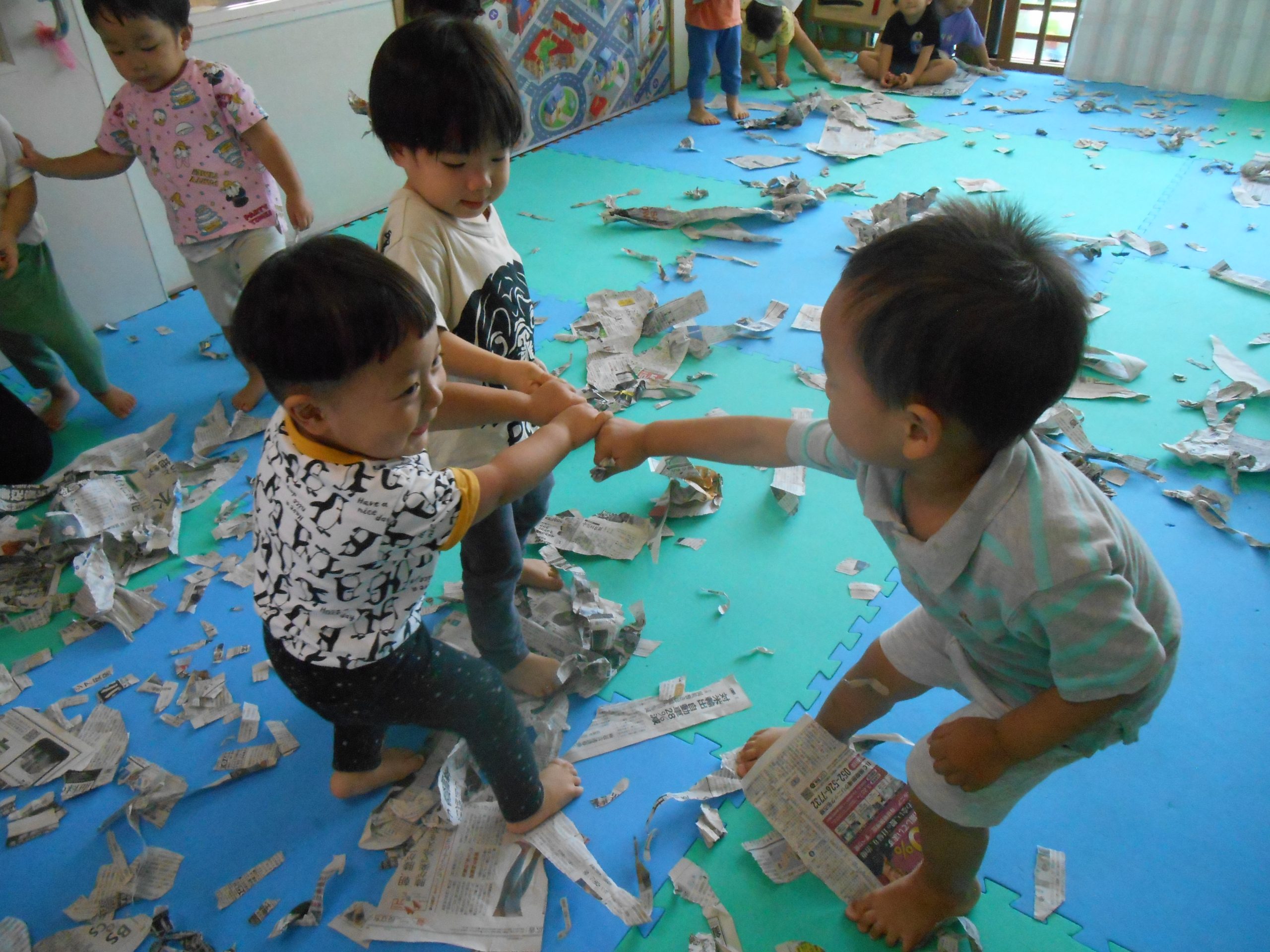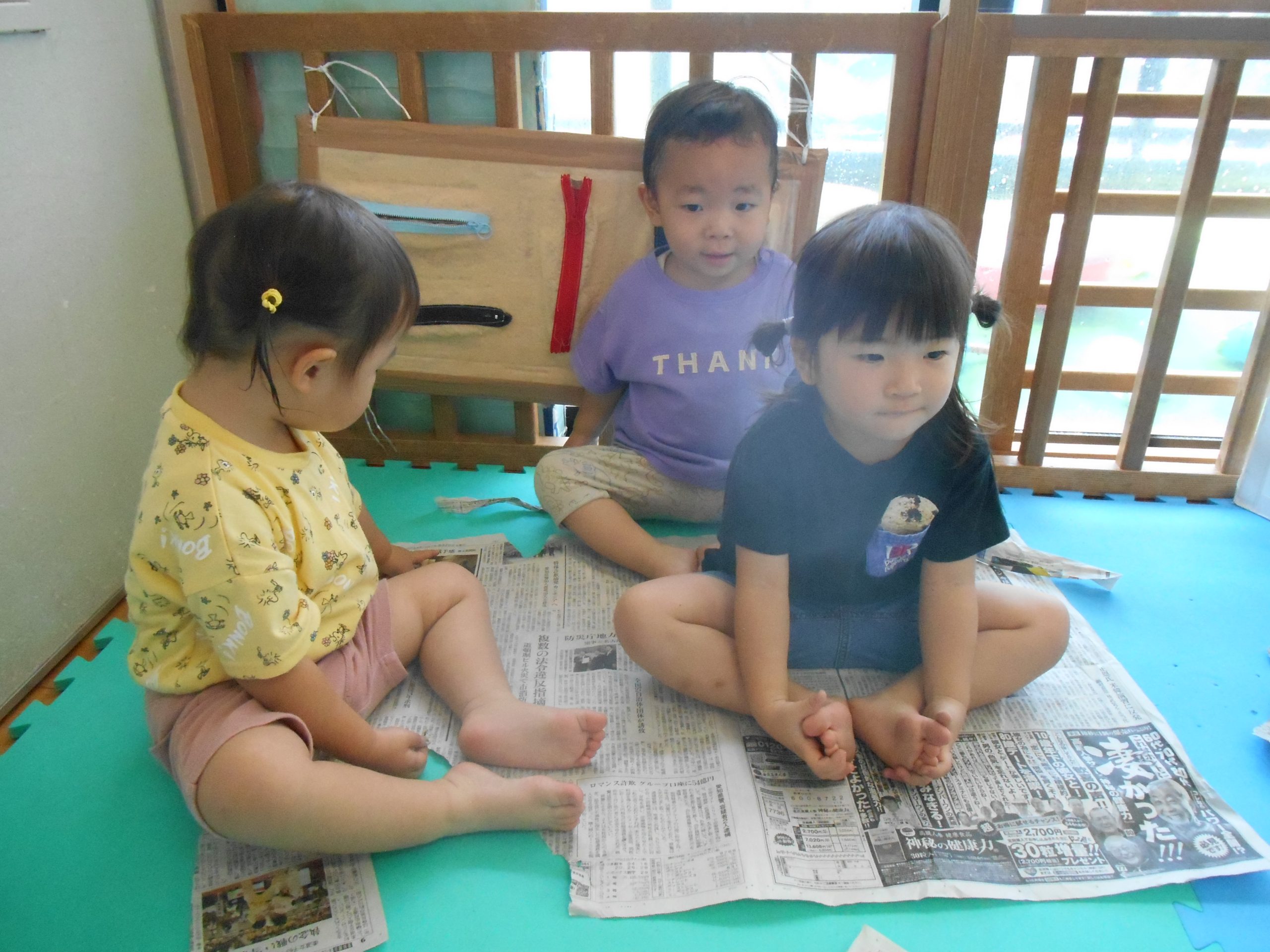 身体に付けて感触を楽しんだり、色を混ぜて色をつくったり・・・いろんな遊び方を楽しむ子どもたちでした。