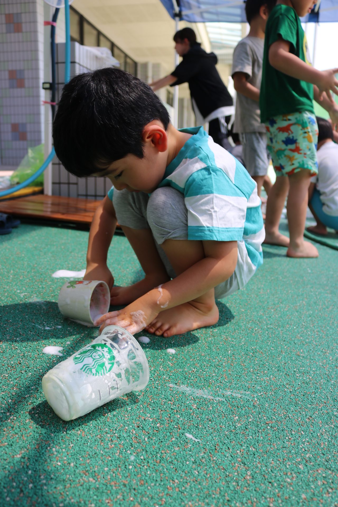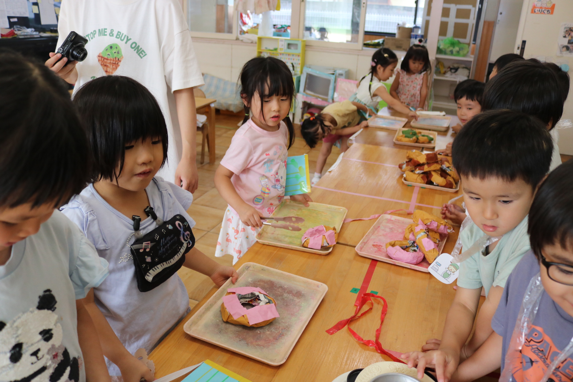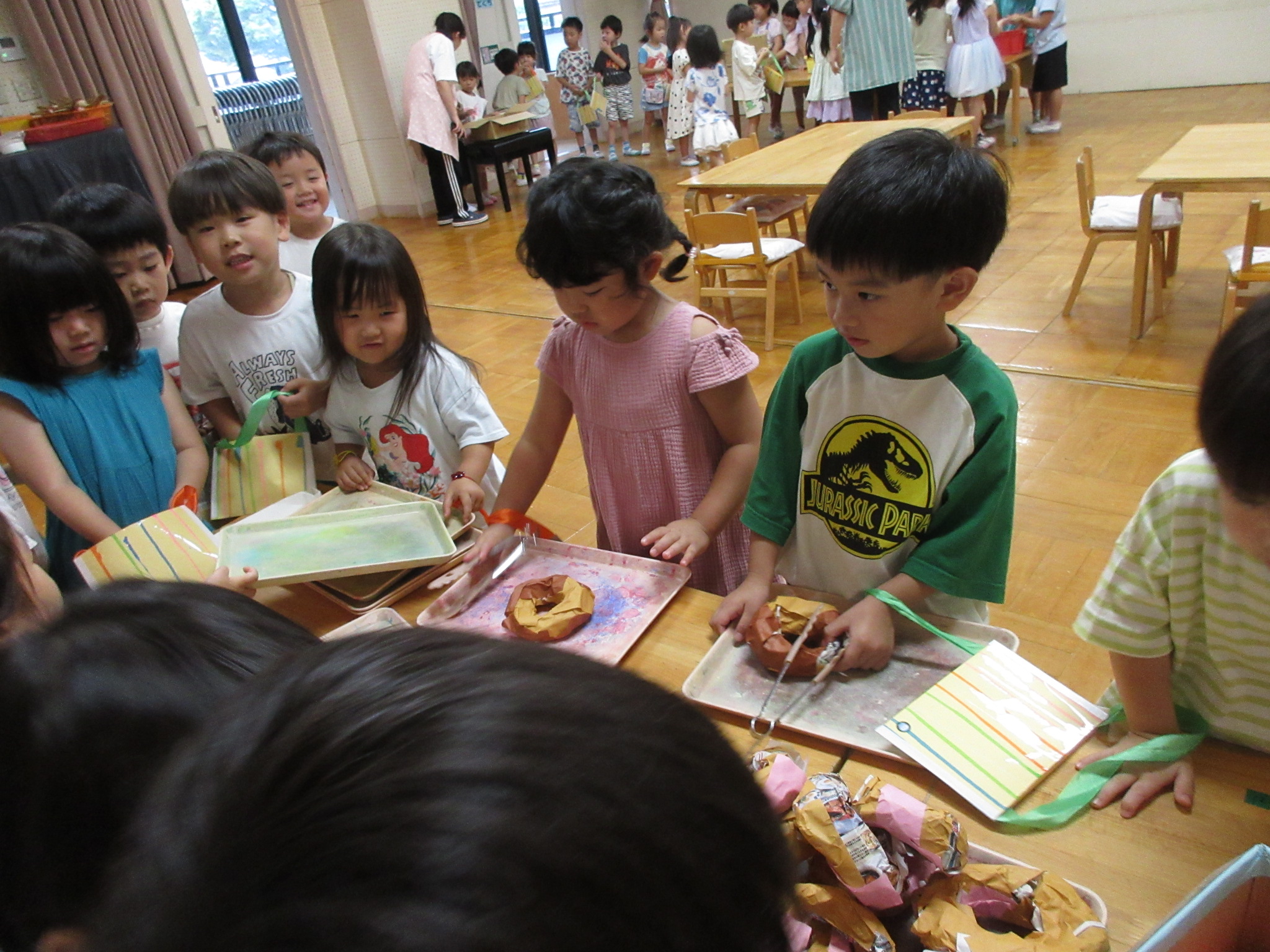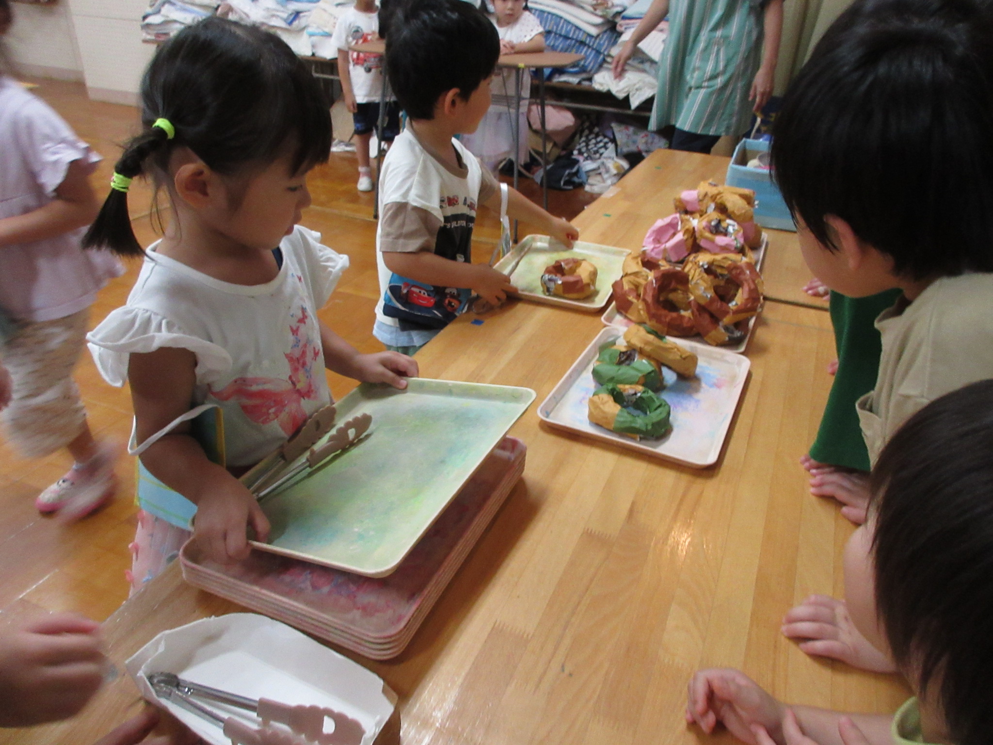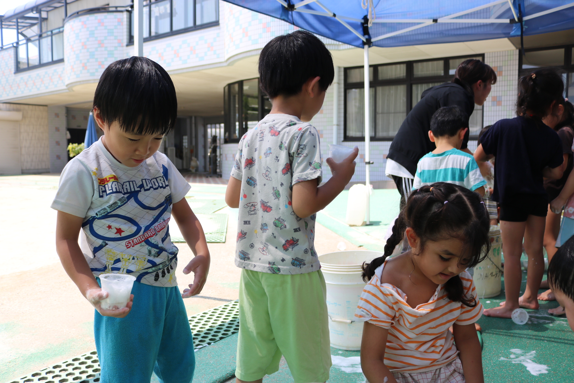 身体に付けて感触を楽しんだり、色を混ぜて色をつくったり・・・いろんな遊び方を楽しむ子どもたちでした。