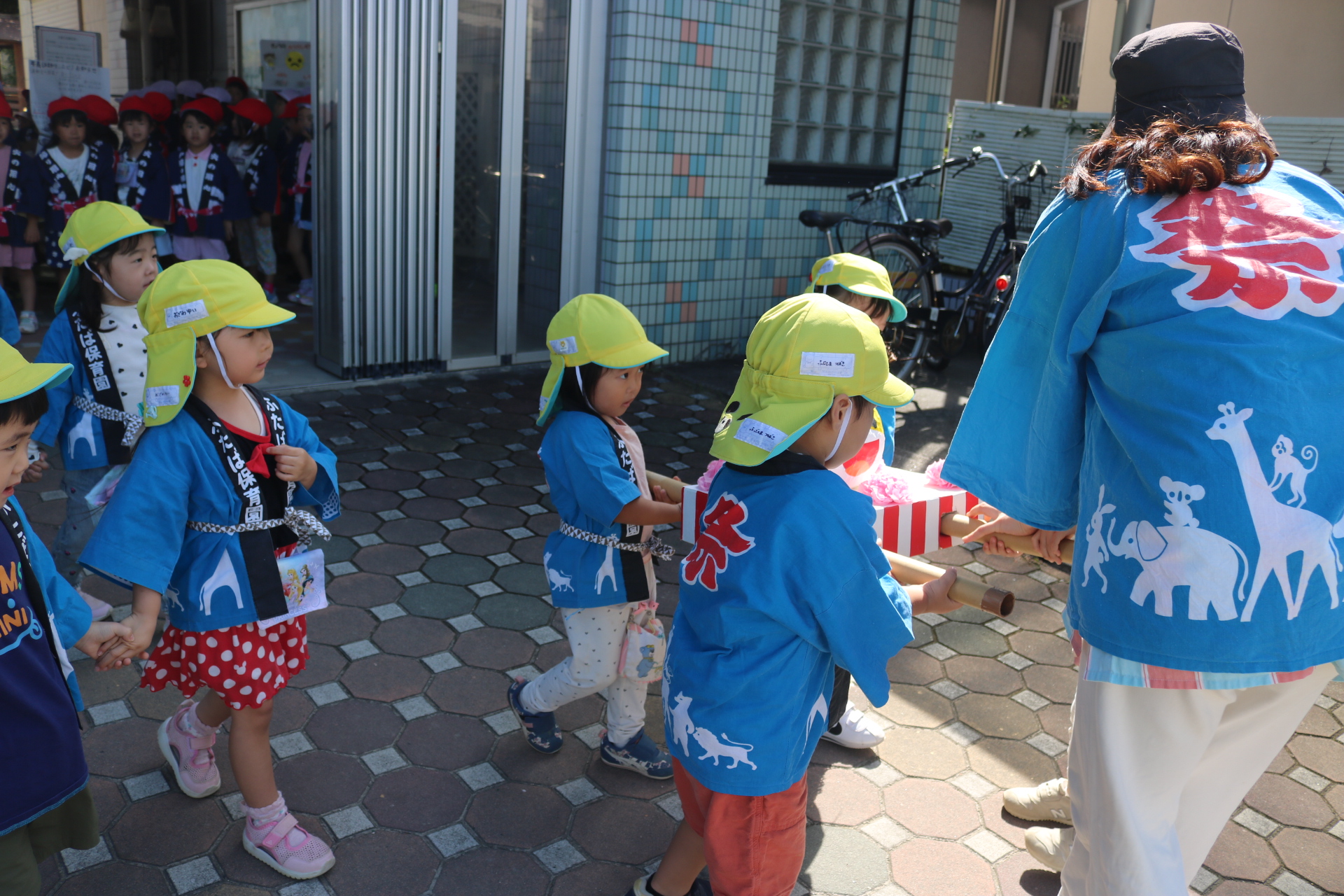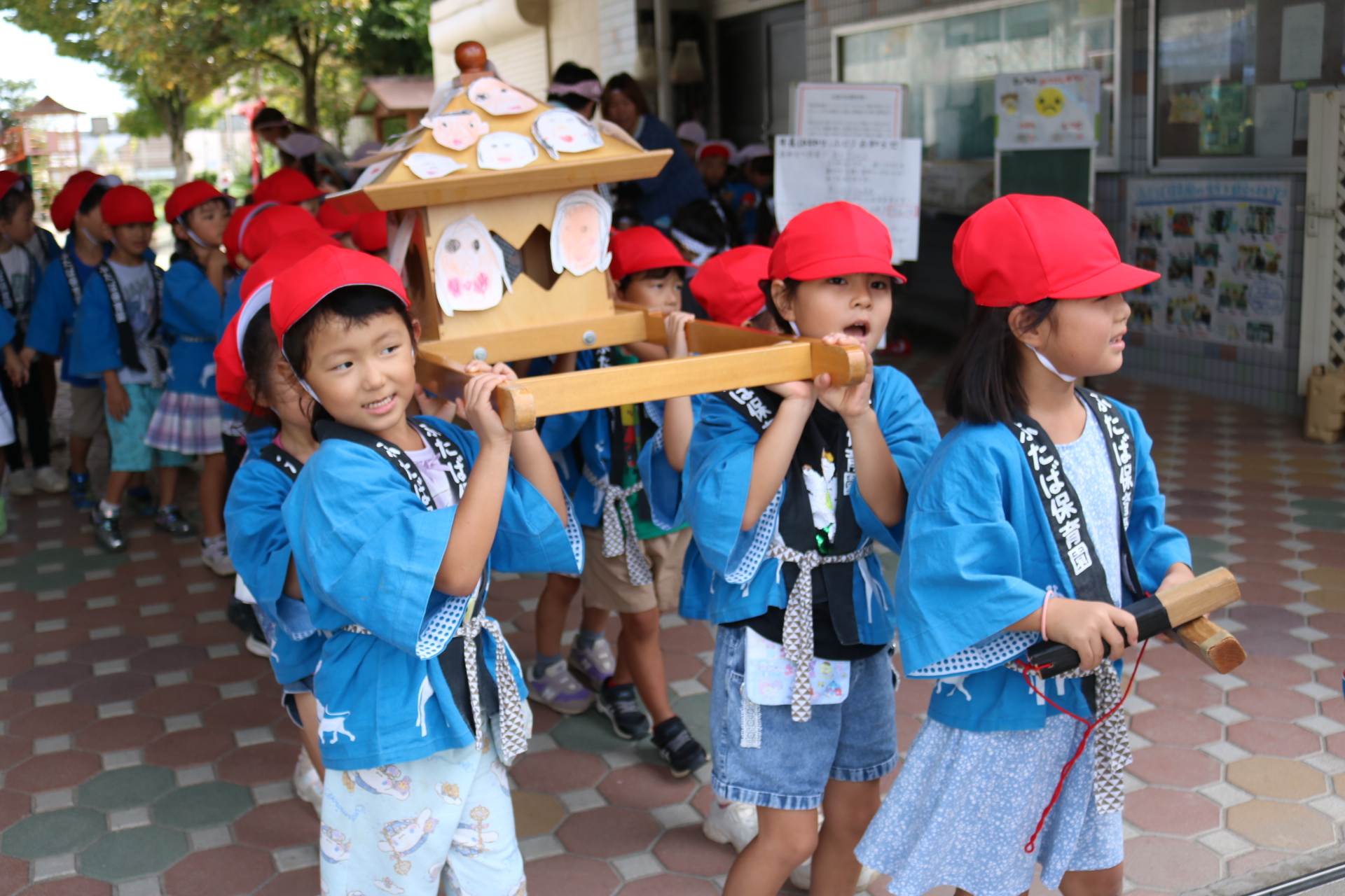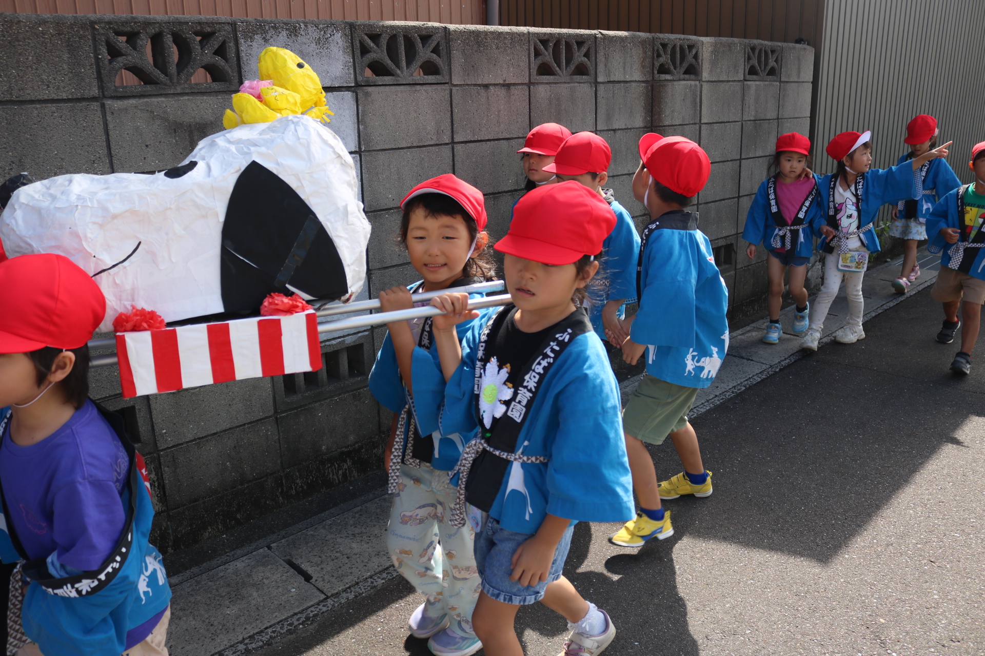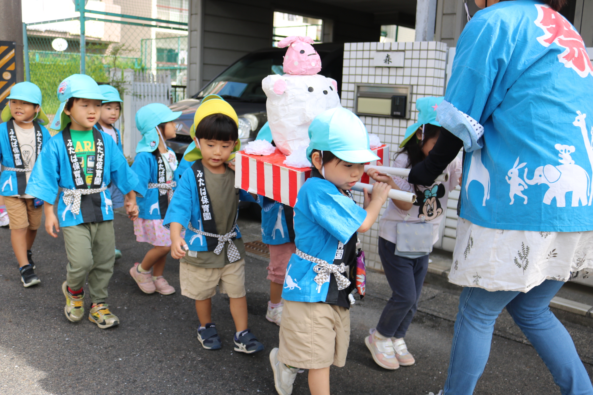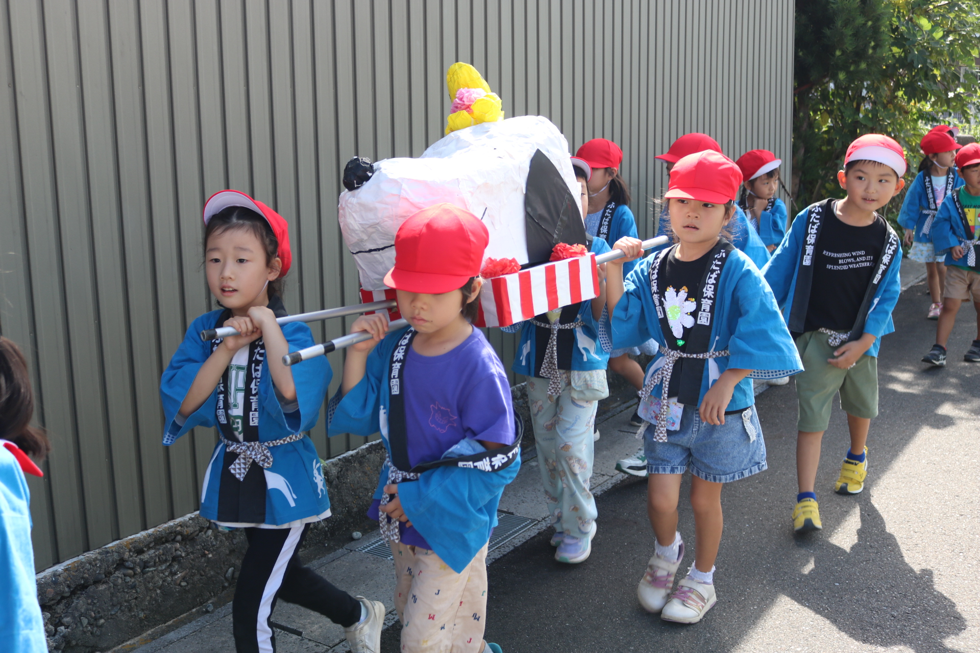 お祭りごっこを楽しんだ子どもたち。お神輿を担いで、近所を歩いてまわりましたよ😊