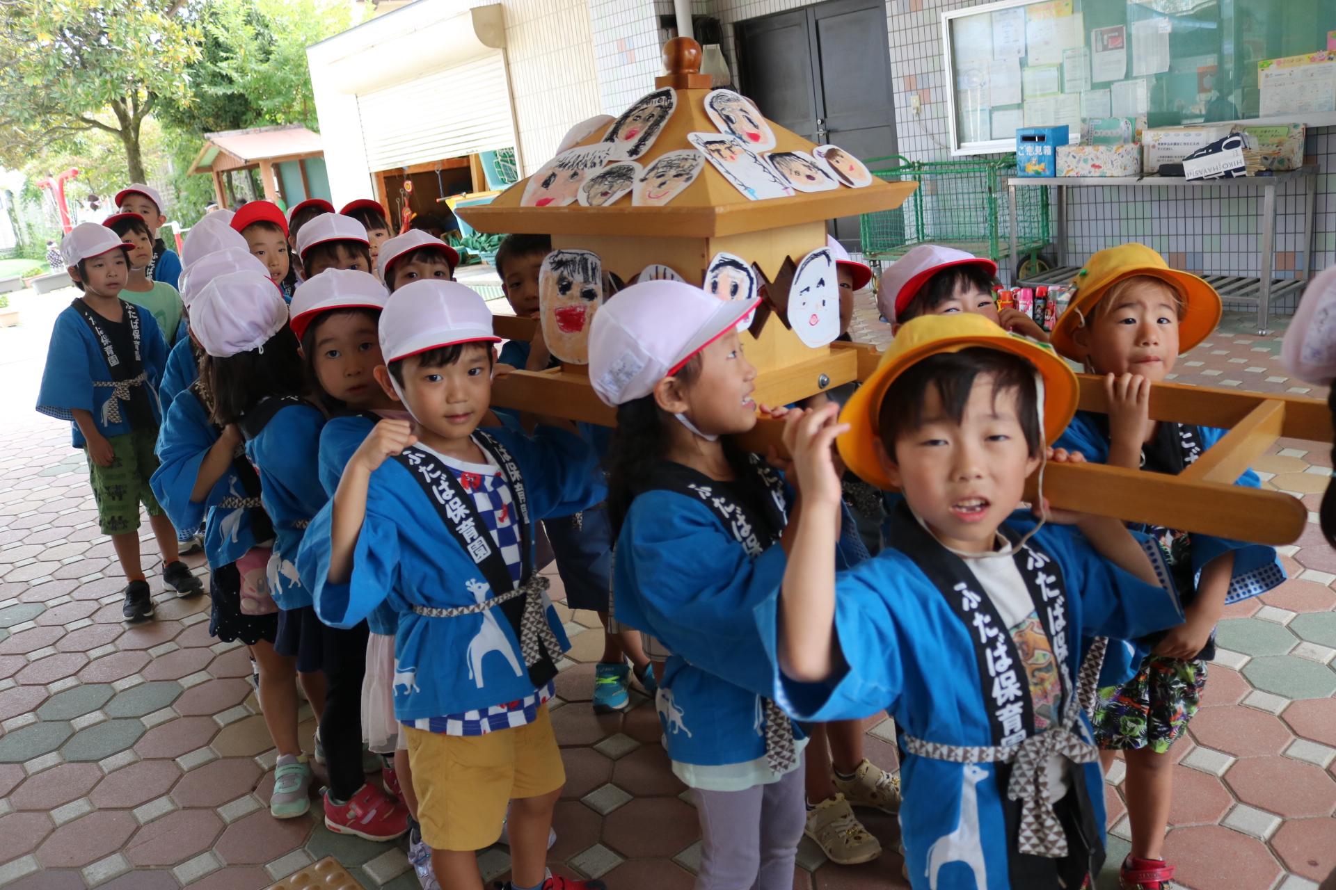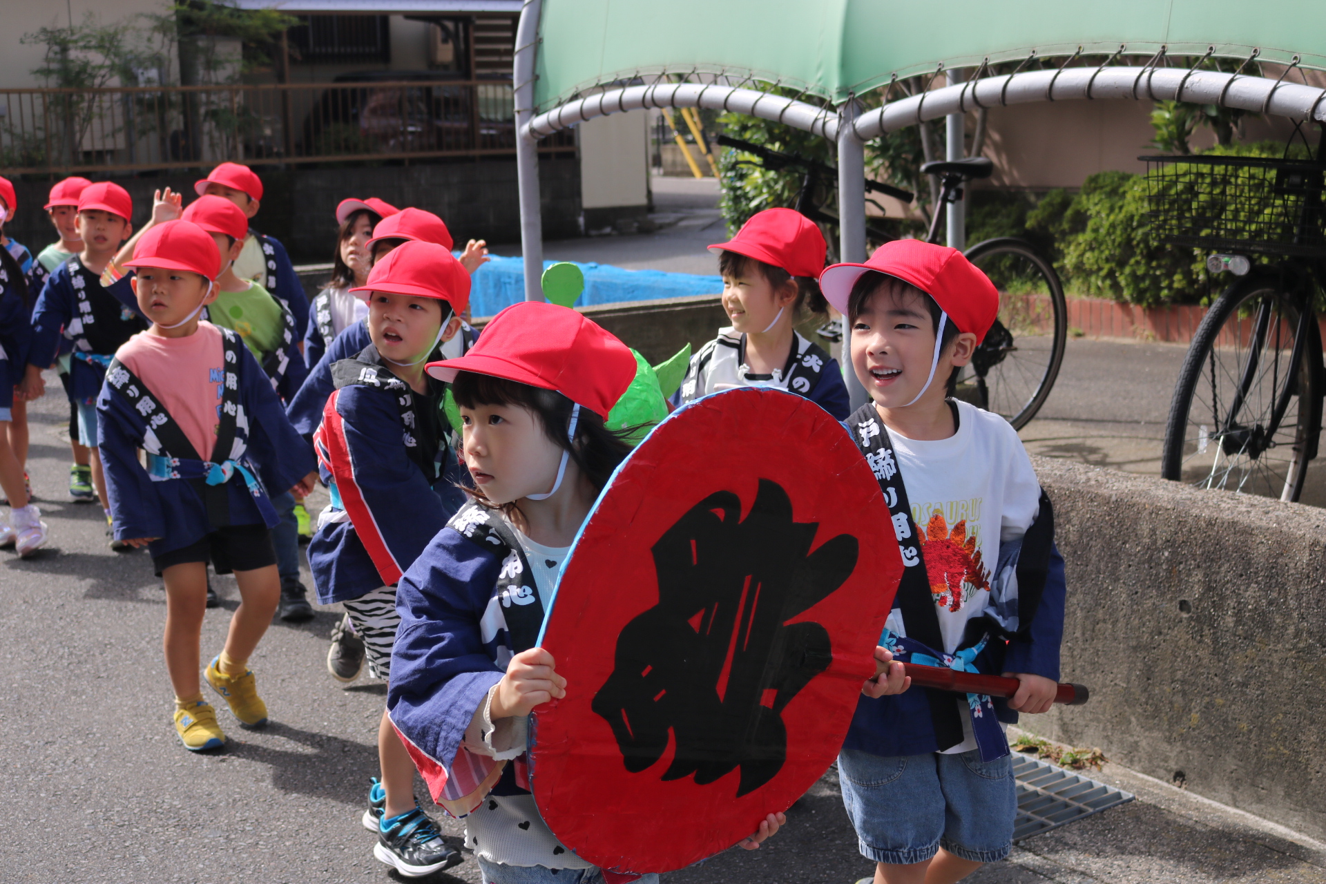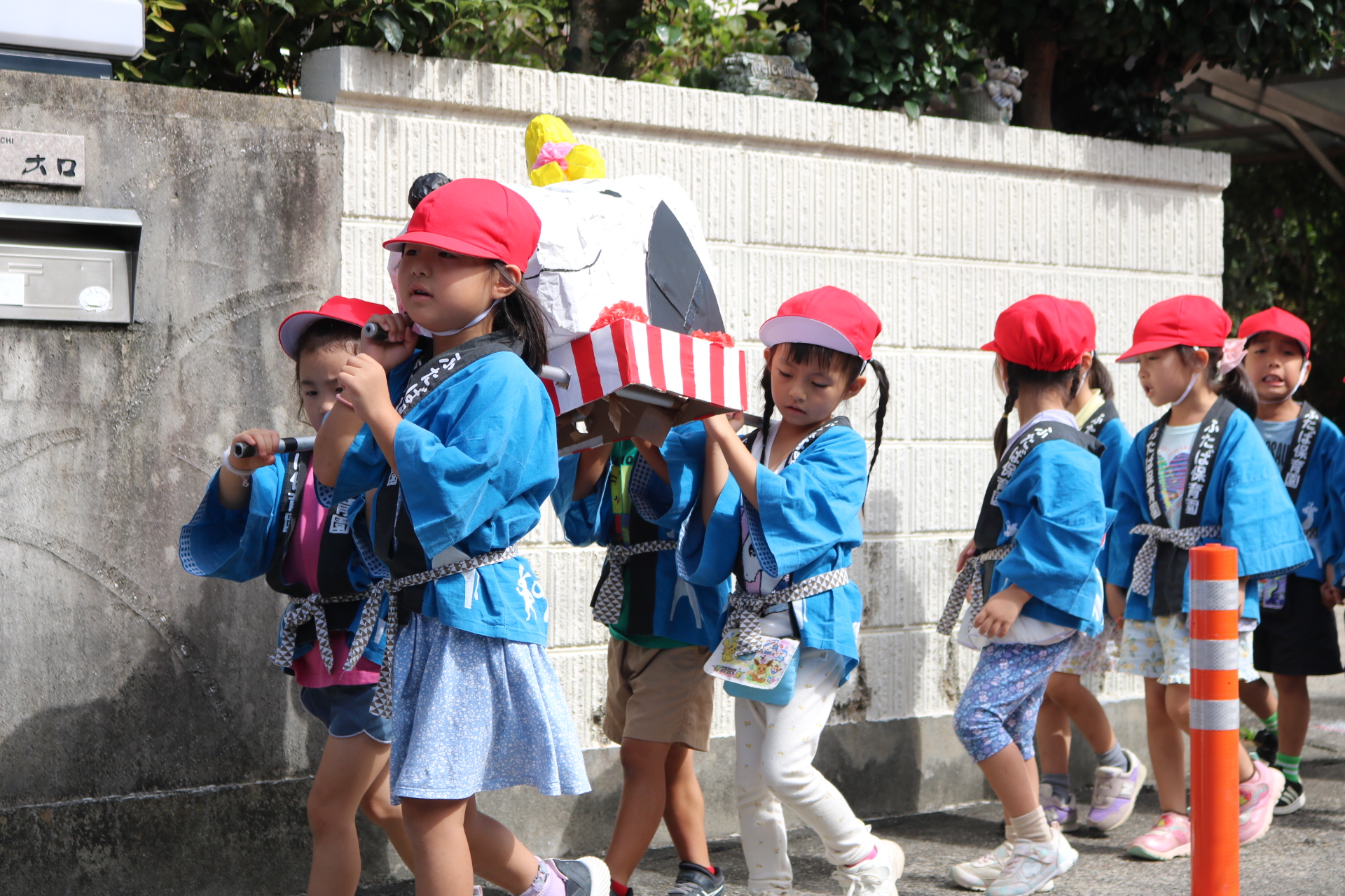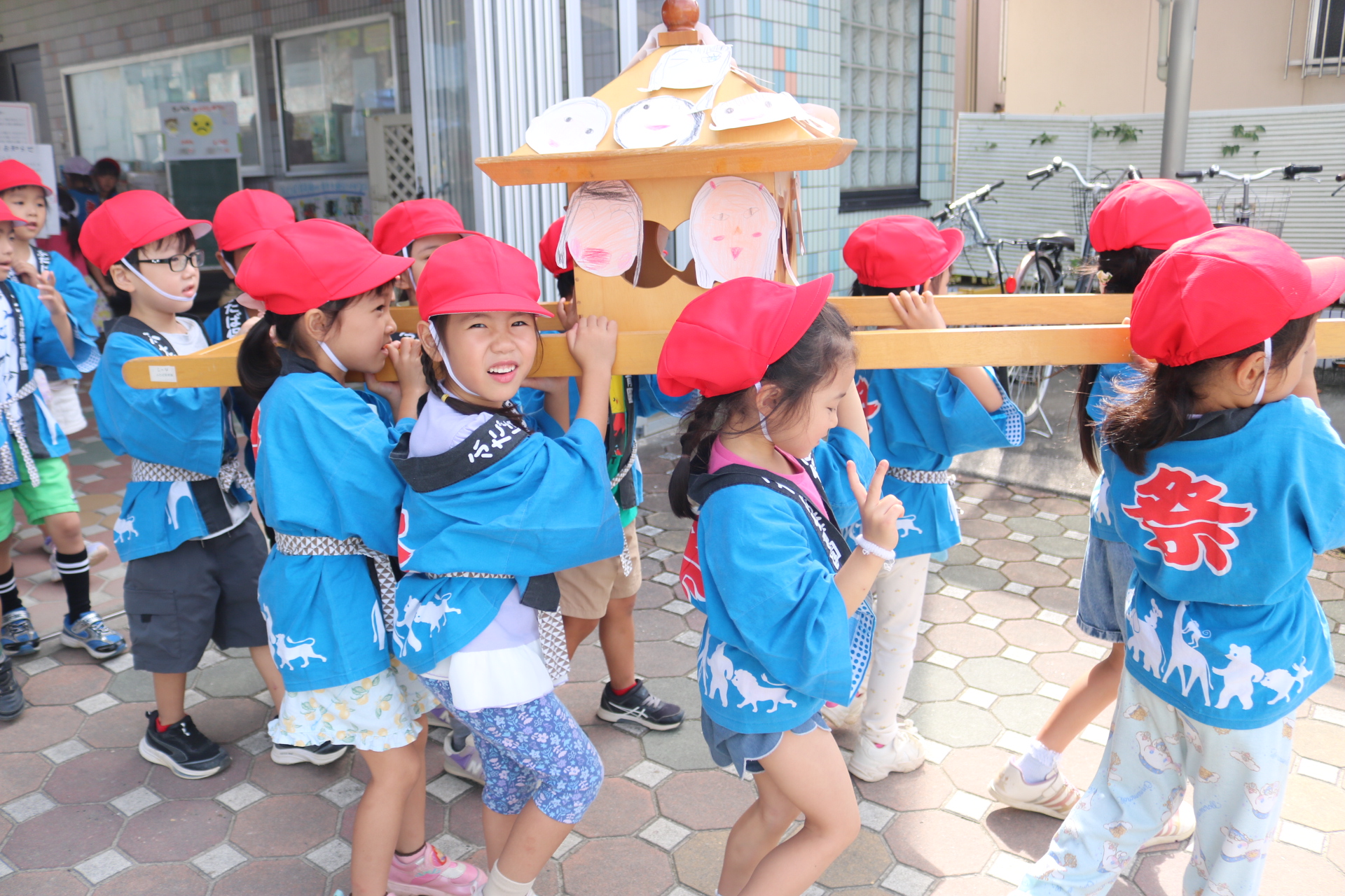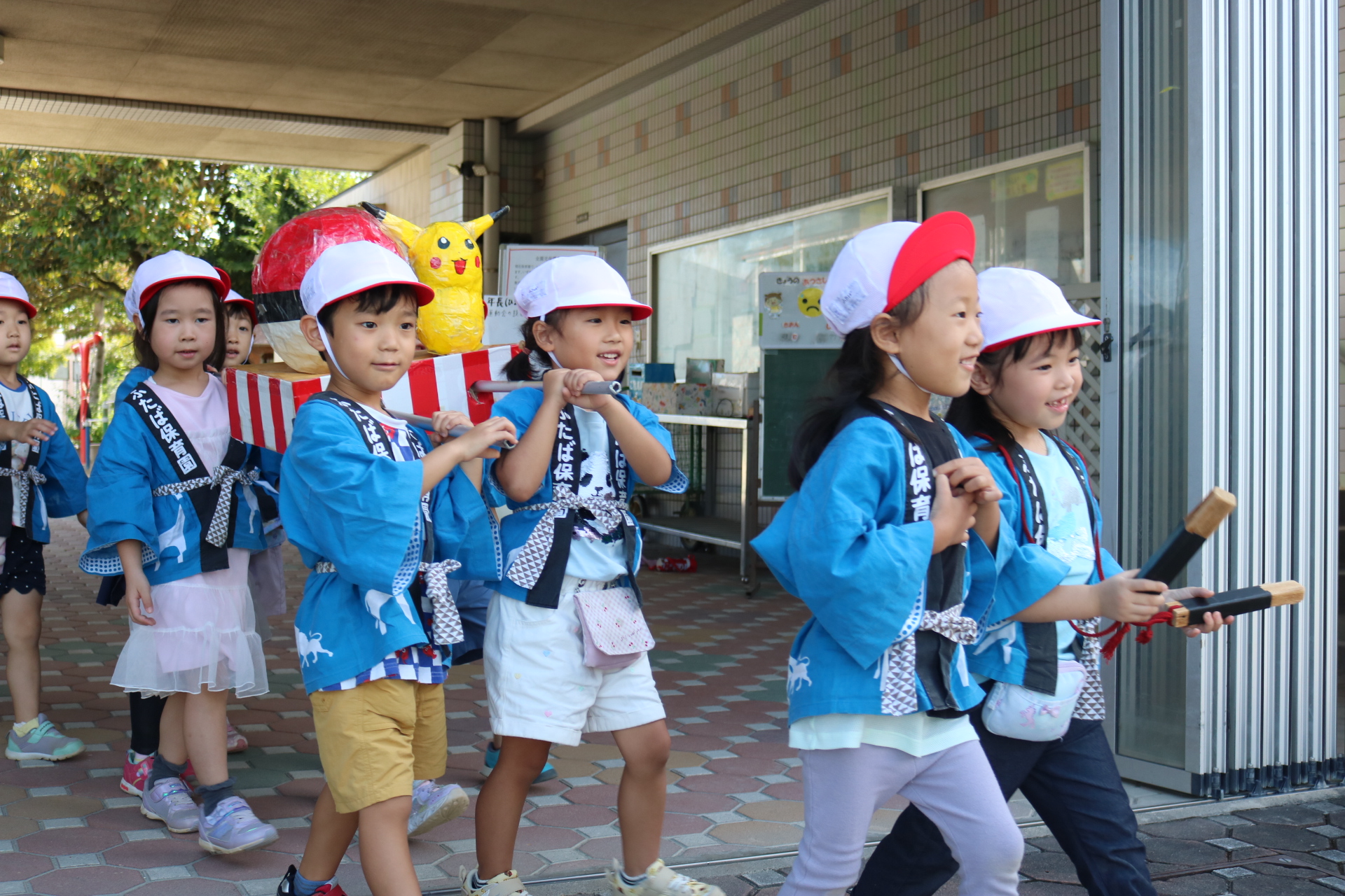 お祭りごっこを楽しんだ子どもたち。お神輿を担いで、近所を歩いてまわりましたよ😊