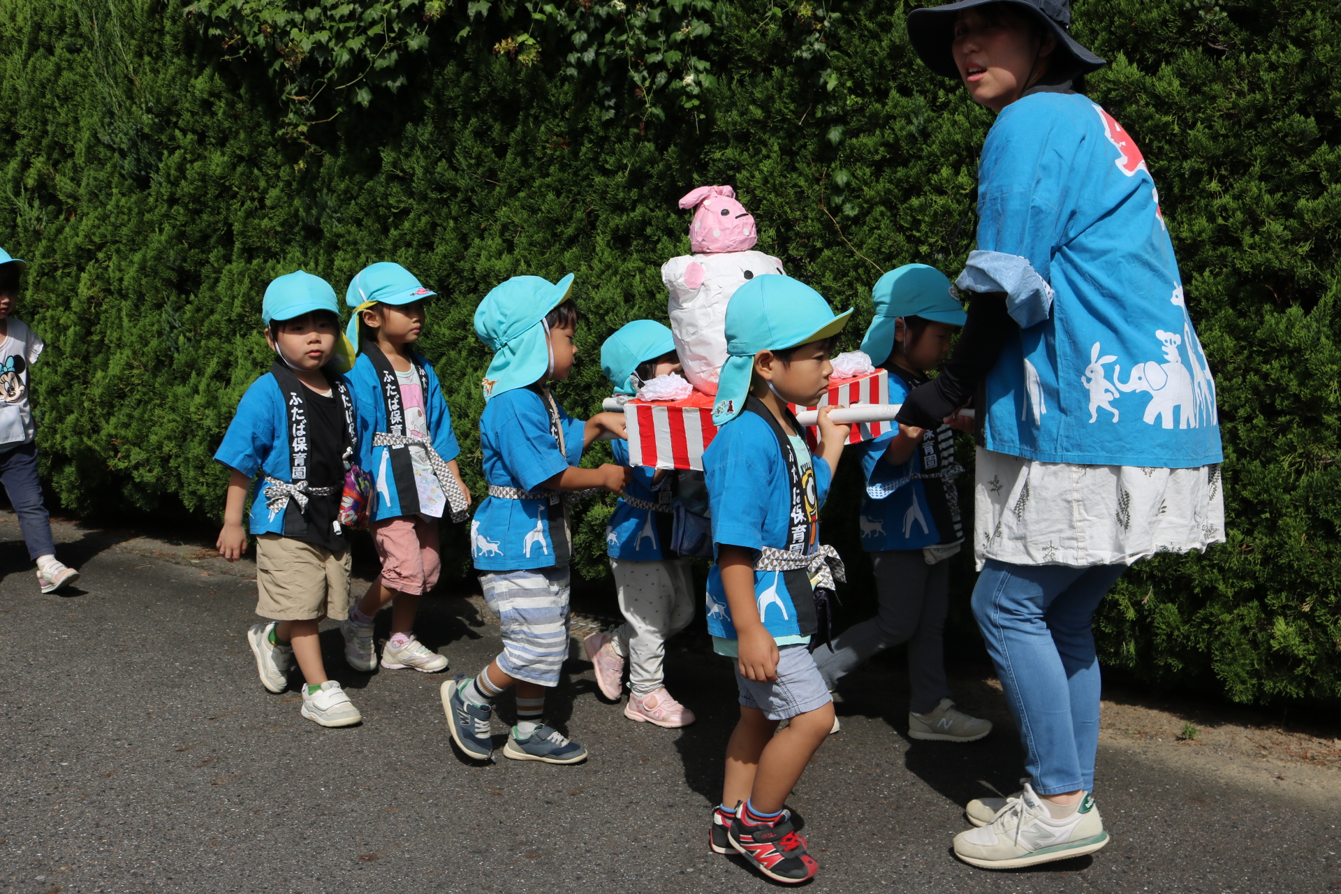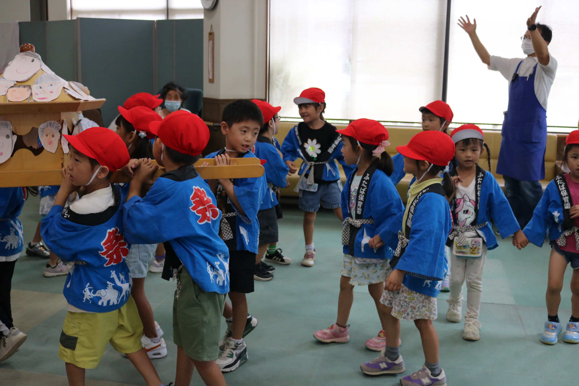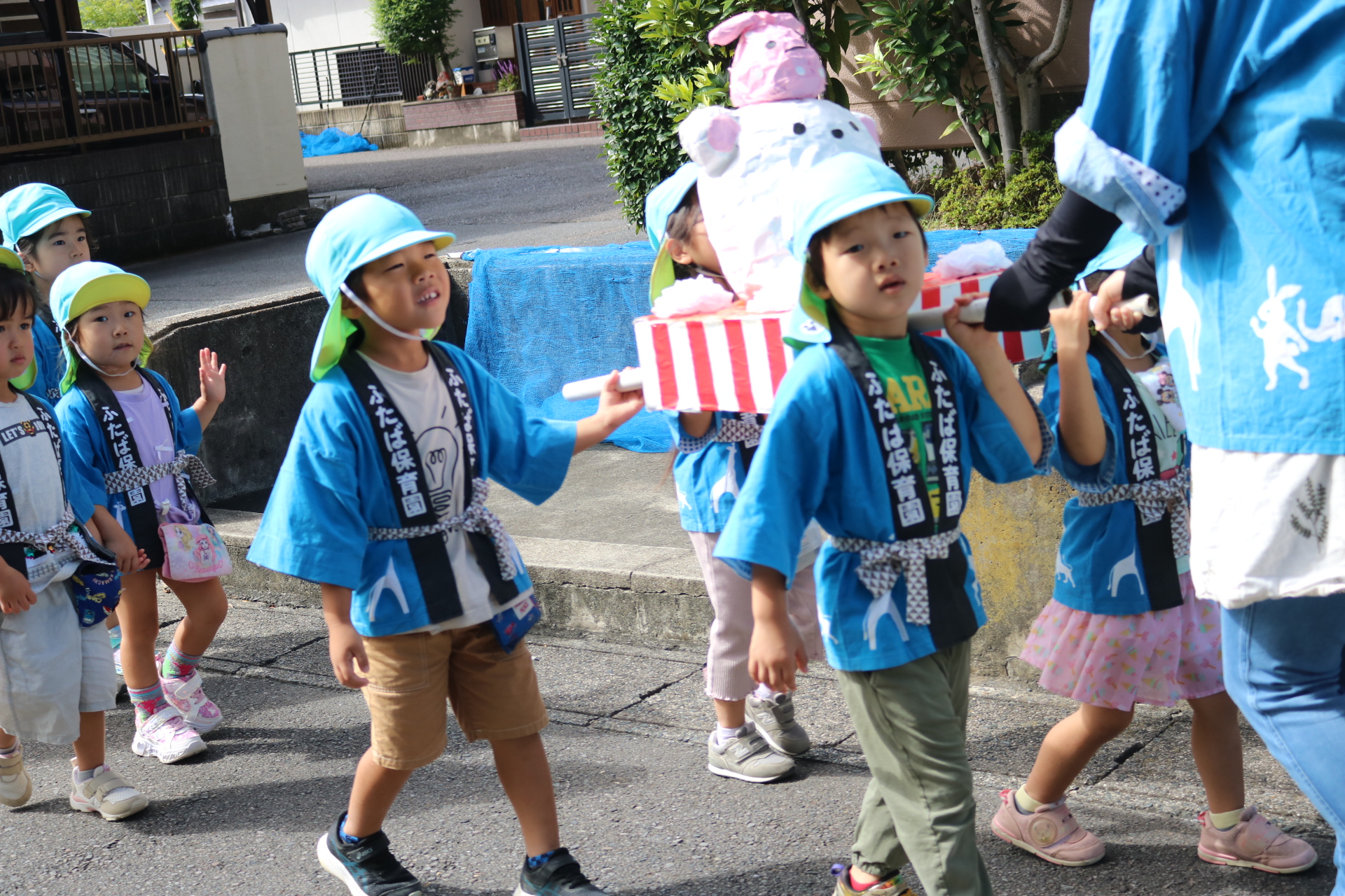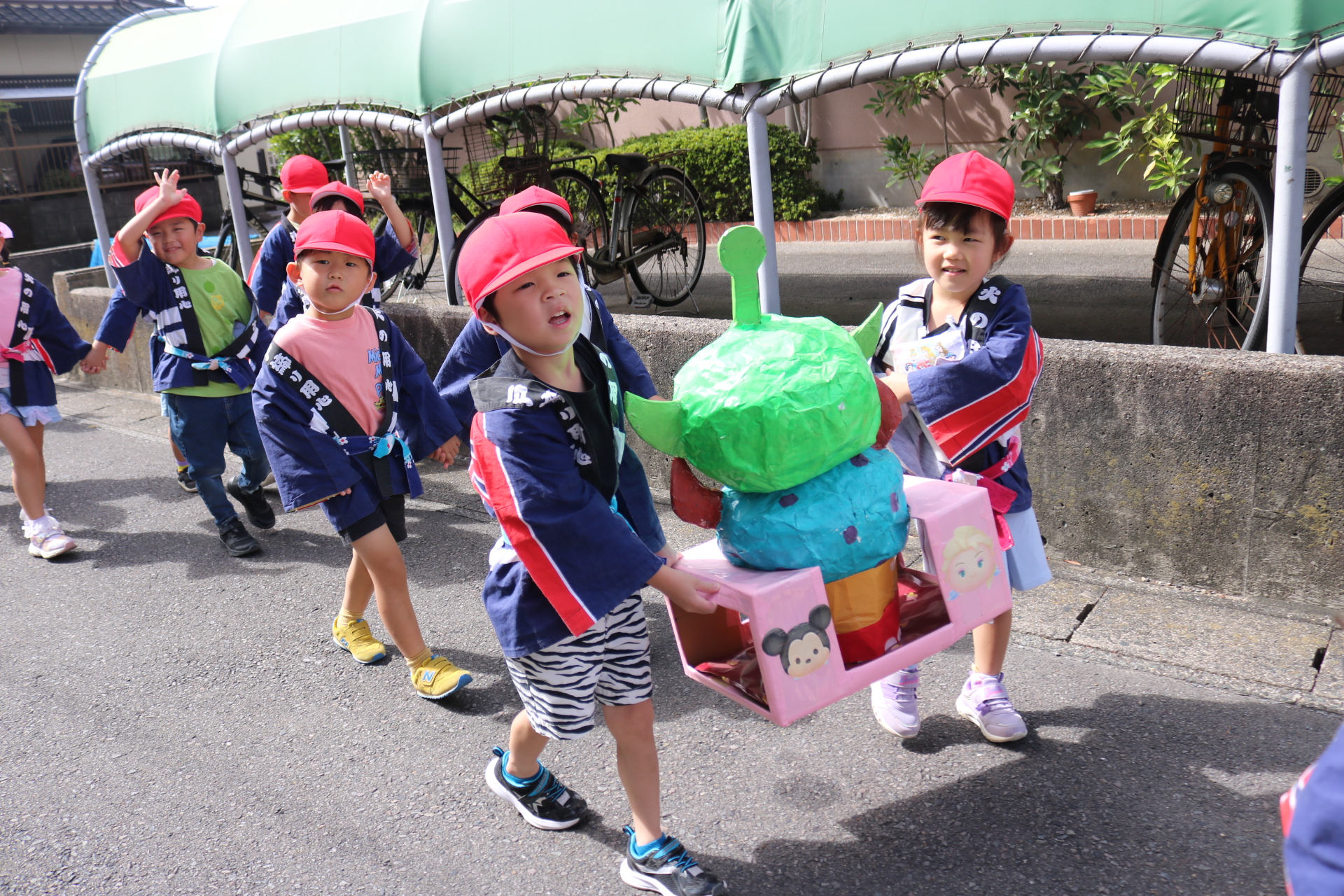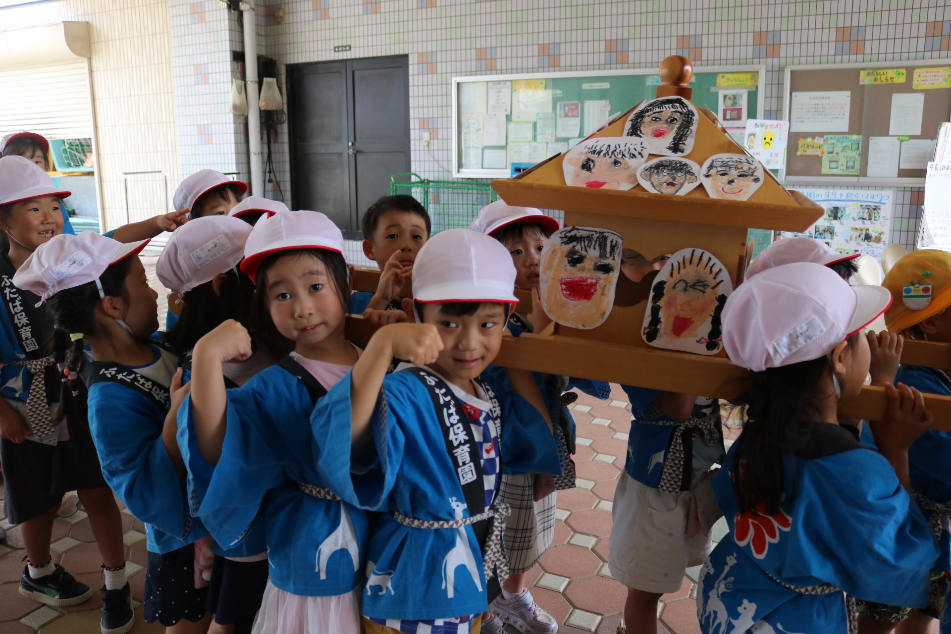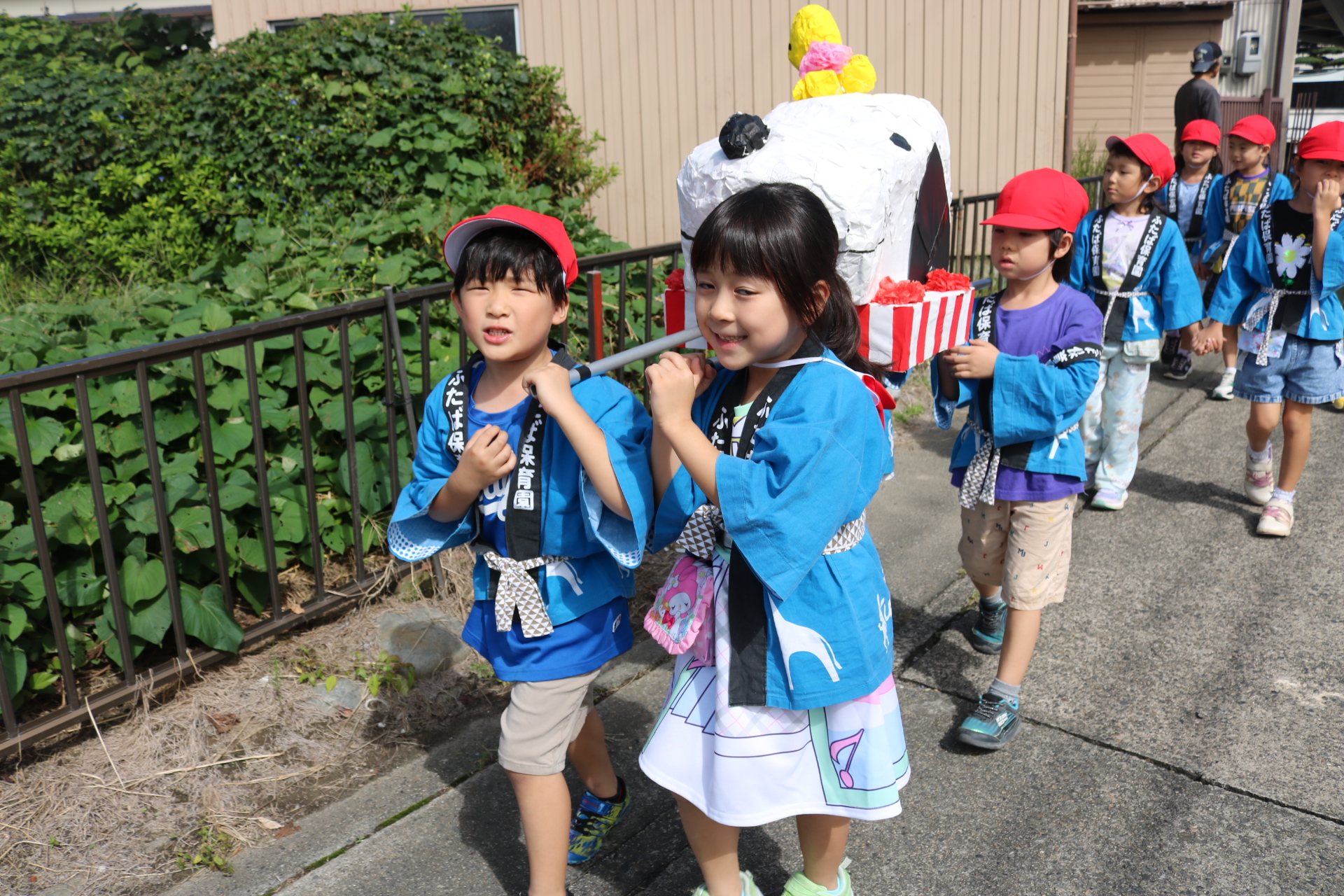 お祭りごっこを楽しんだ子どもたち。お神輿を担いで、近所を歩いてまわりましたよ😊