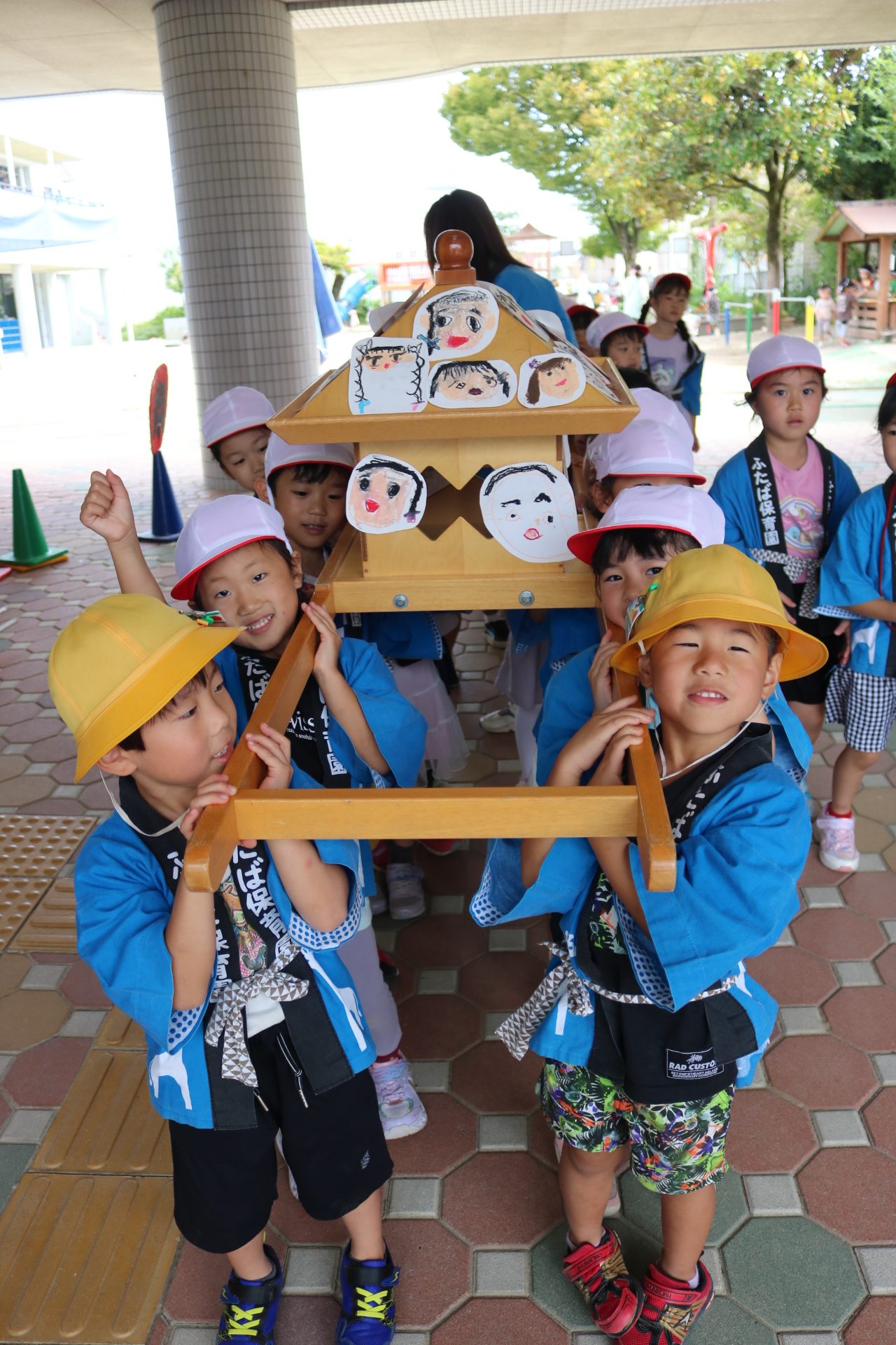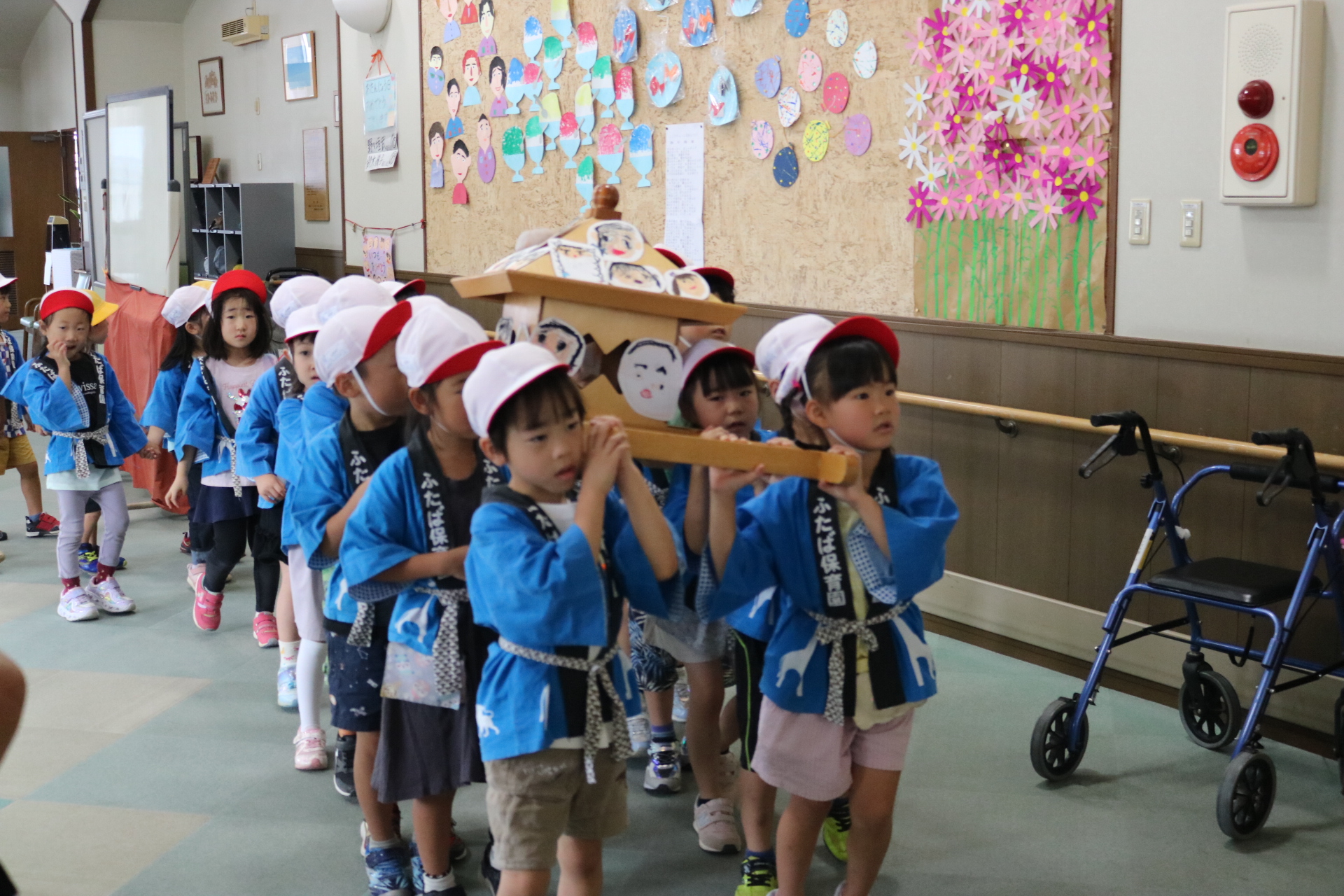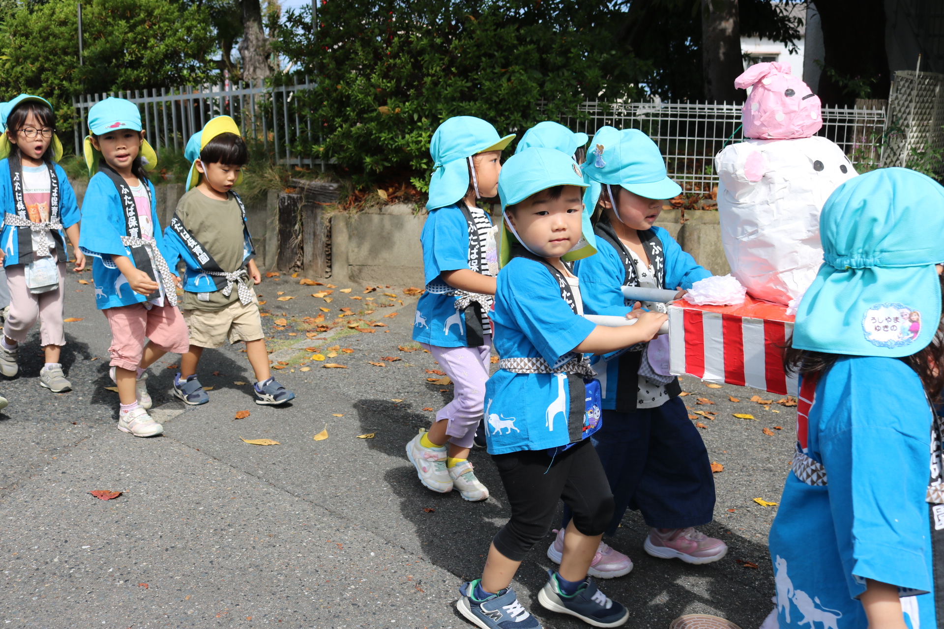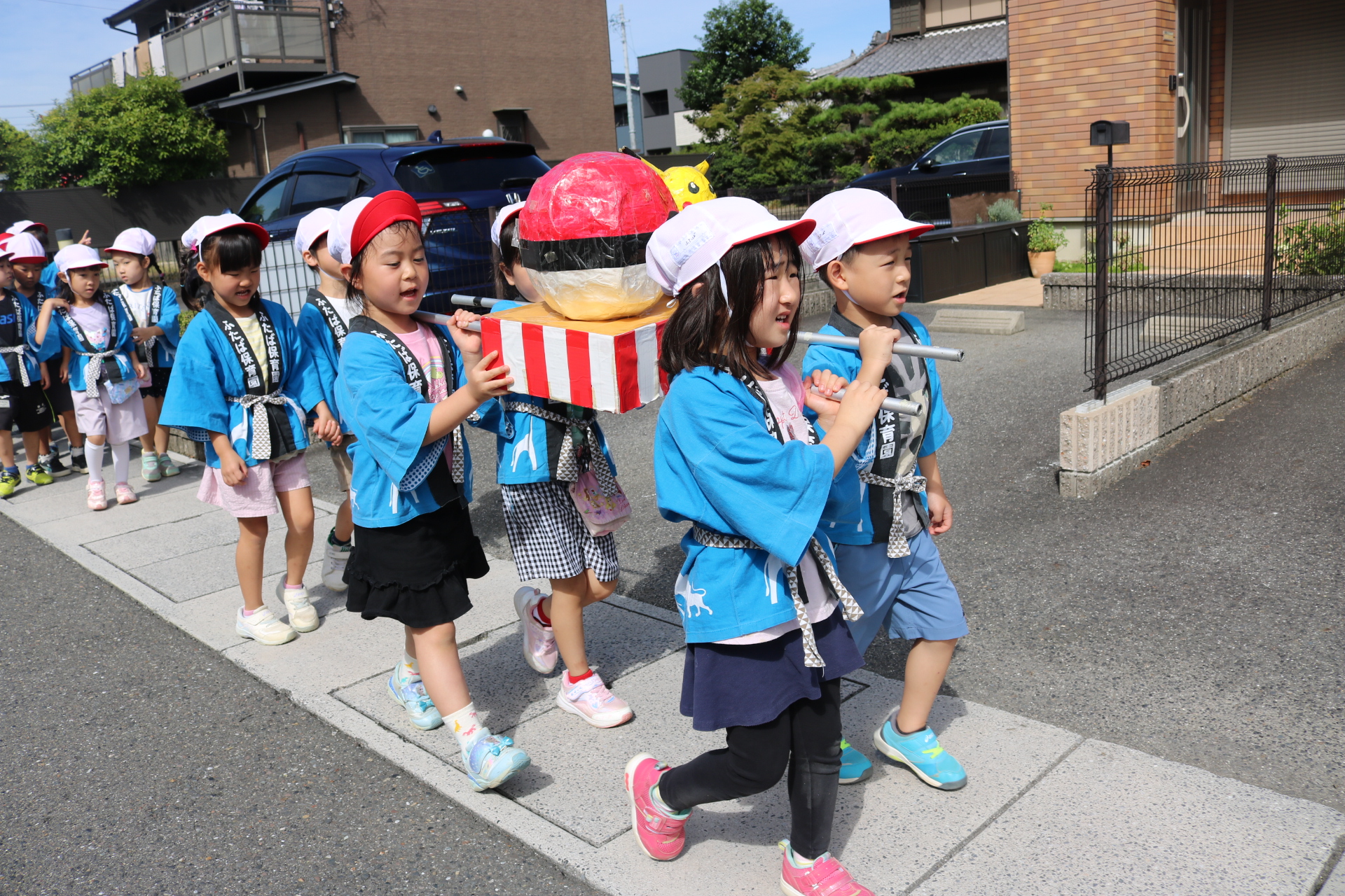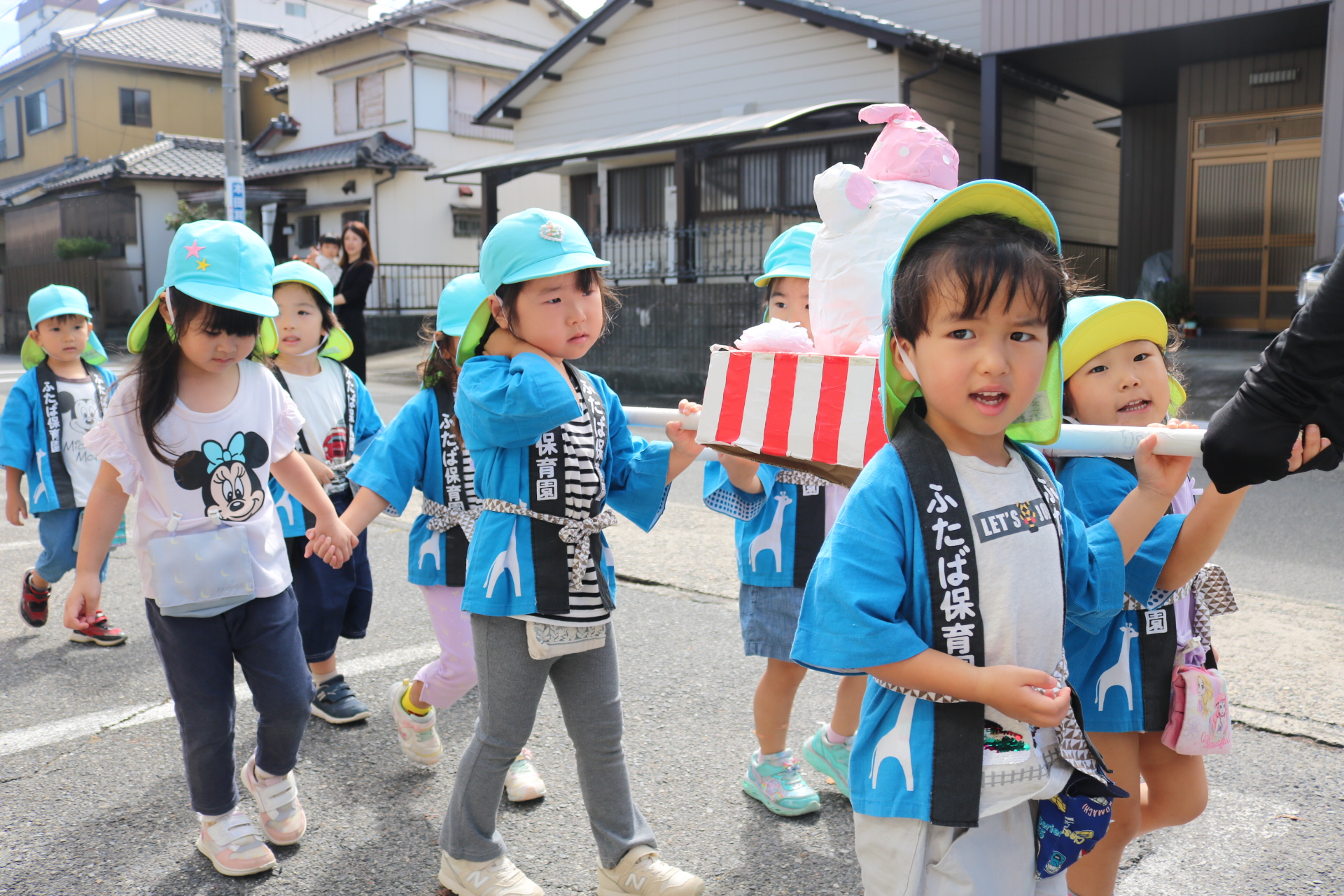 お祭りごっこを楽しんだ子どもたち。お神輿を担いで、近所を歩いてまわりましたよ😊