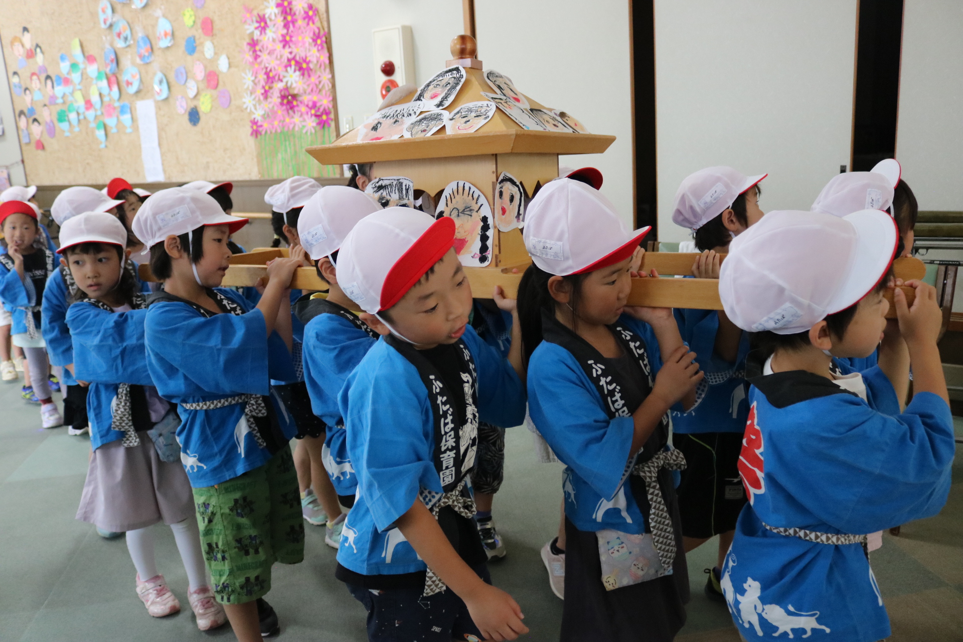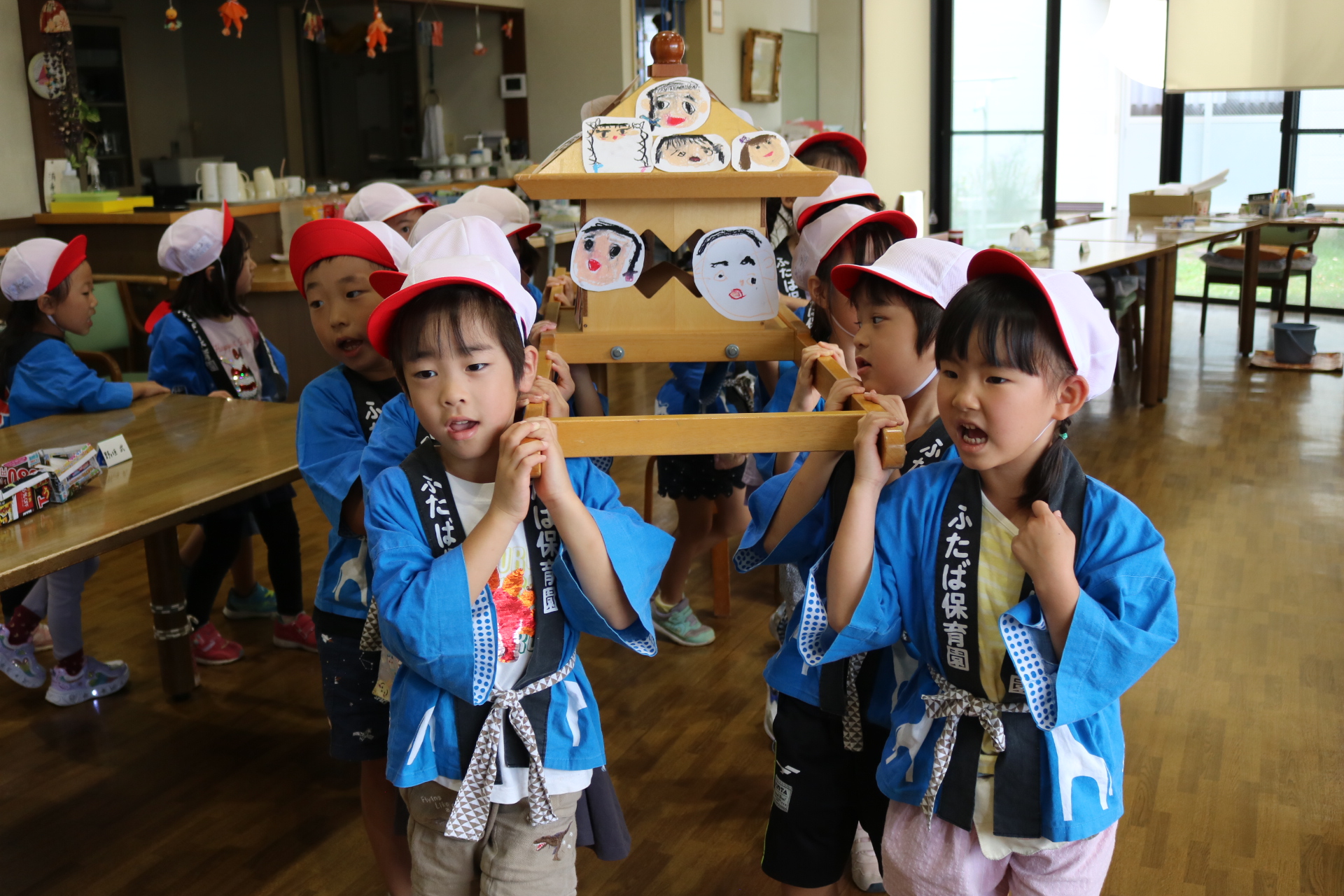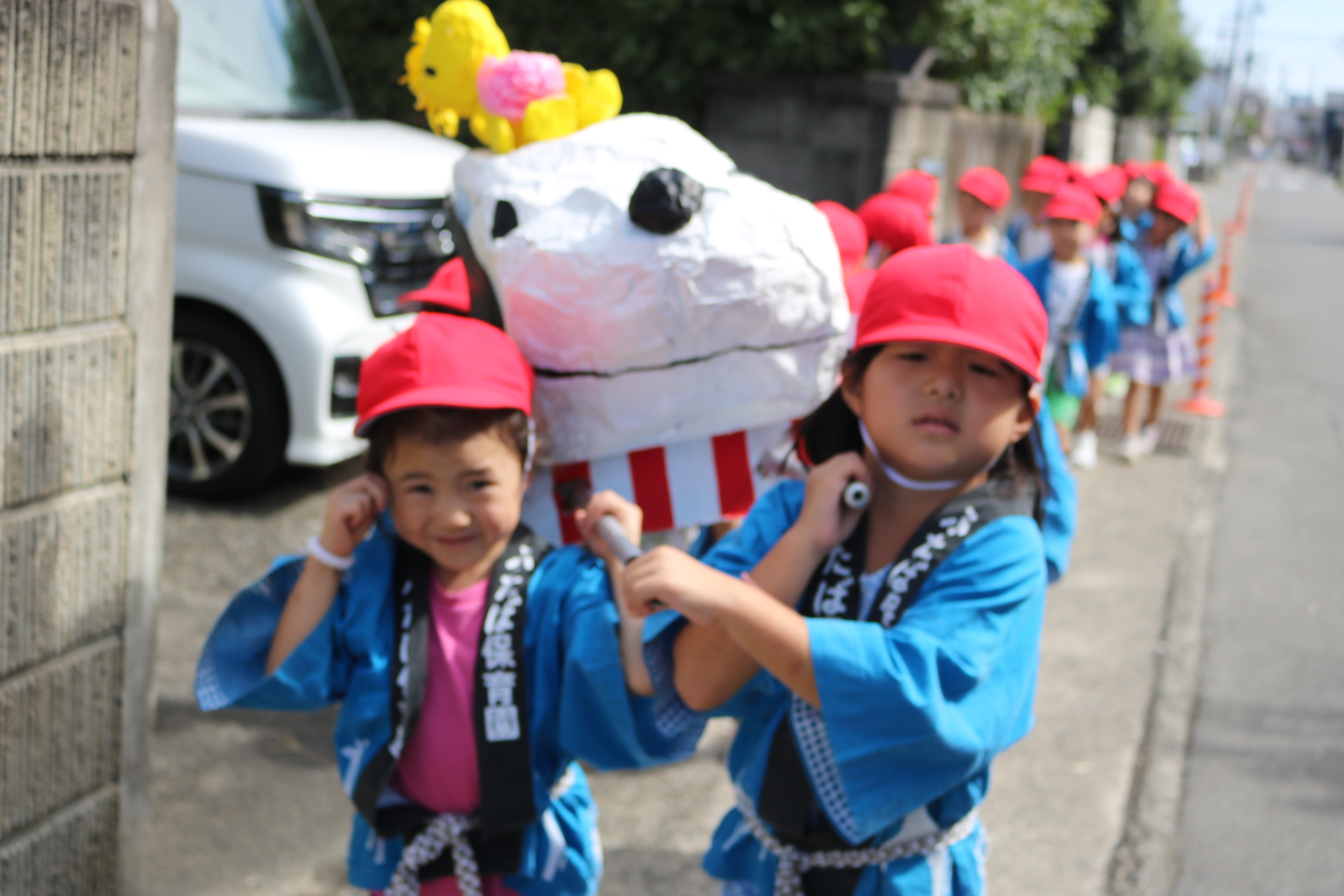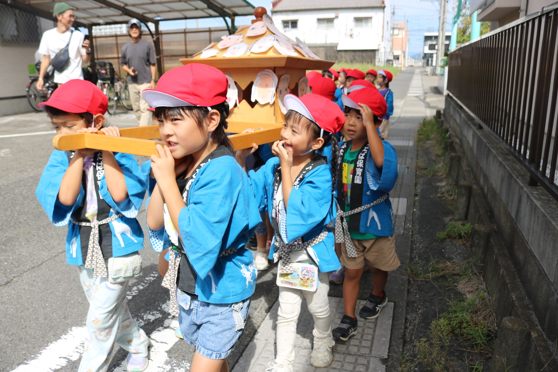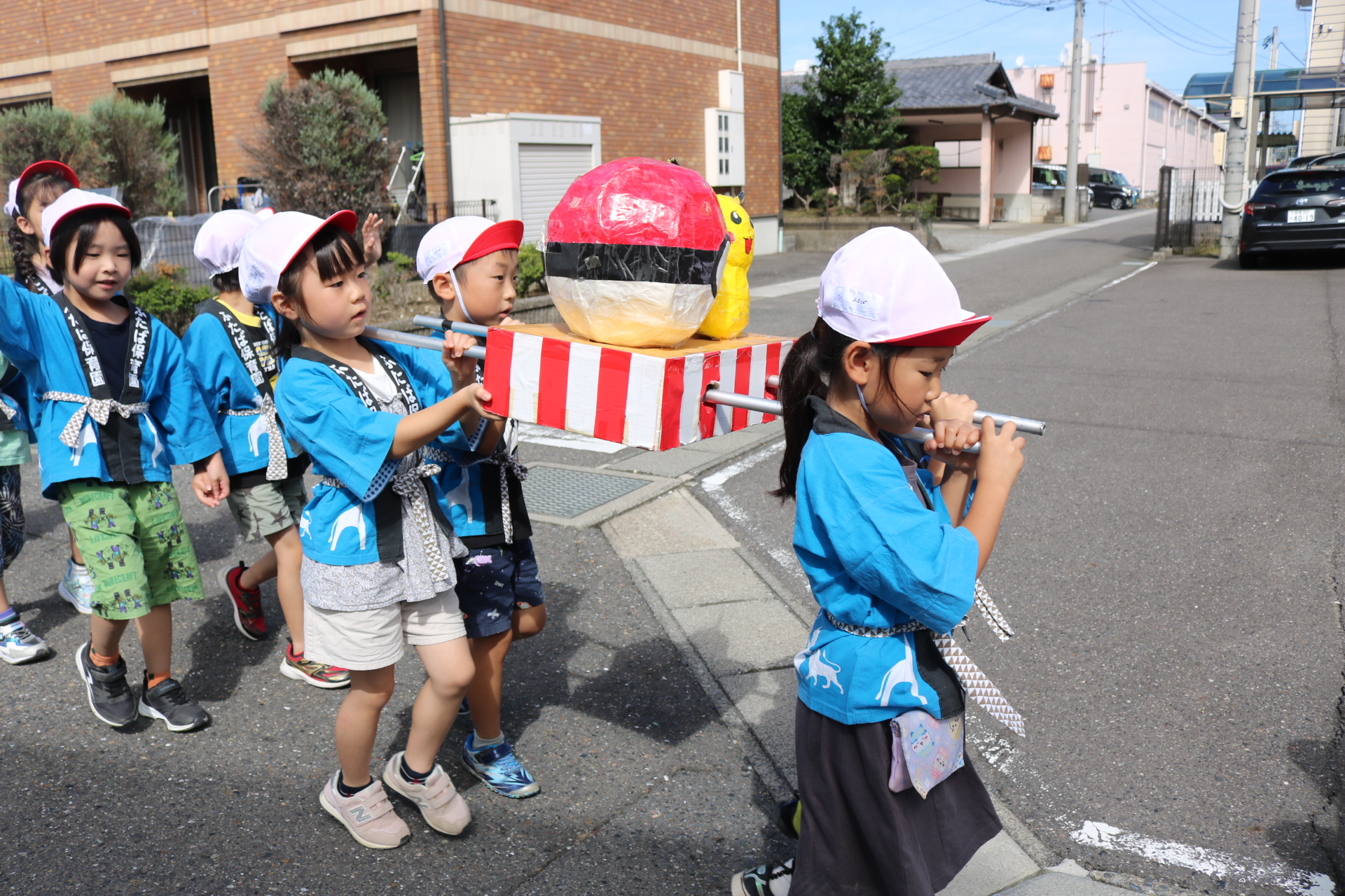 お祭りごっこを楽しんだ子どもたち。お神輿を担いで、近所を歩いてまわりましたよ😊
