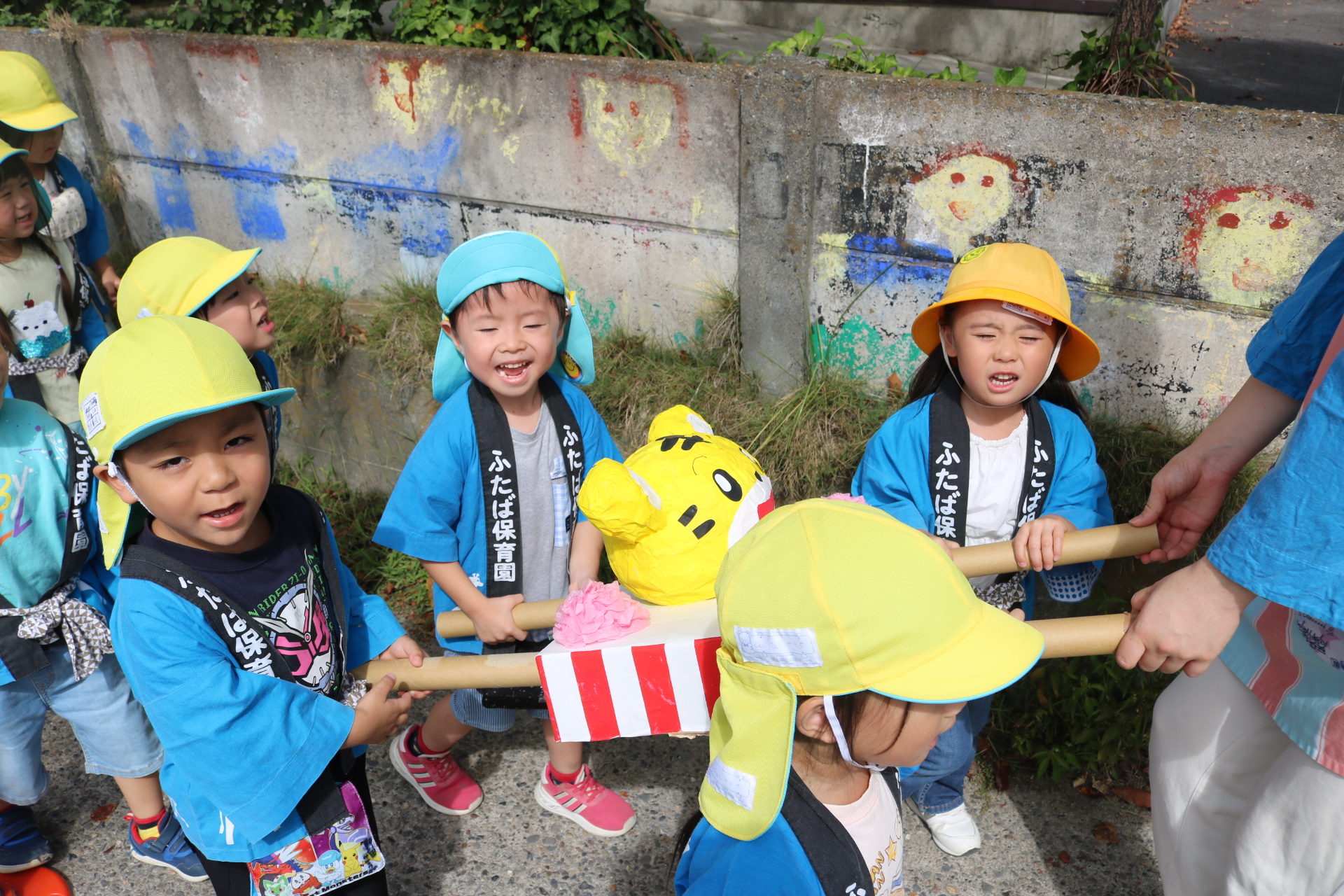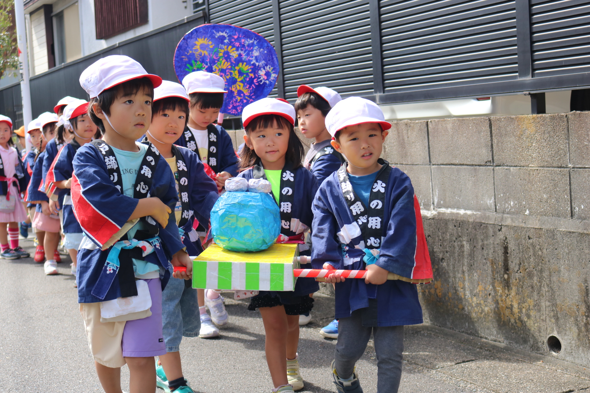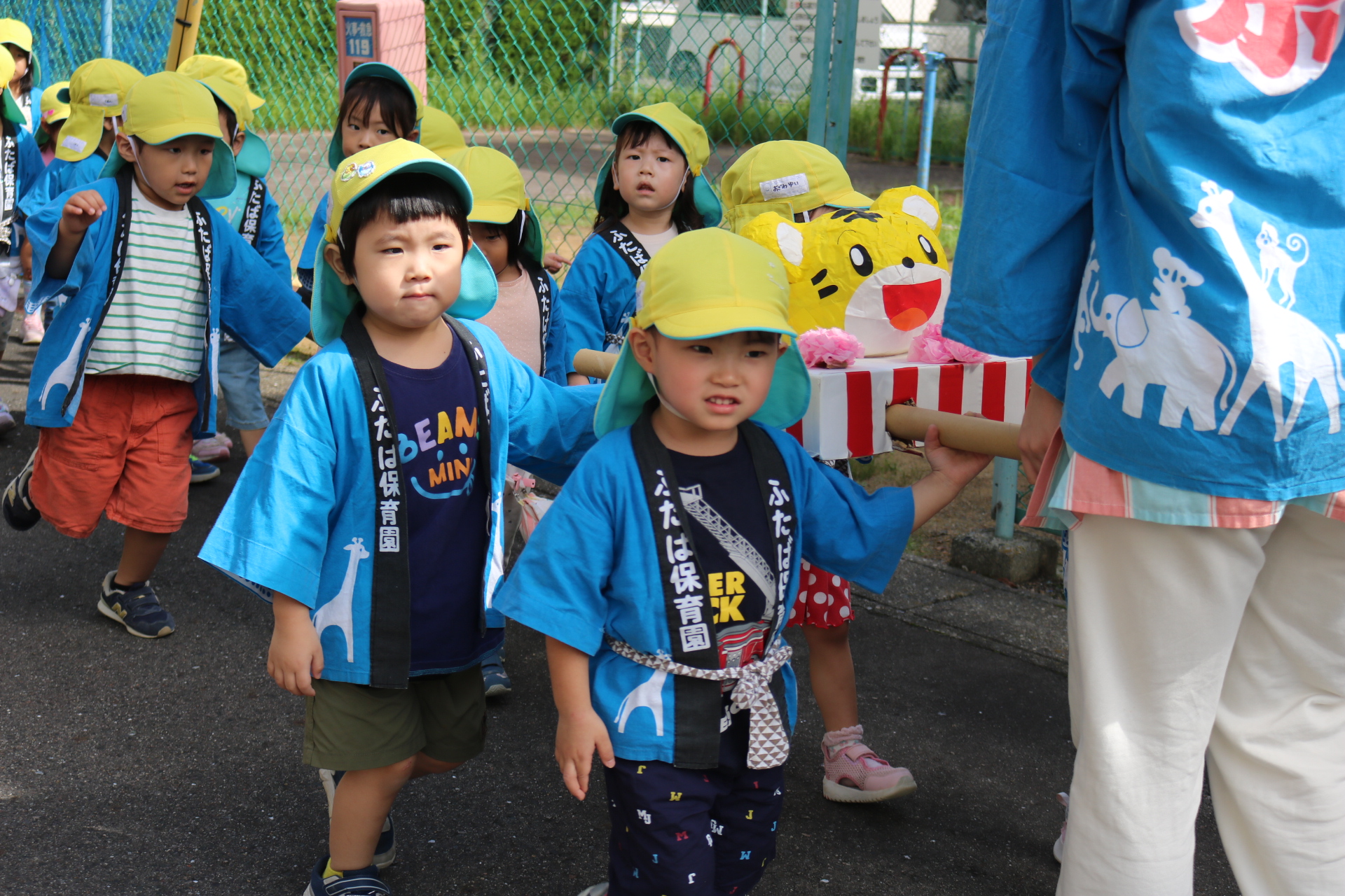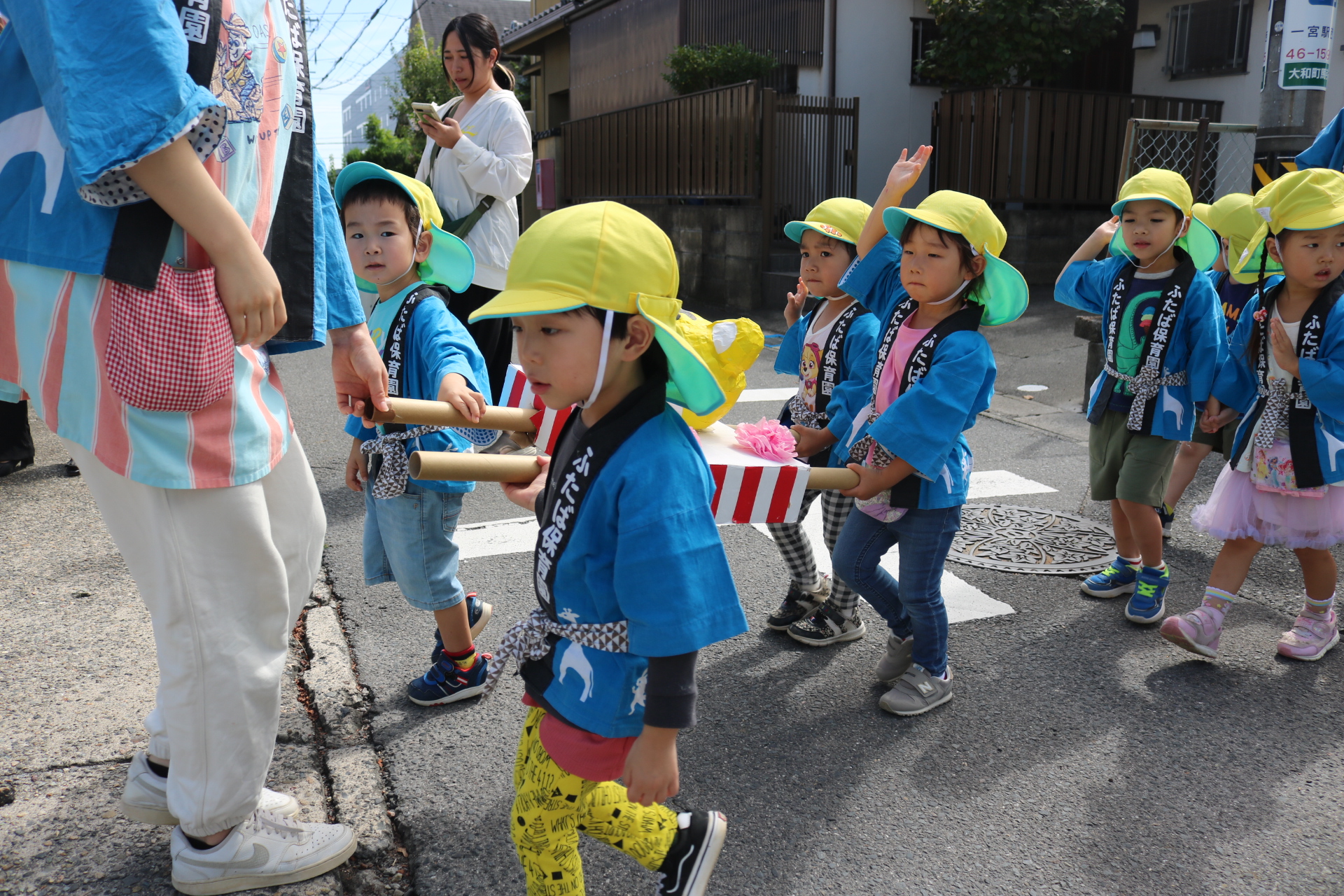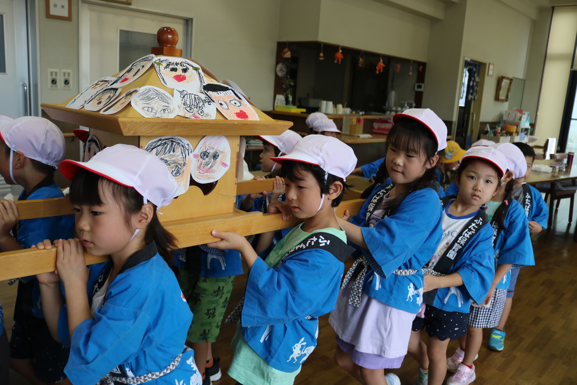 お祭りごっこを楽しんだ子どもたち。お神輿を担いで、近所を歩いてまわりましたよ😊