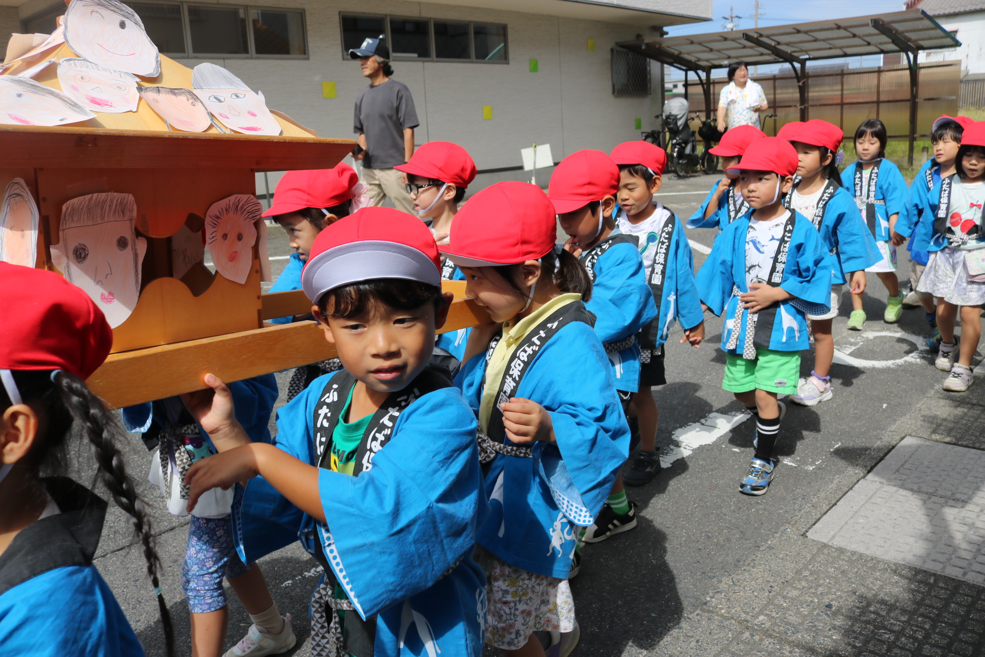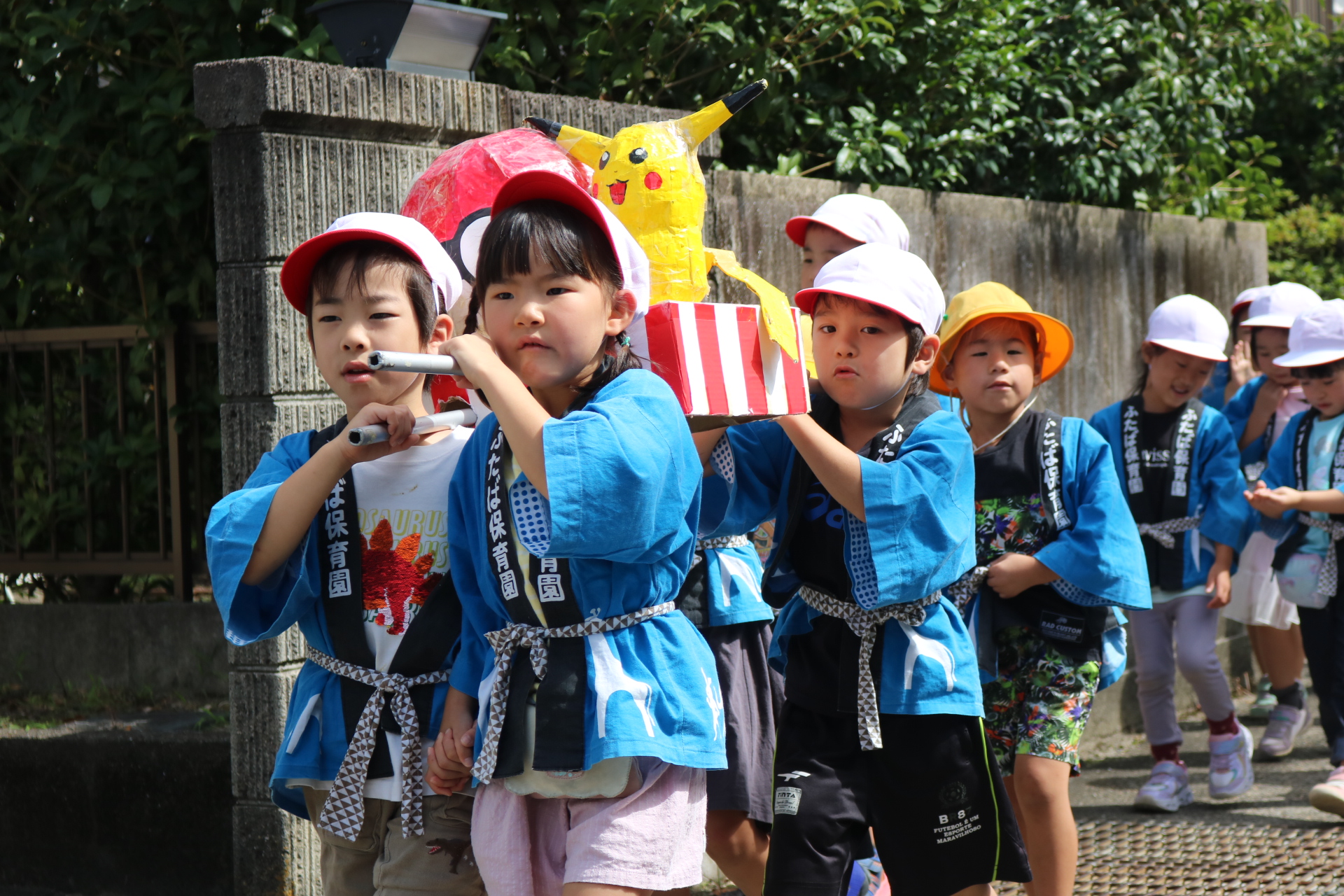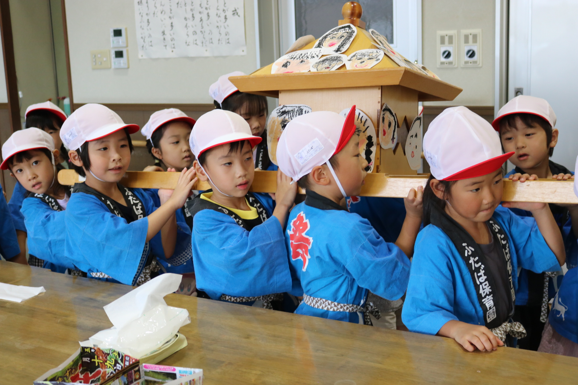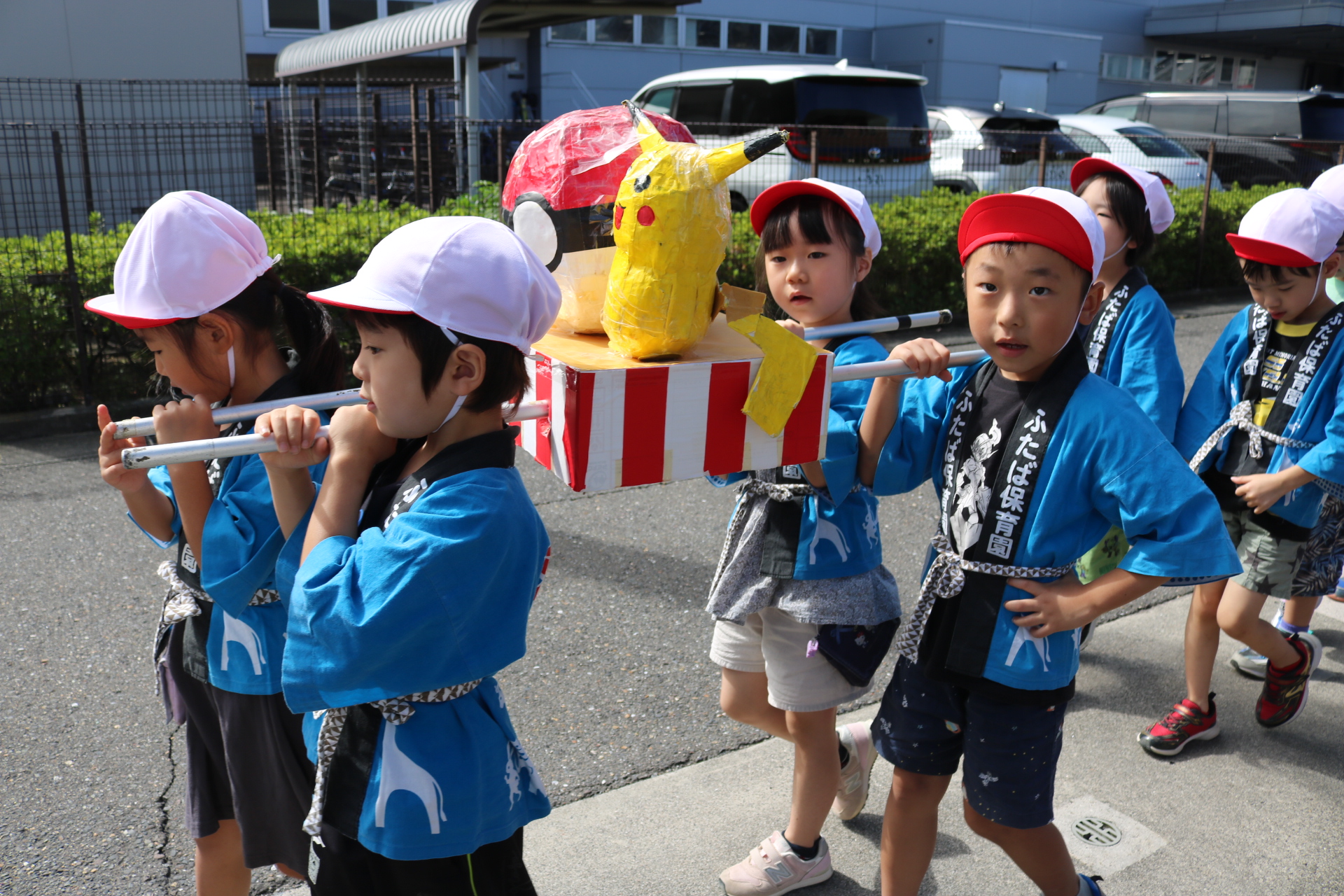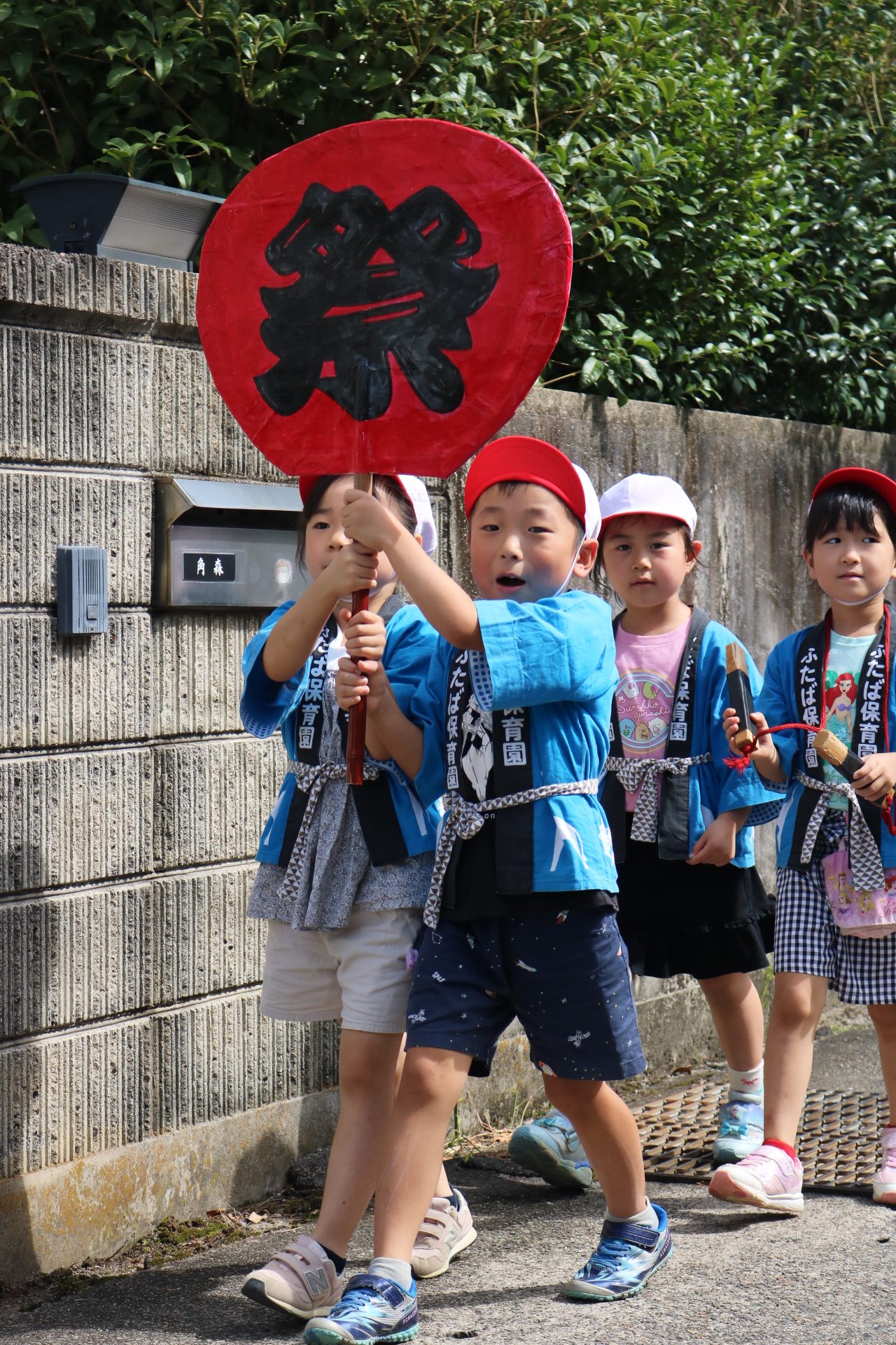 お祭りごっこを楽しんだ子どもたち。お神輿を担いで、近所を歩いてまわりましたよ😊
