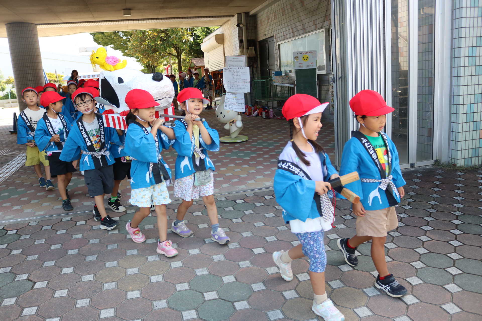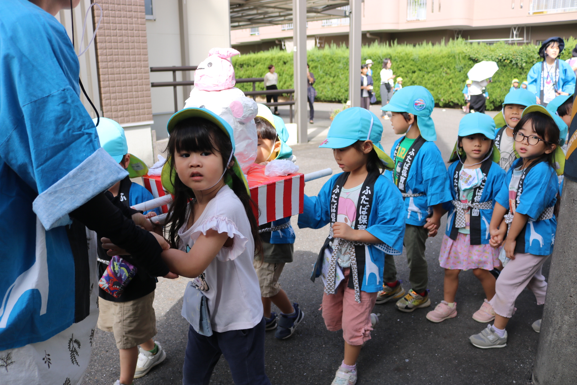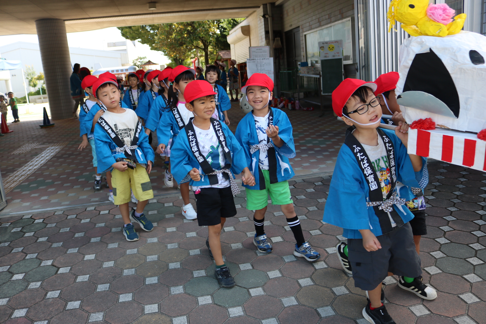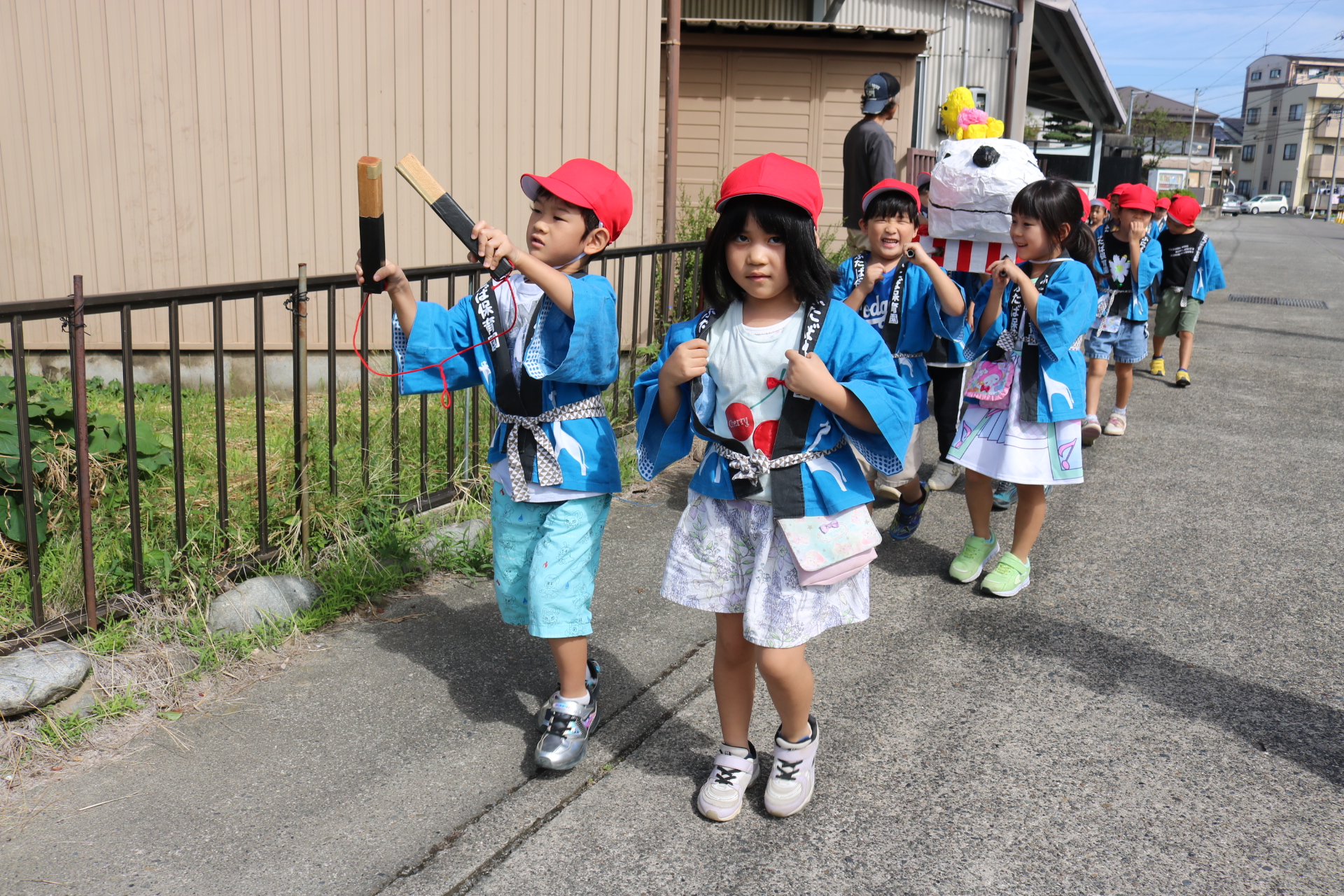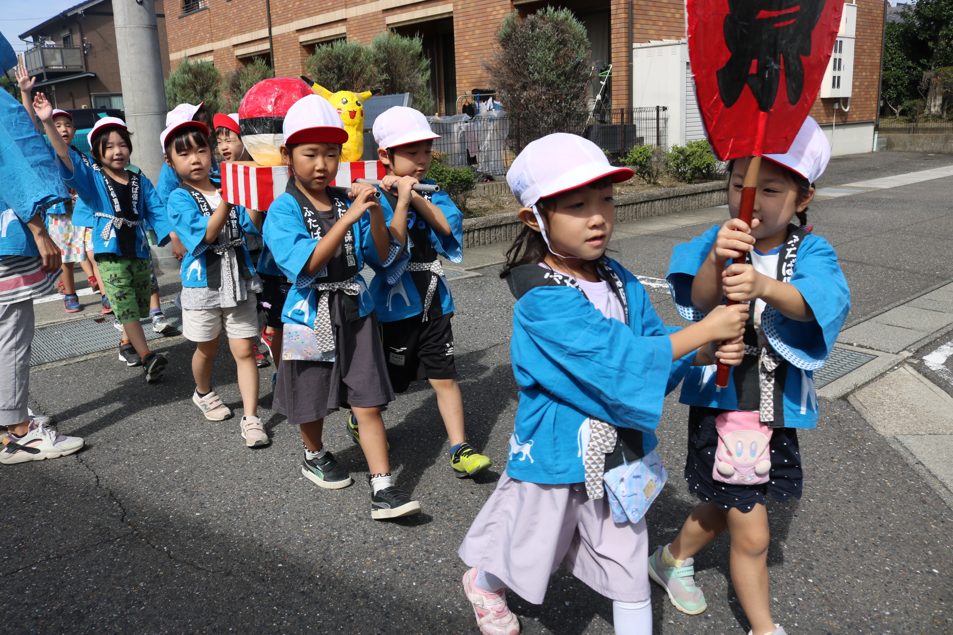 お祭りごっこを楽しんだ子どもたち。お神輿を担いで、近所を歩いてまわりましたよ😊